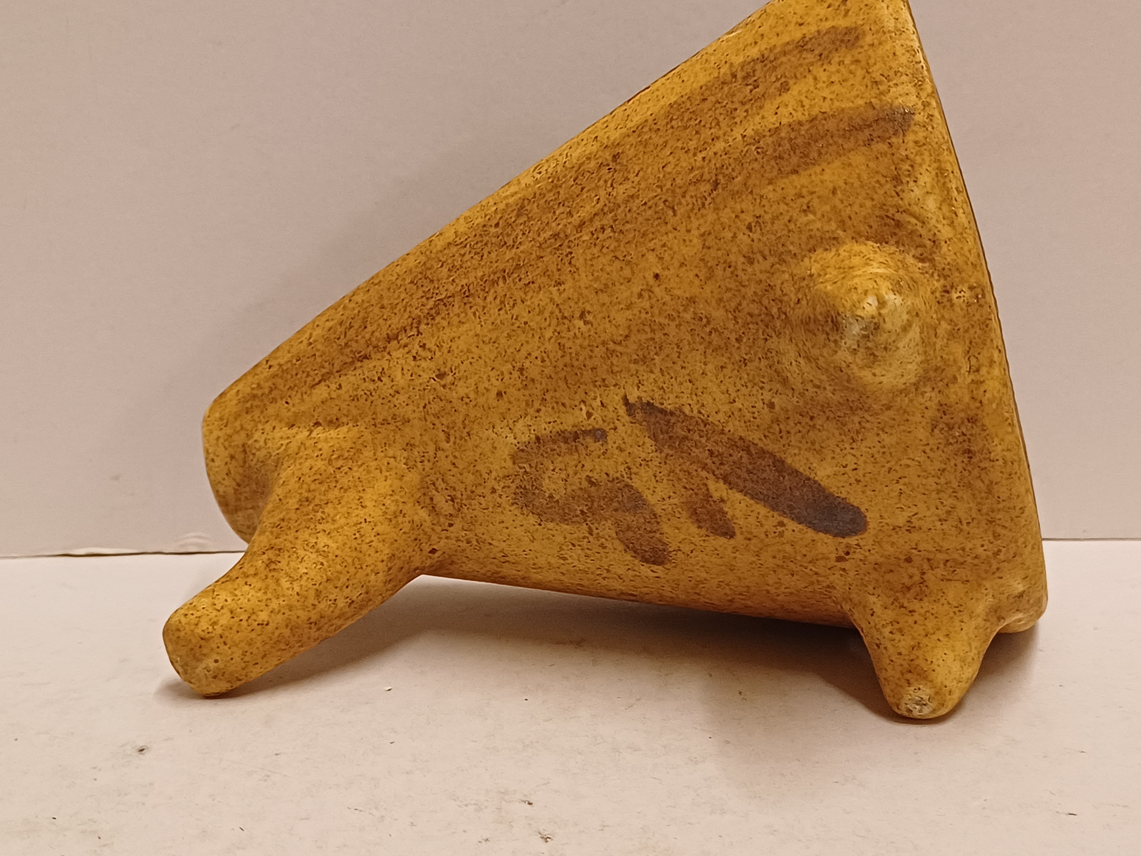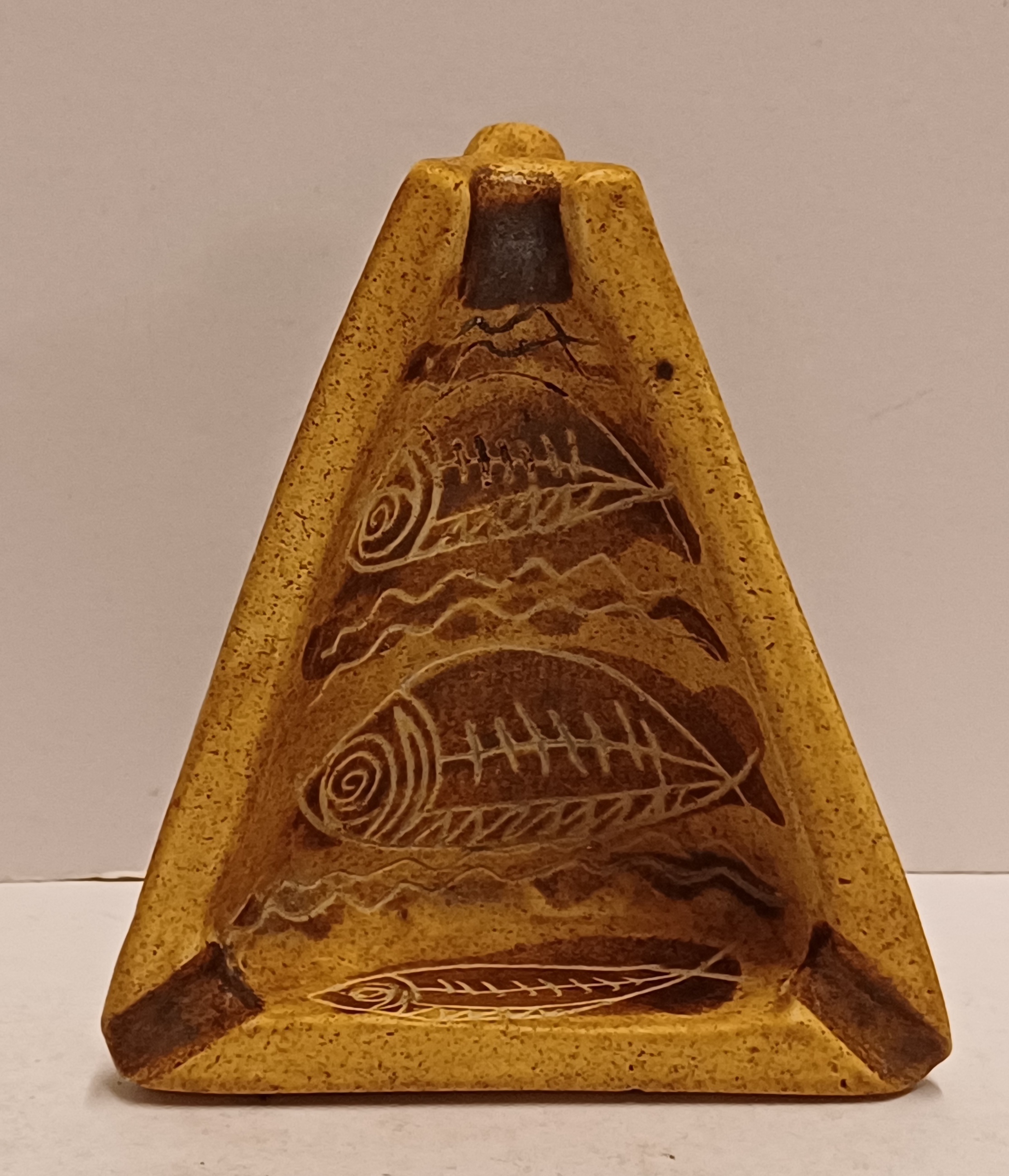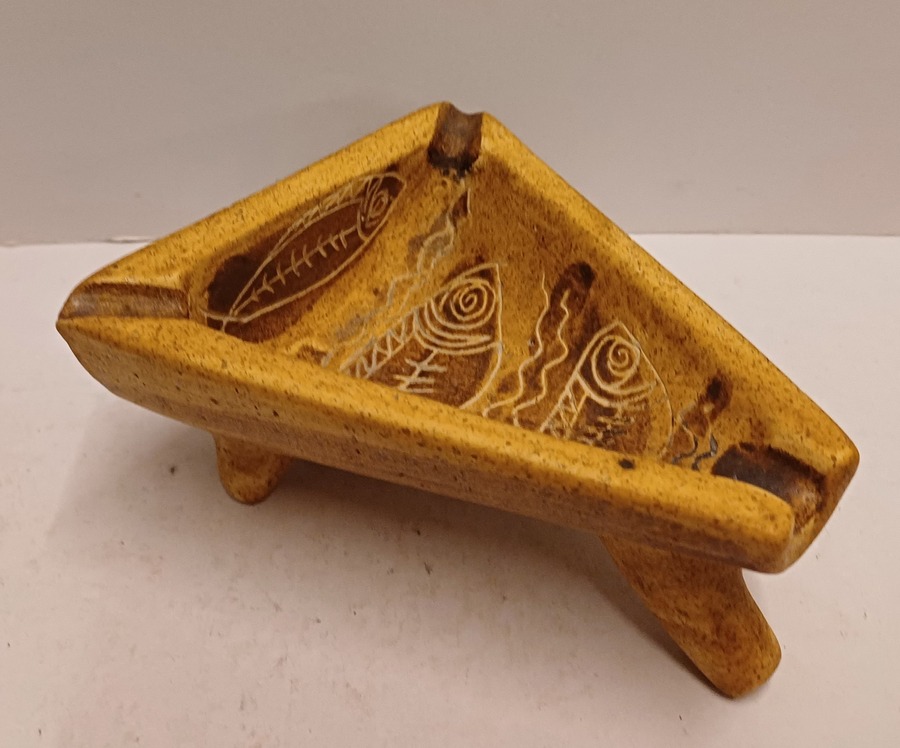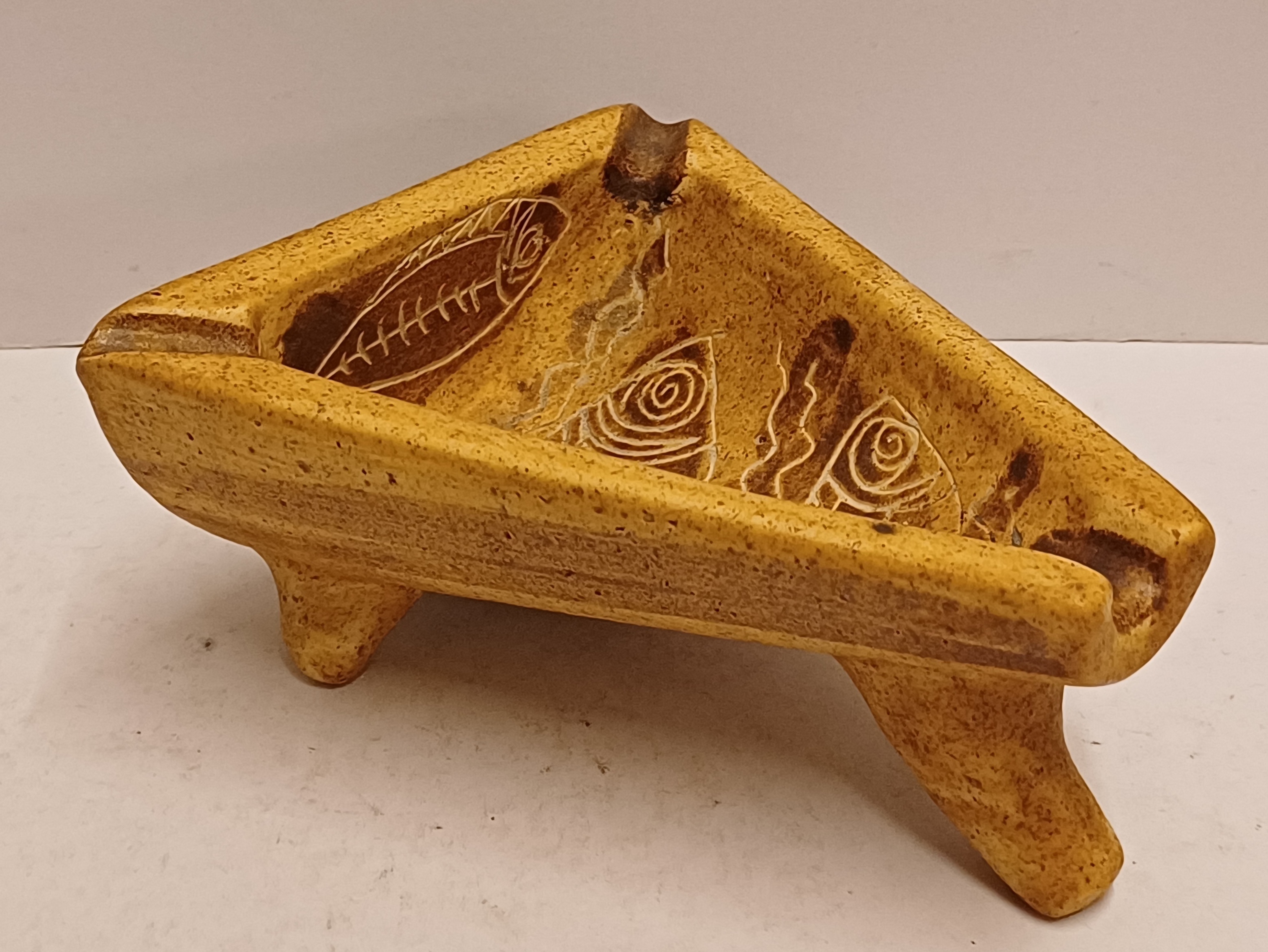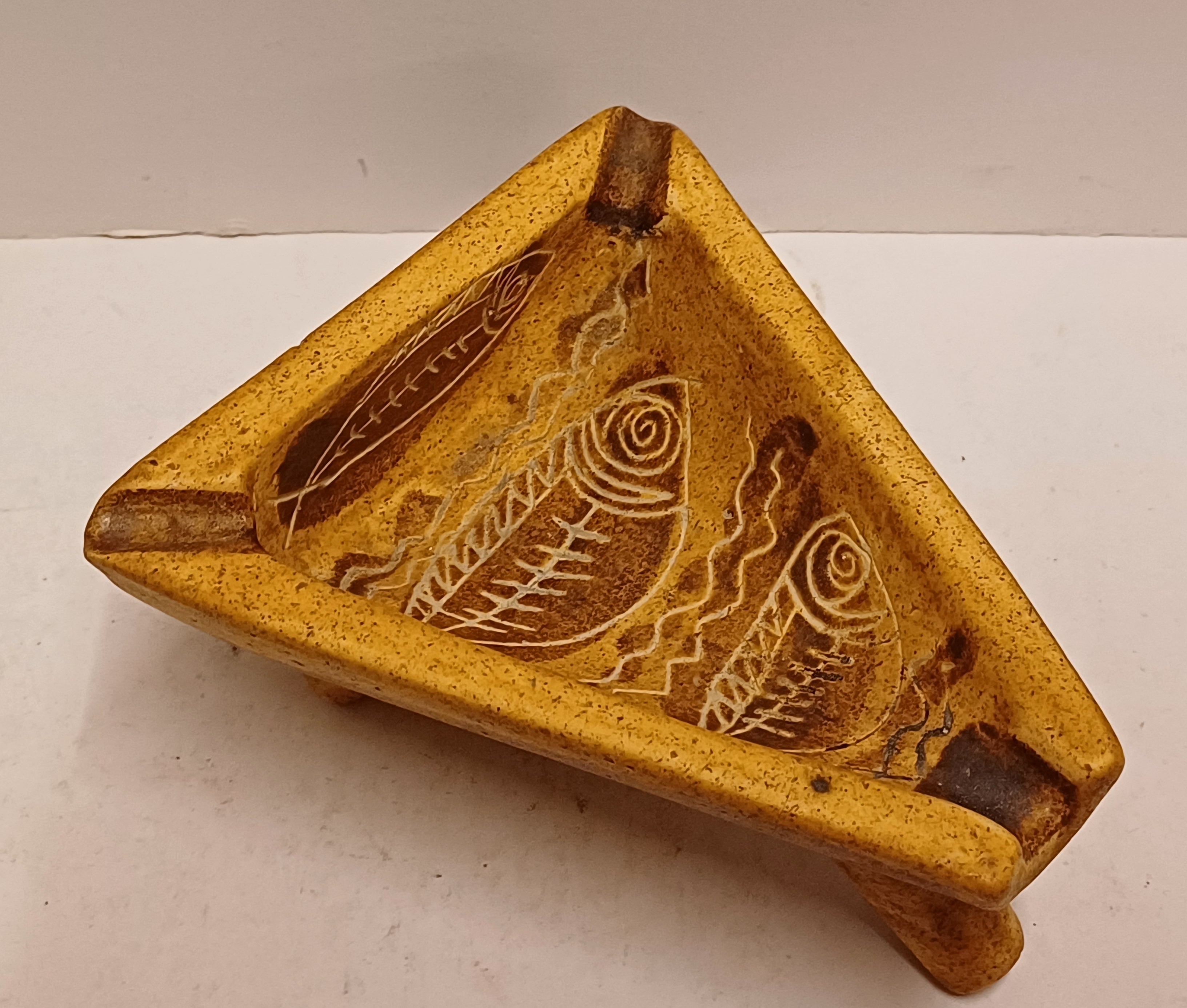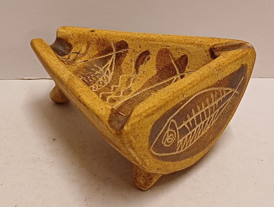Keramischer Aschenbecher auf drei Füßchen stehend mit Fischdekoration. Unterseite signiert.