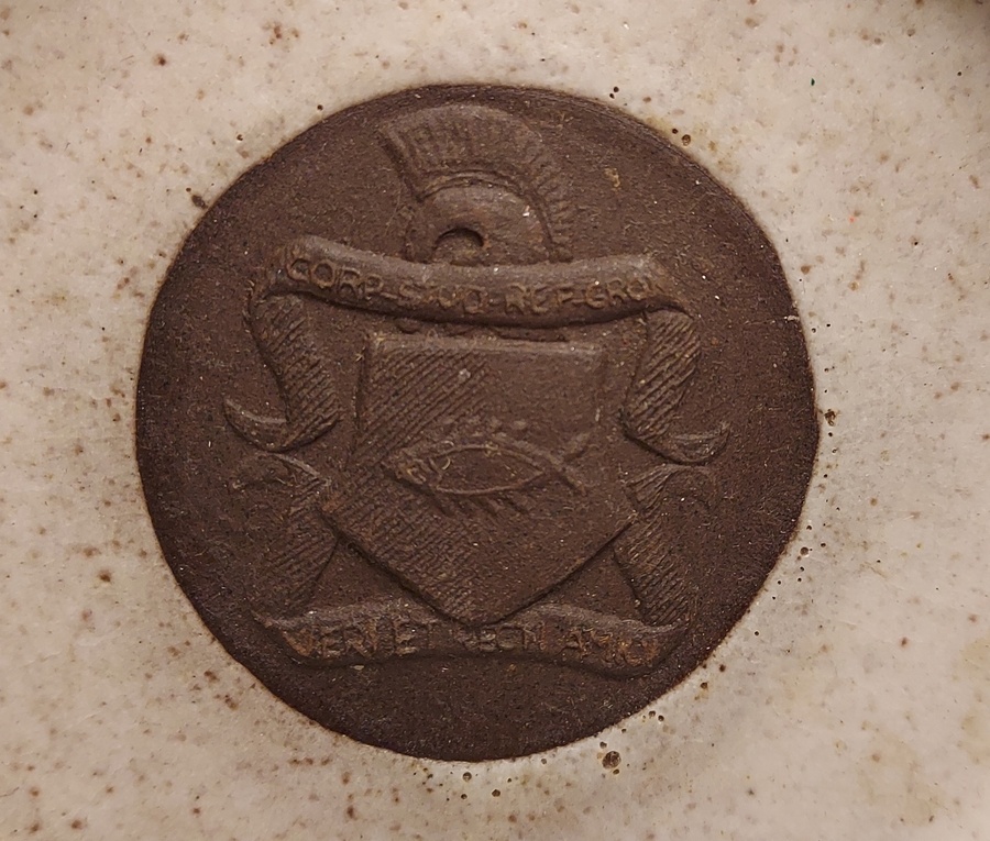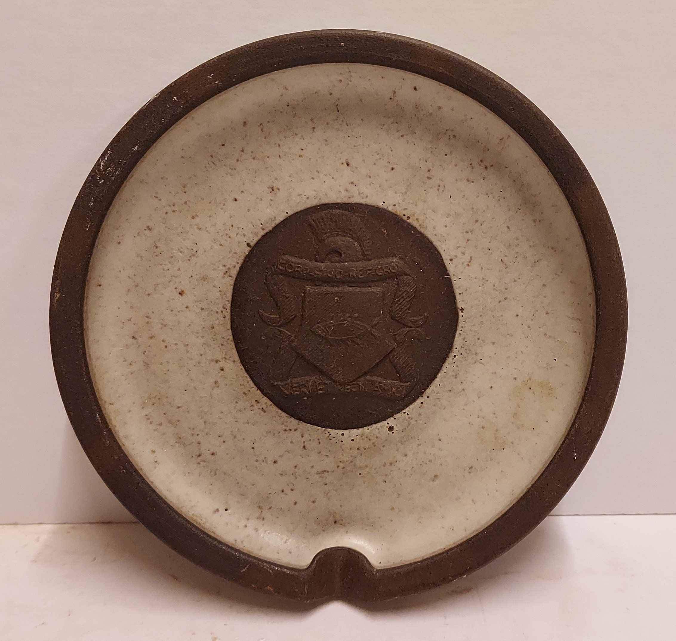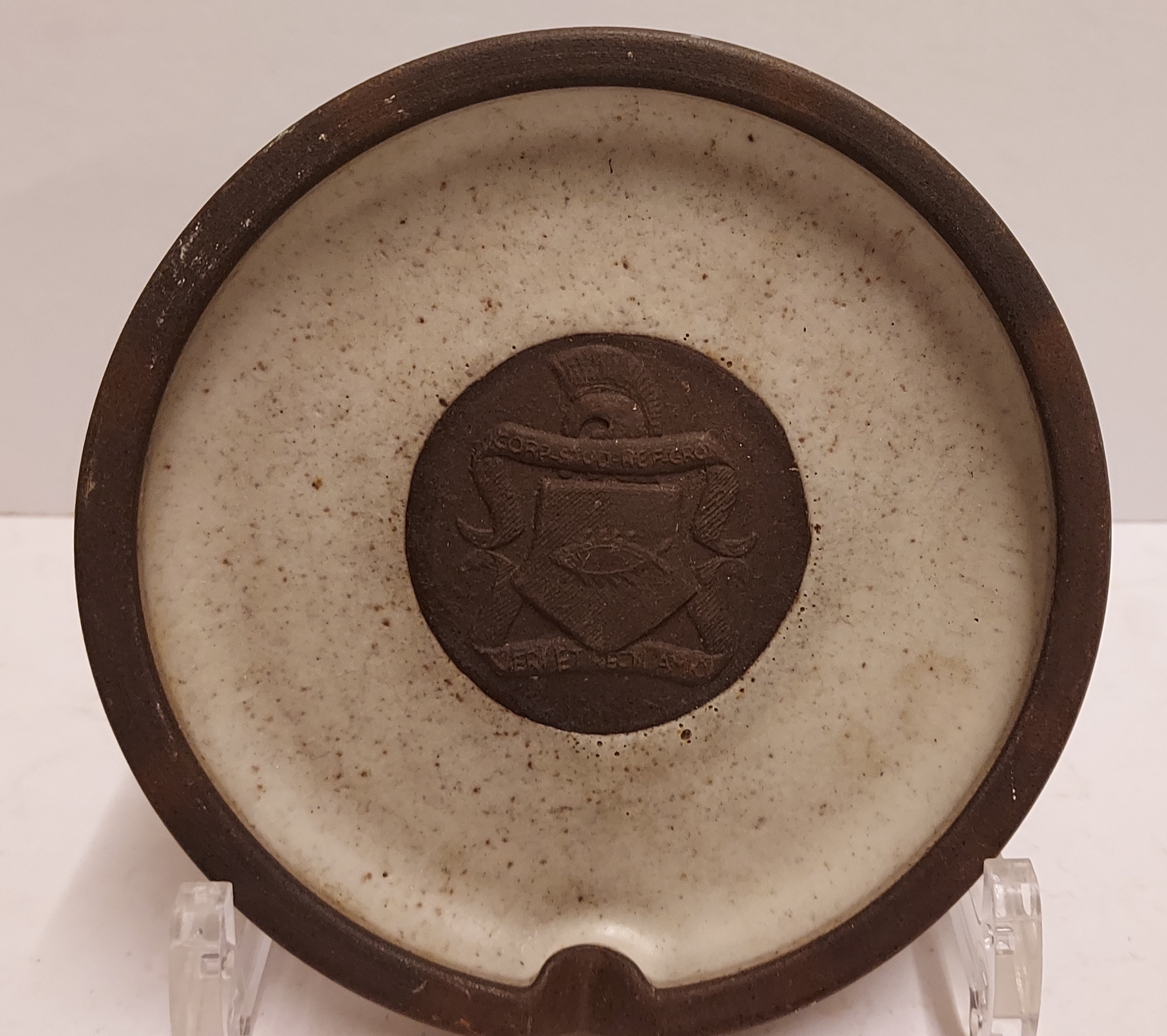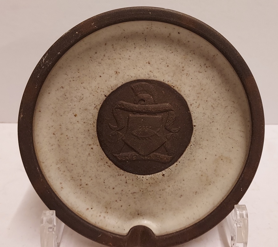Grau glasierter Aschenbecher mit in der Mitte dem Wappenschild der Groninger Studentenverbindung Vera. Rückseite signiert Potterie Holman (19)60-3241.