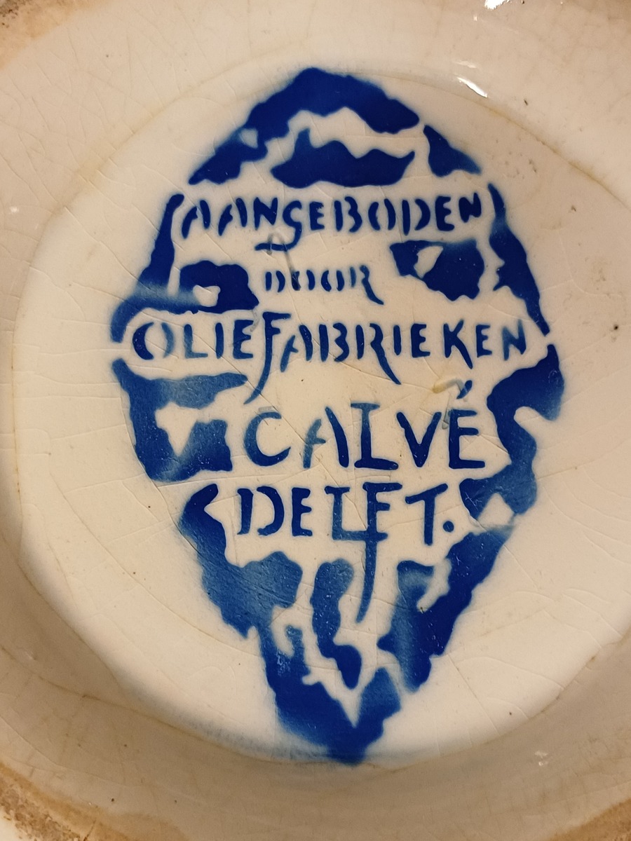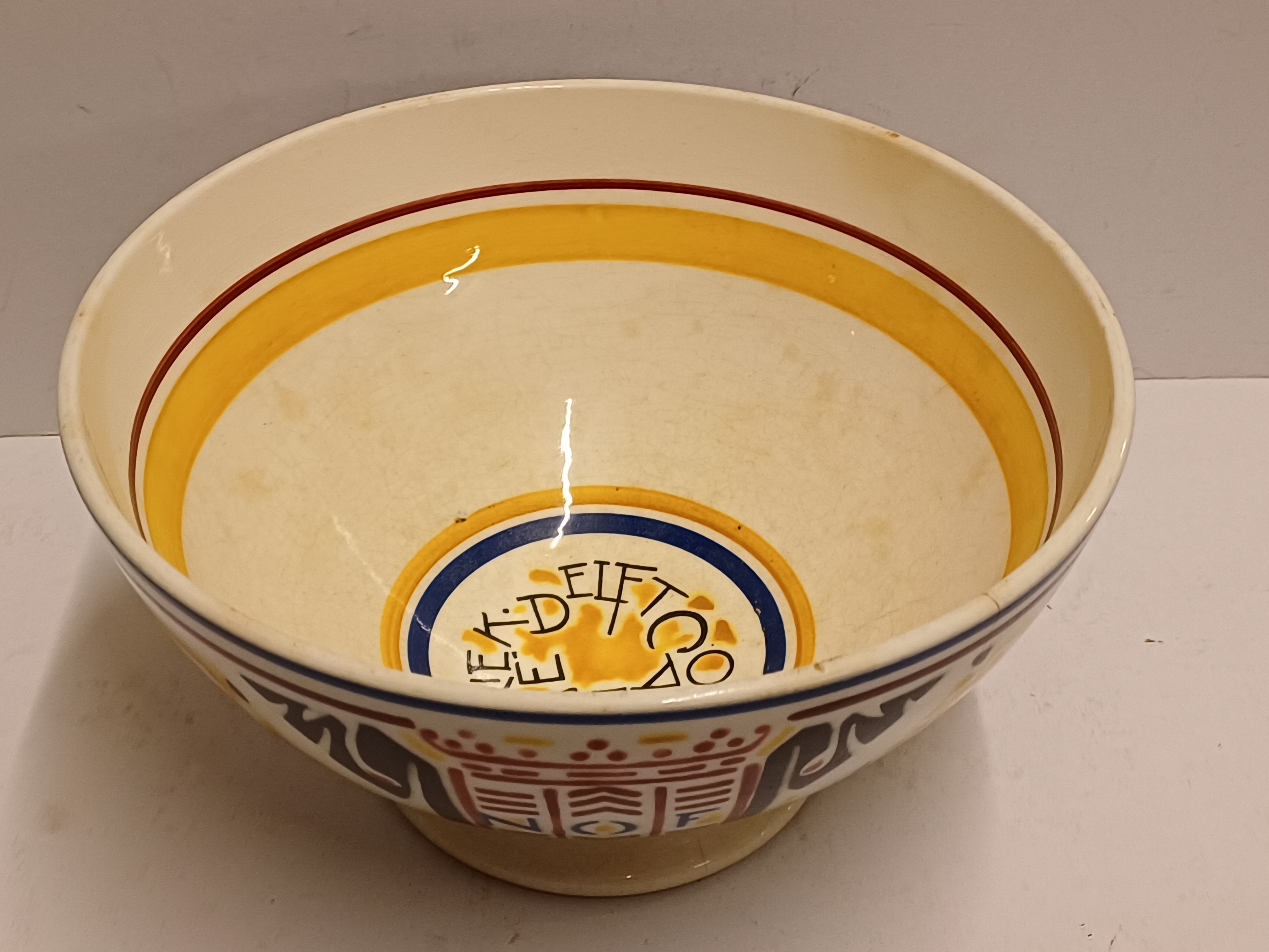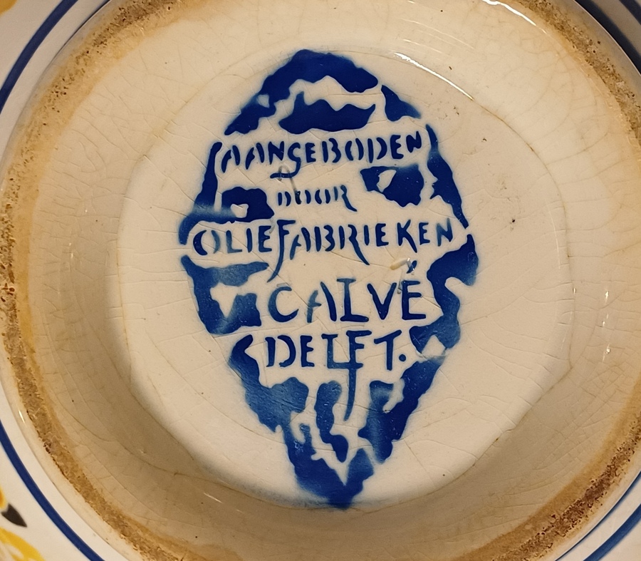 Steingut Rührschüssel mit polychromem schabloniertem Dekor, nach dem Entwurf von Adriaan Roland Holst. Hergestellt im Auftrag für die NOF (Nederlandse Olie Fabriek Calvé te Delft). Unterseite mit speziell entworfenem Markenzeichen.