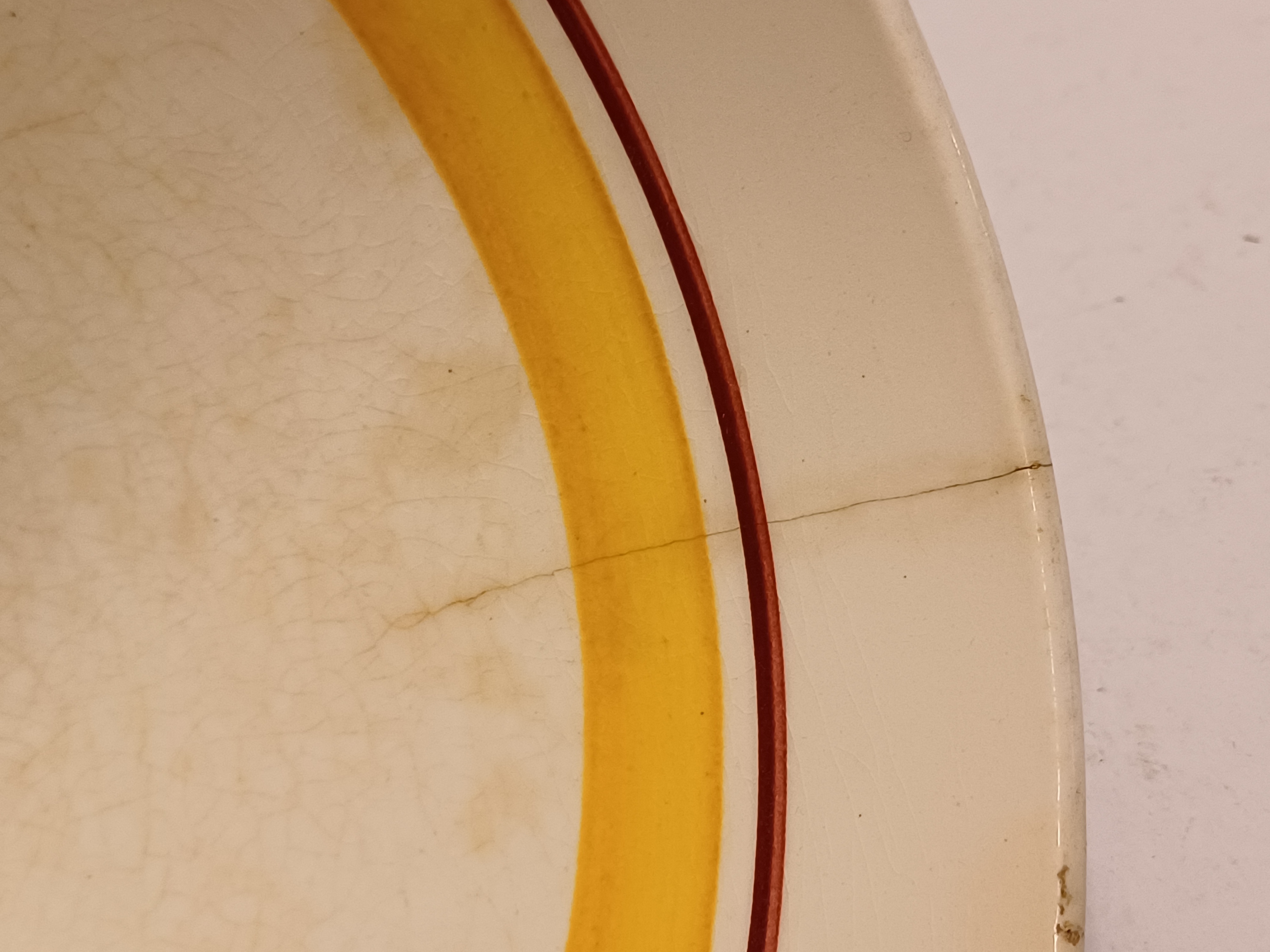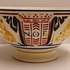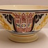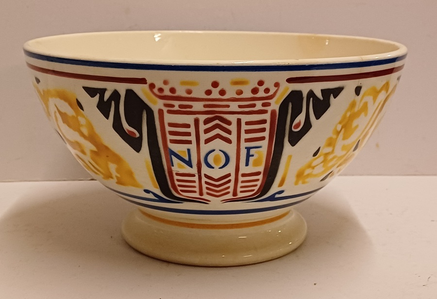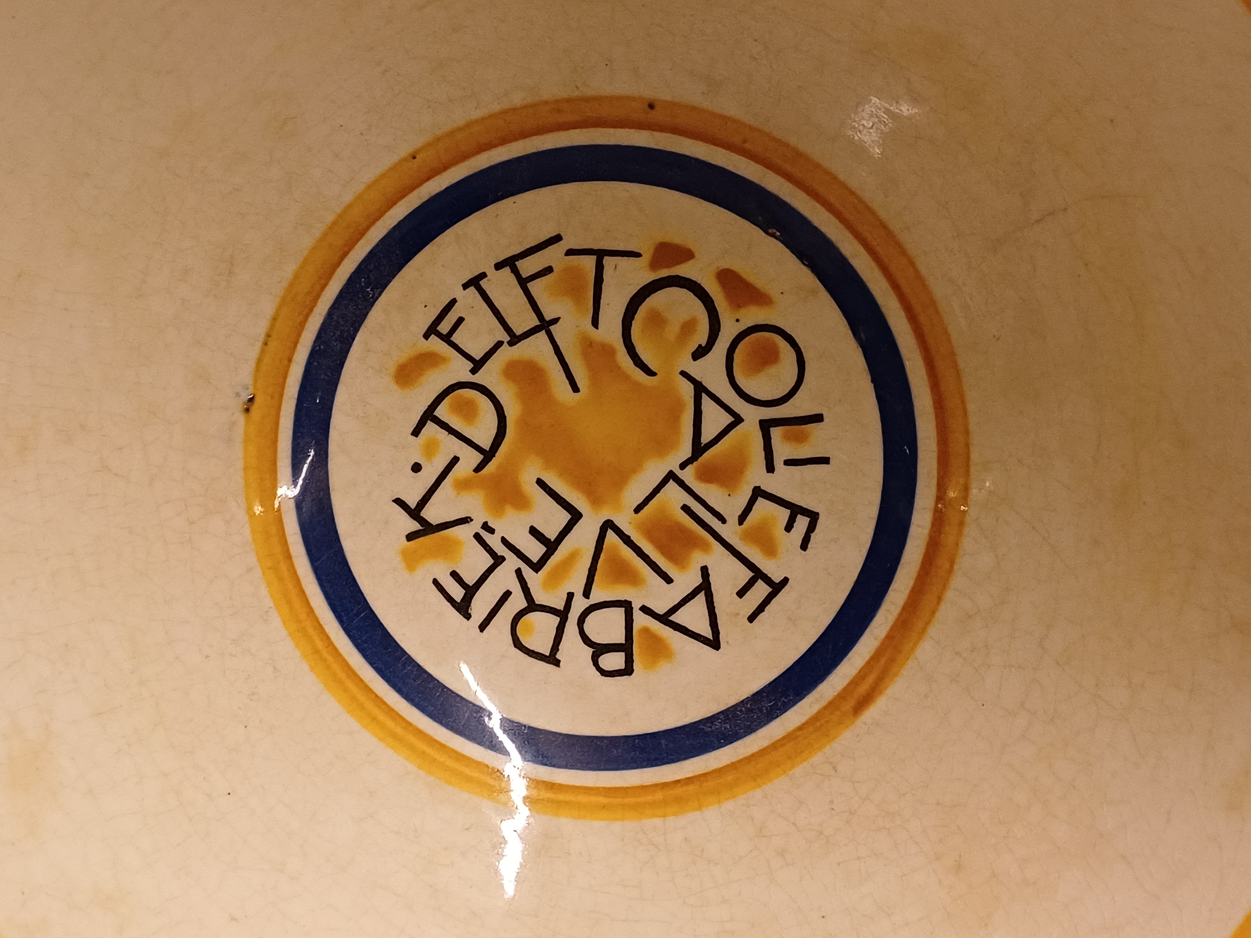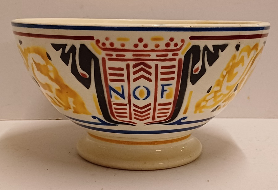 Steingut Rührschüssel mit polychromem schabloniertem Dekor, nach dem Entwurf von Adriaan Roland Holst. Hergestellt im Auftrag für die NOF (Nederlandse Olie Fabriek Calvé te Delft). Unterseite mit speziell entworfenem Markenzeichen.