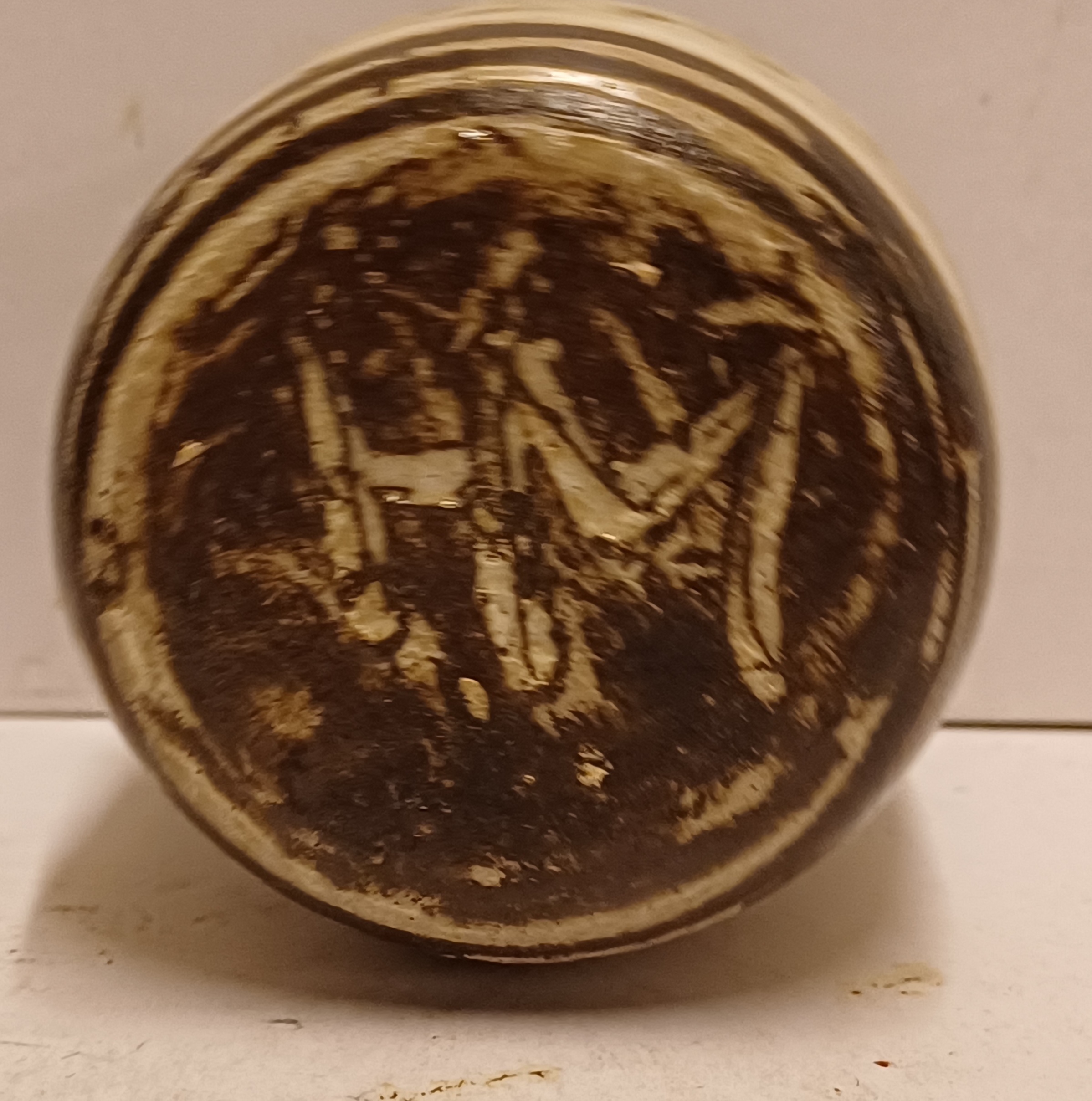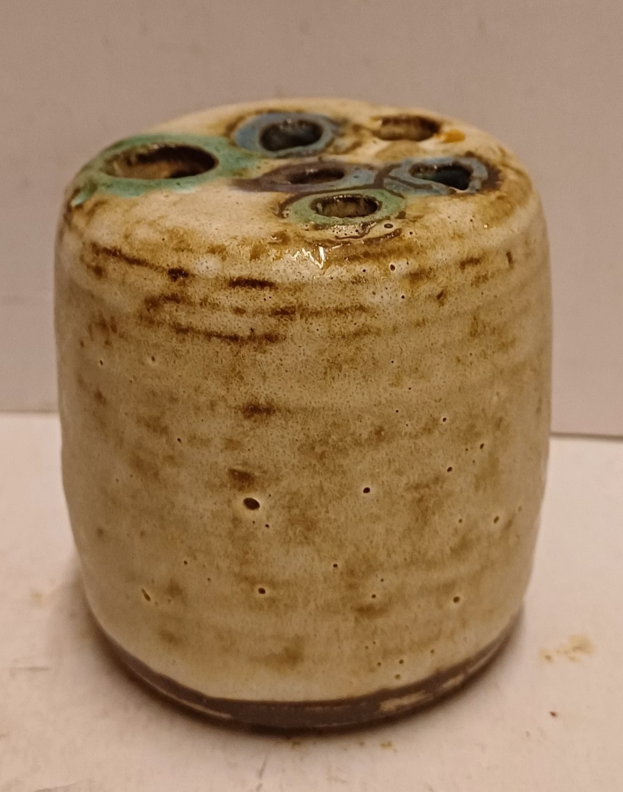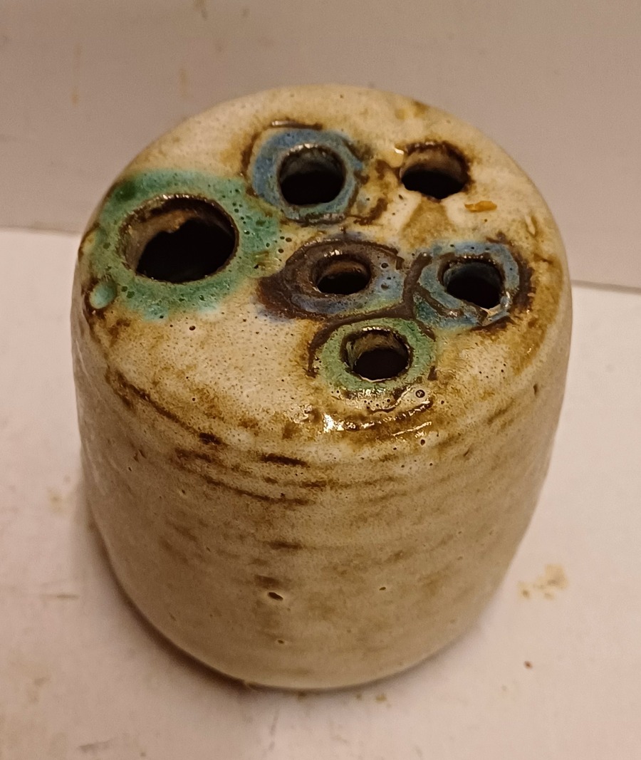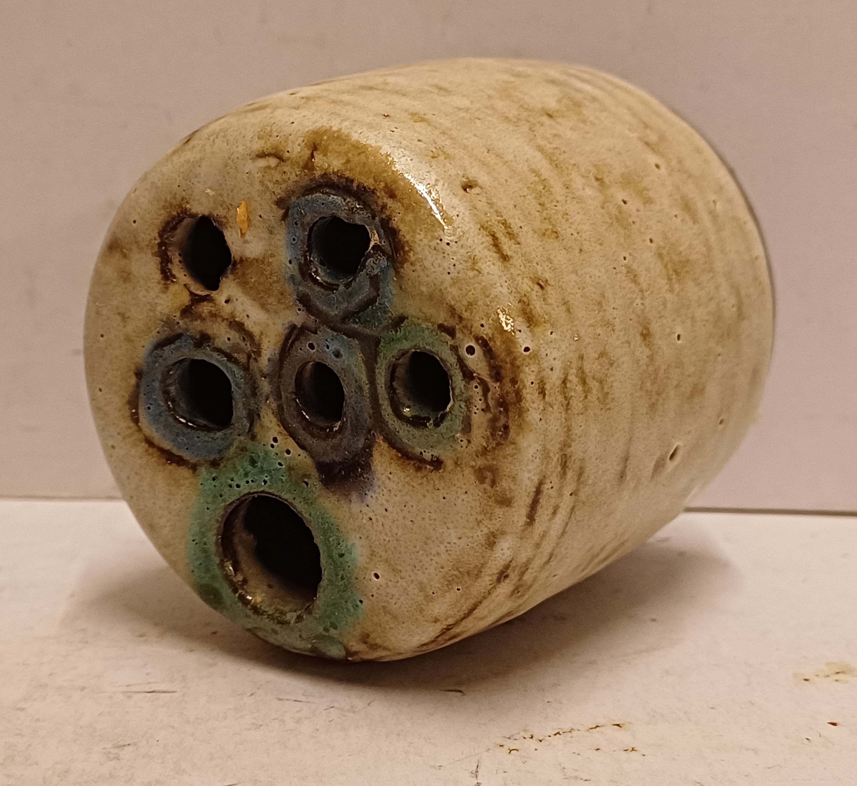 Aardewerken cilindrische kleine bloemensteker. Onderzijde gemerkt.
