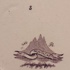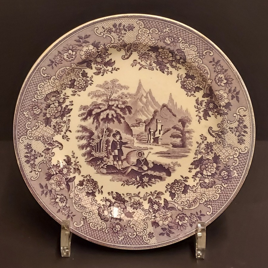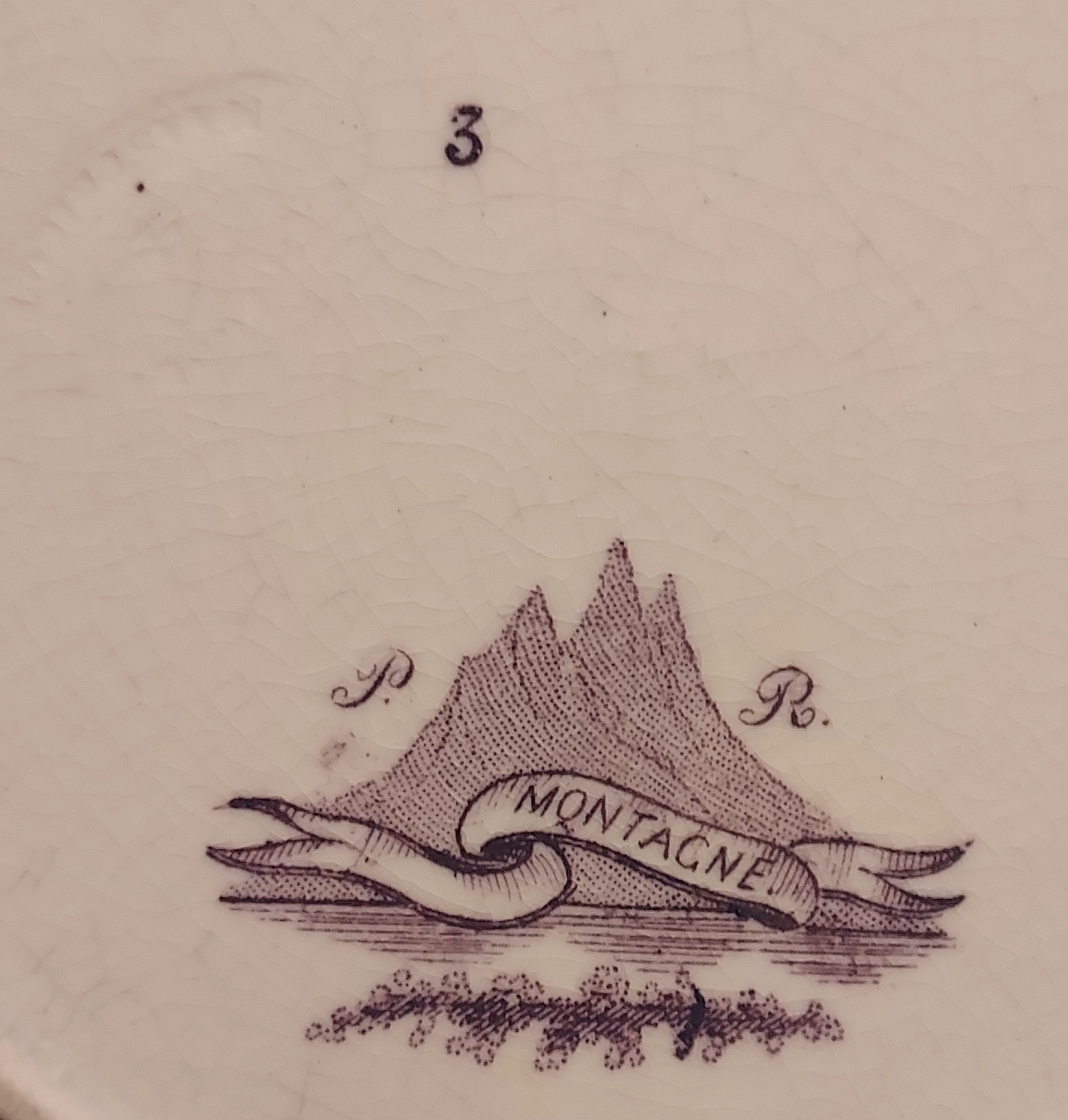 Monochromes lila Dekor von Landschaft mit Figuren. Rückseite mit speziell entworfenem Fabrikmarkenzeichen in Form eines Berges mit Girlande, Dekornamen und dem Buchstaben PR.