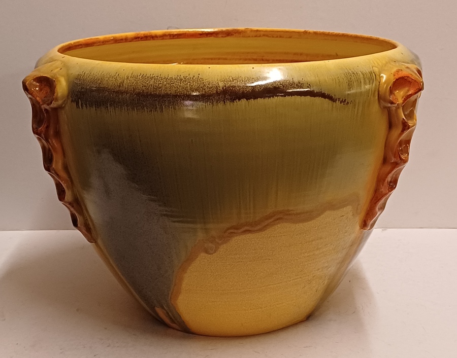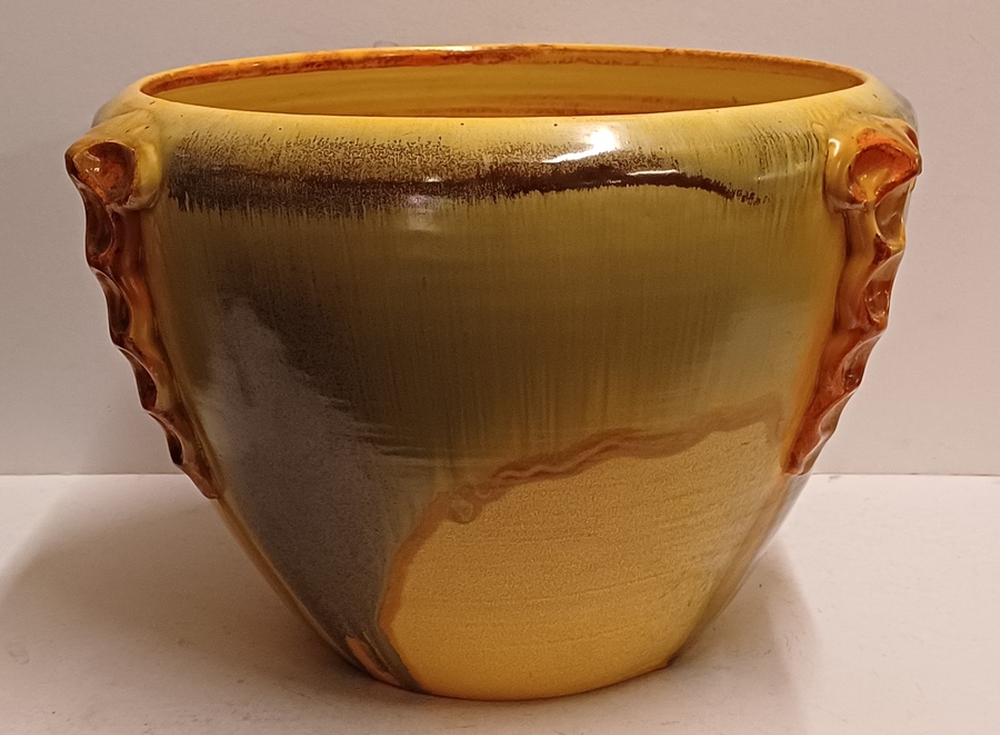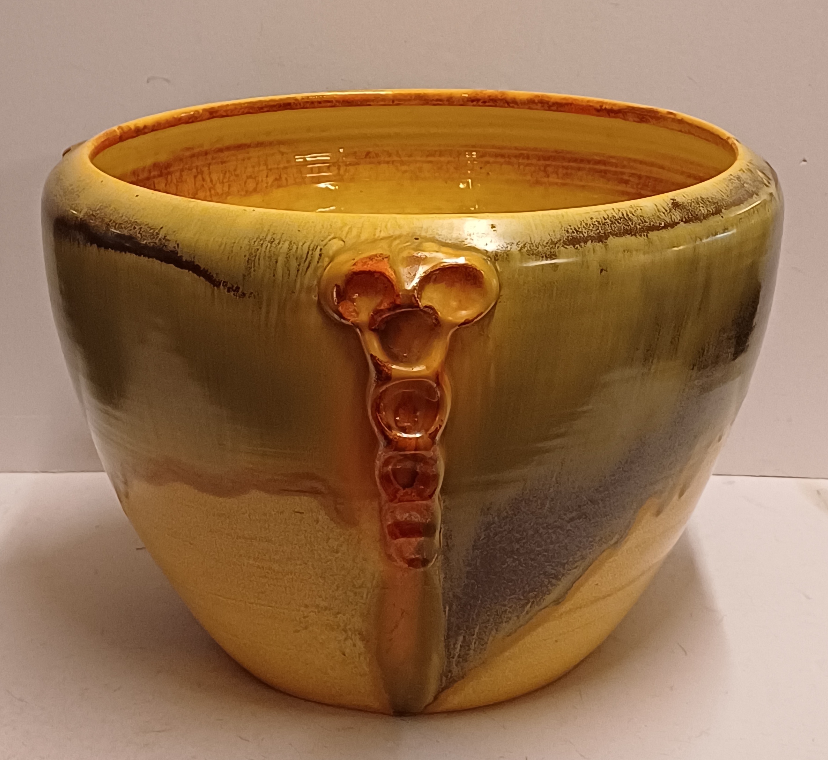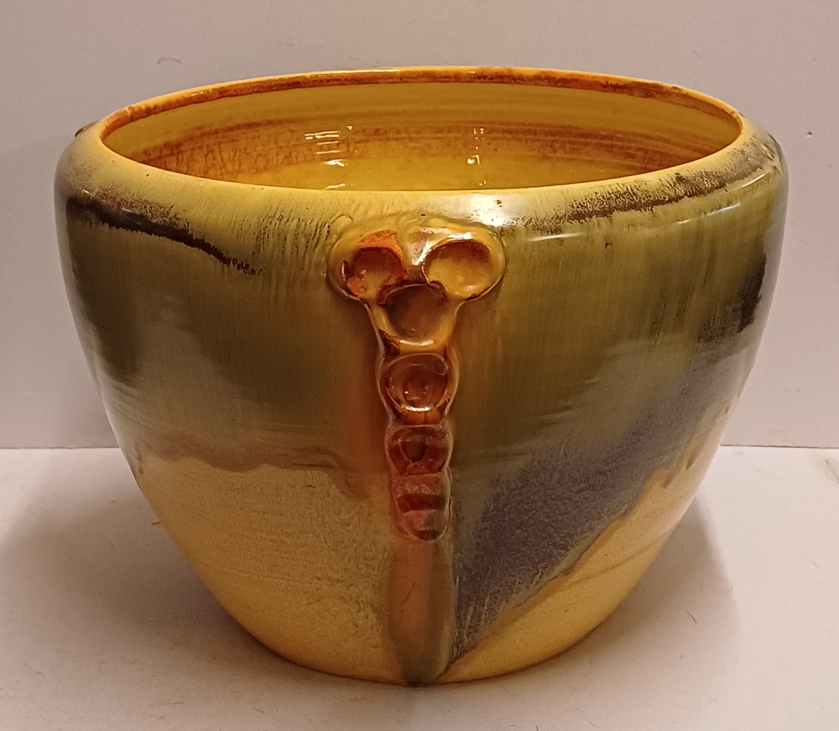 Steingut Cache-Pot aus der Art-Deco-Serie von Mobach. Der Topf hat an drei Seiten orangefarbene glasierte Applikationen. Unterseite mit frühem Fabrikzeichen. Entwurf von Klaas Mobach I.