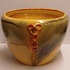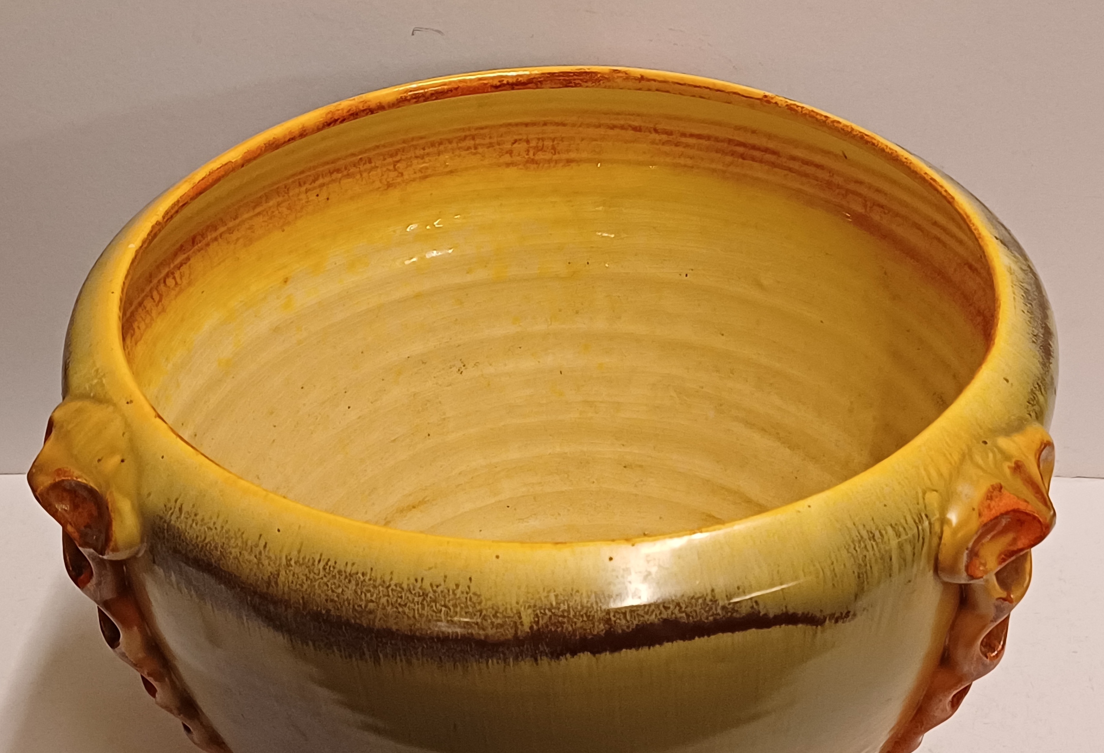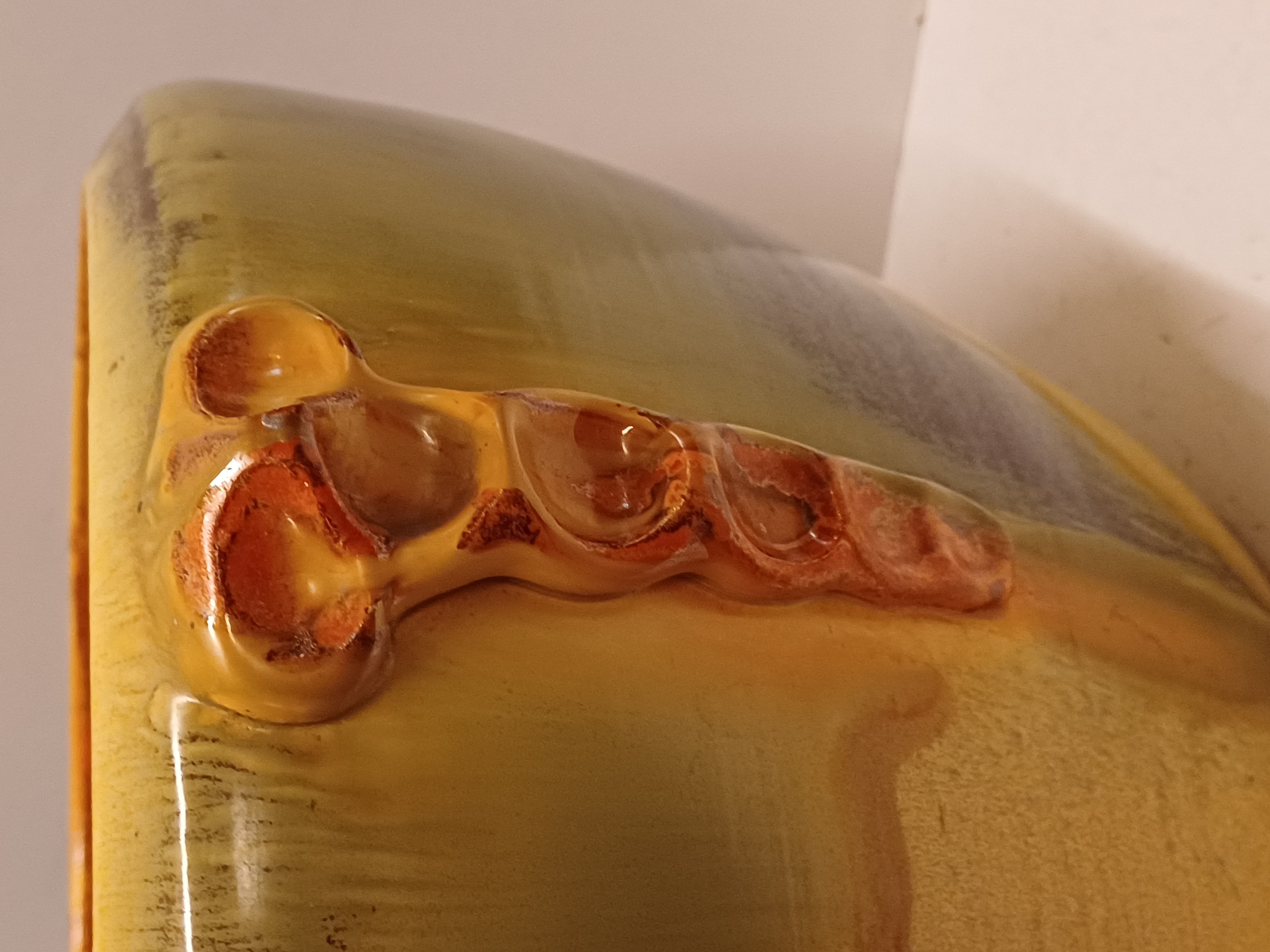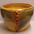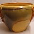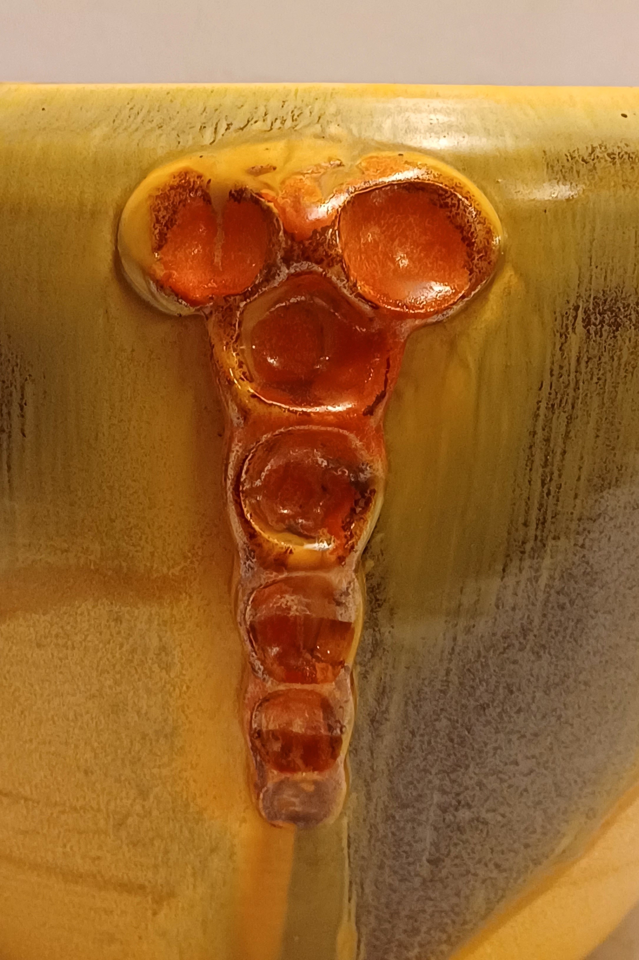 Steingut Cache-Pot aus der Art-Deco-Serie von Mobach. Der Topf hat an drei Seiten orangefarbene glasierte Applikationen. Unterseite mit frühem Fabrikzeichen. Entwurf von Klaas Mobach I.