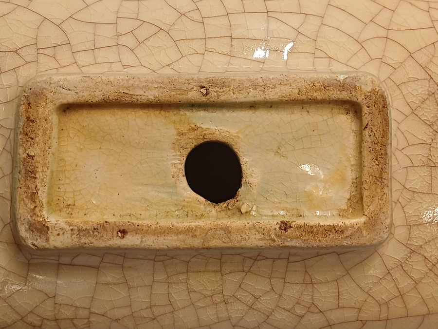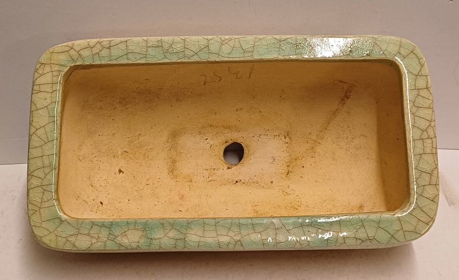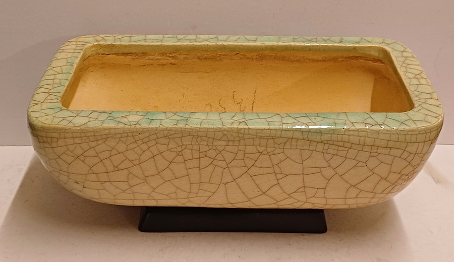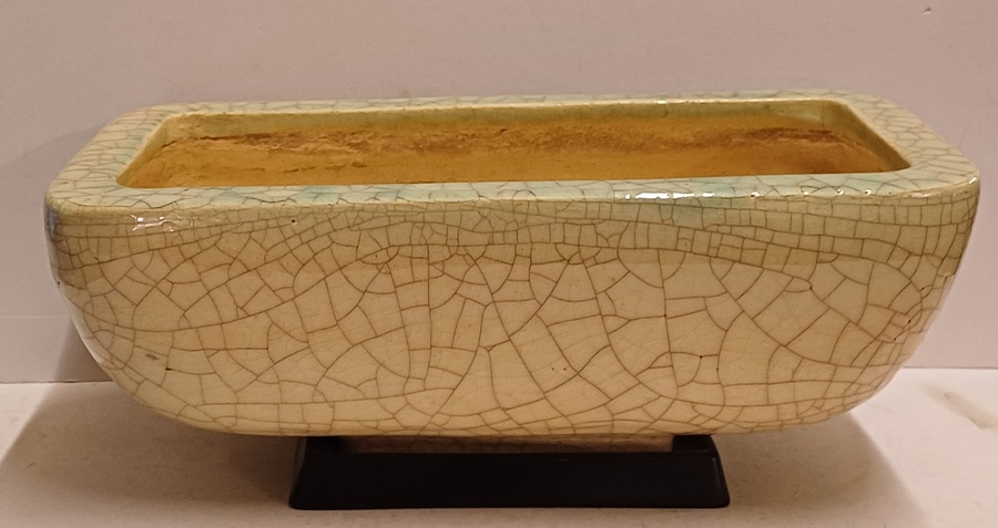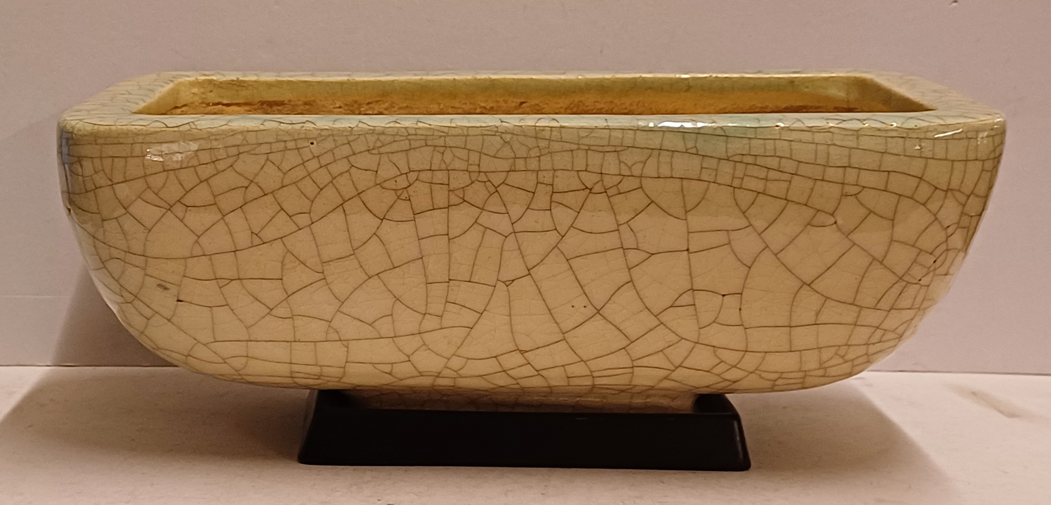 Große gecraqueleerte Kaktusschale mit hellblauer Glasur. Steht auf einem nicht originalen schwarzen keramischen Fußgestell. Nicht signiert.
