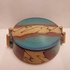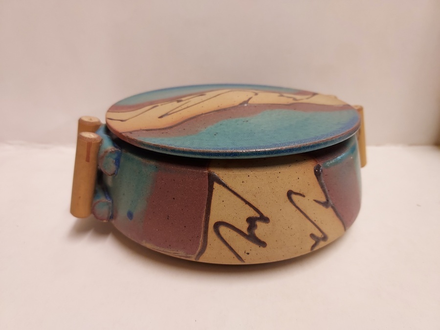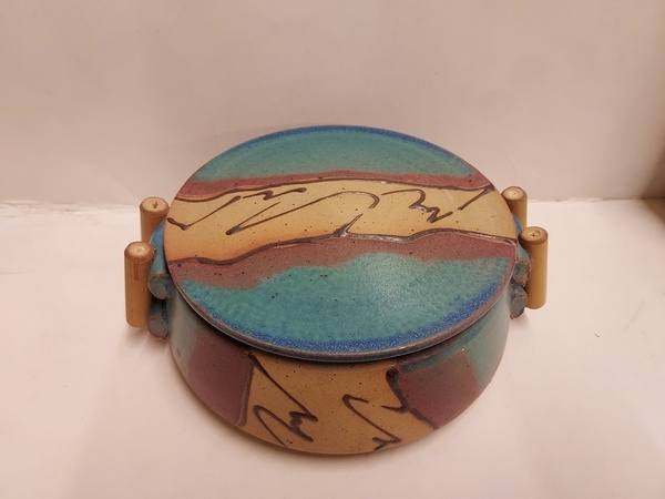 Deckeldose mit mehrfarbiger Dekoration und Bambusgriffen.