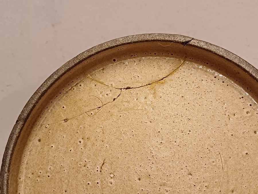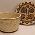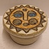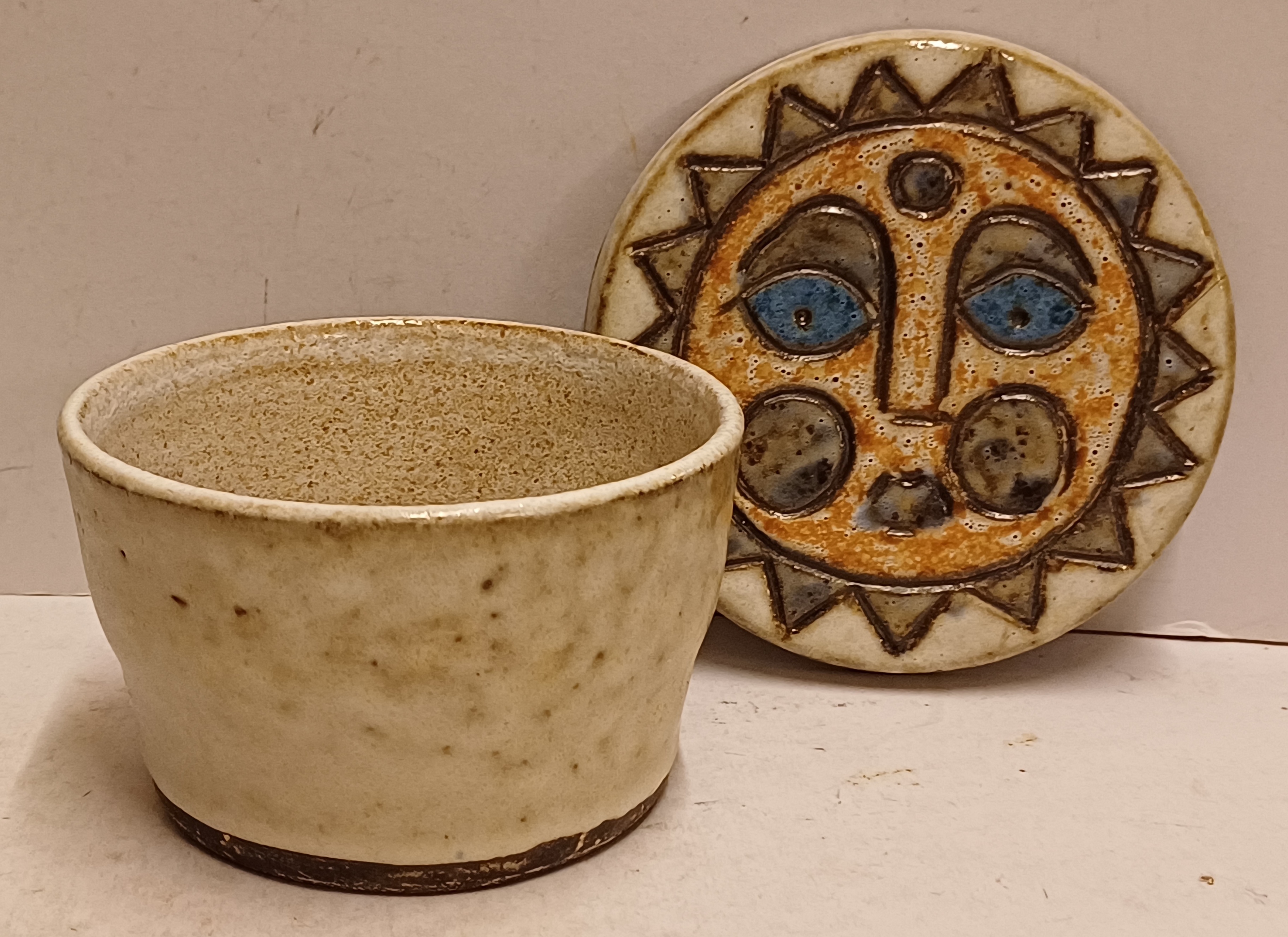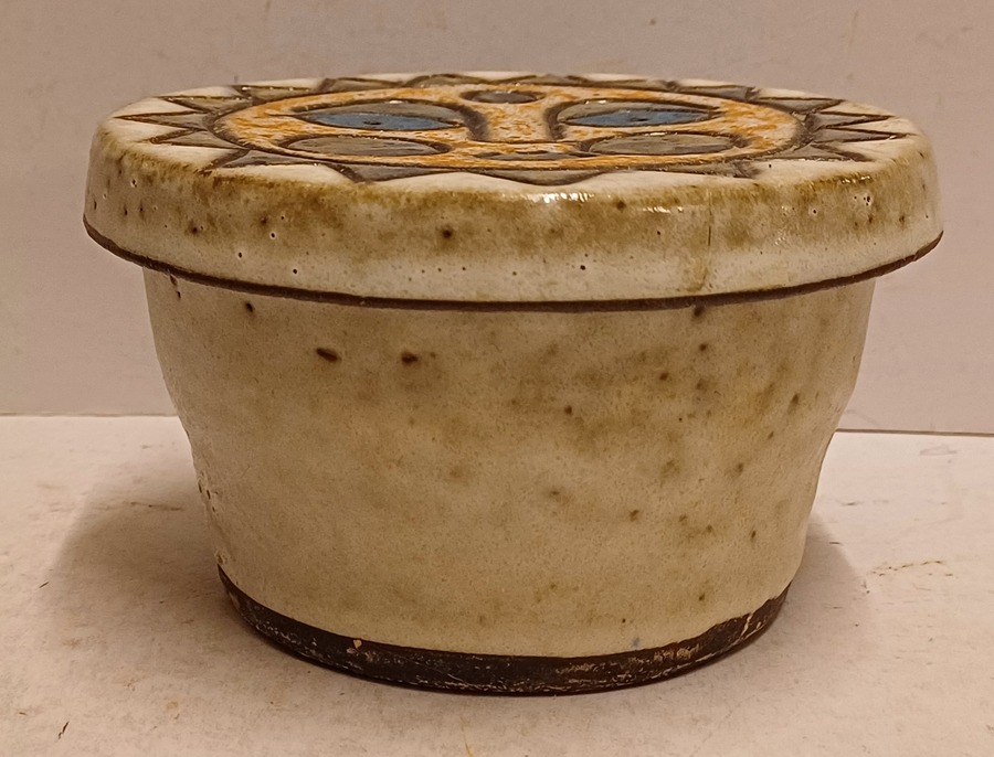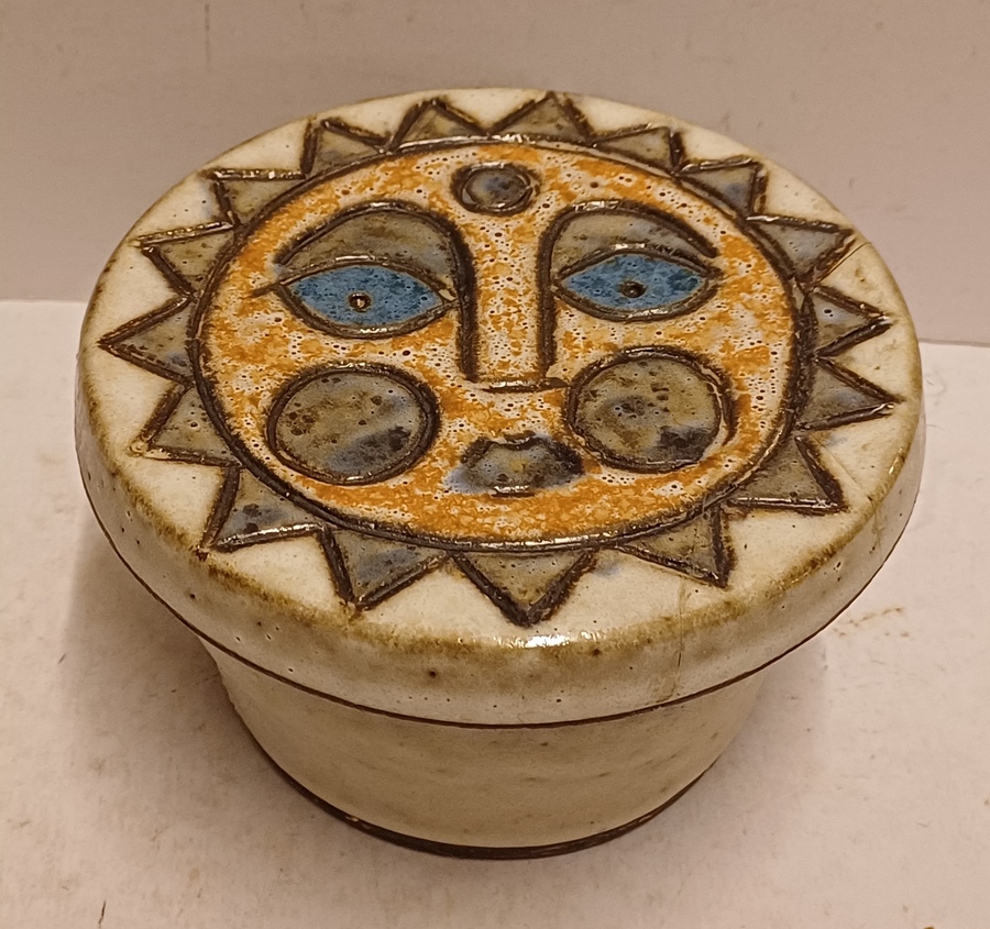 Aardewerken dekseldoos met decoratie van een zon op de deksel. Onderzijde gemerkt.