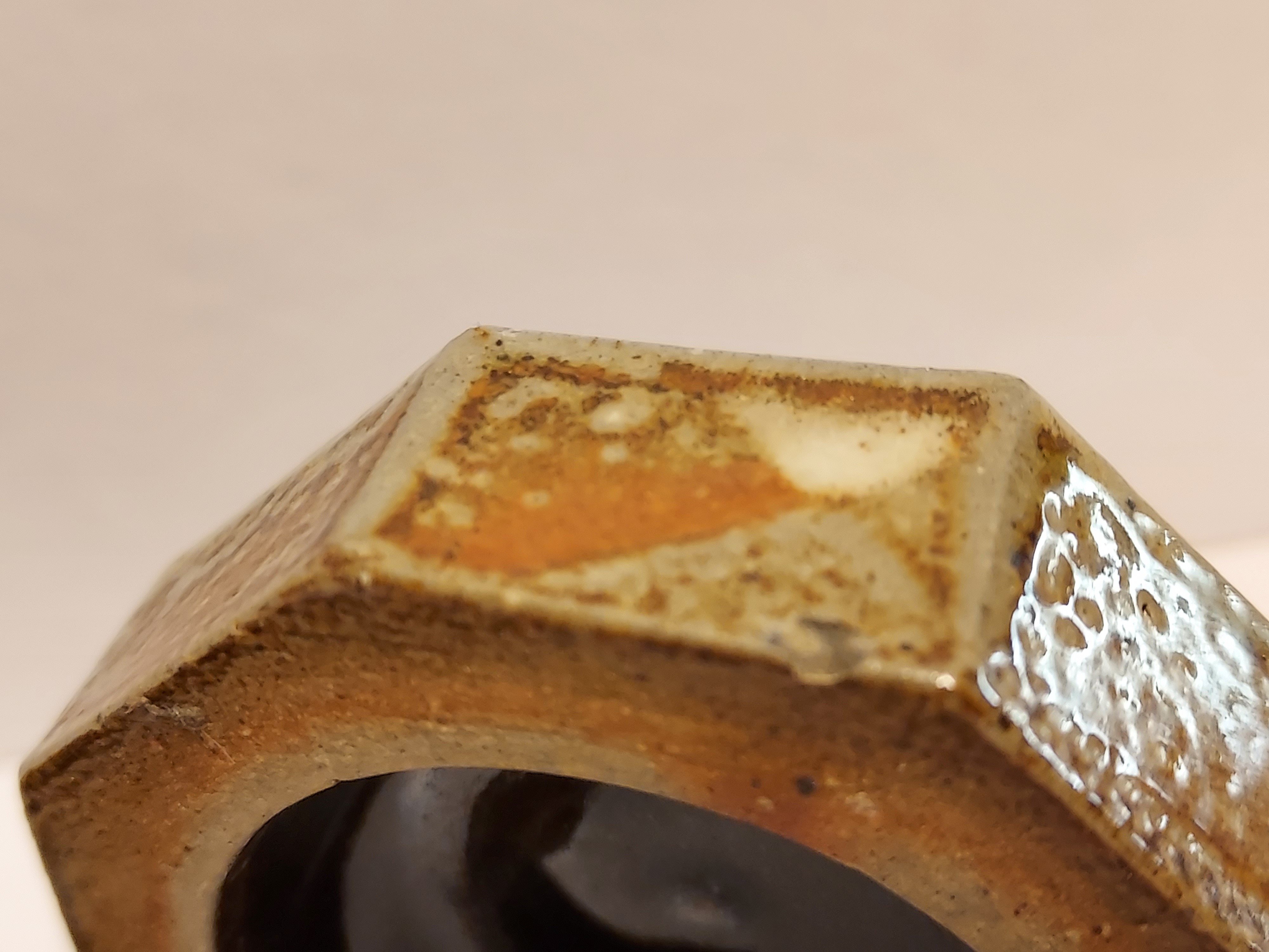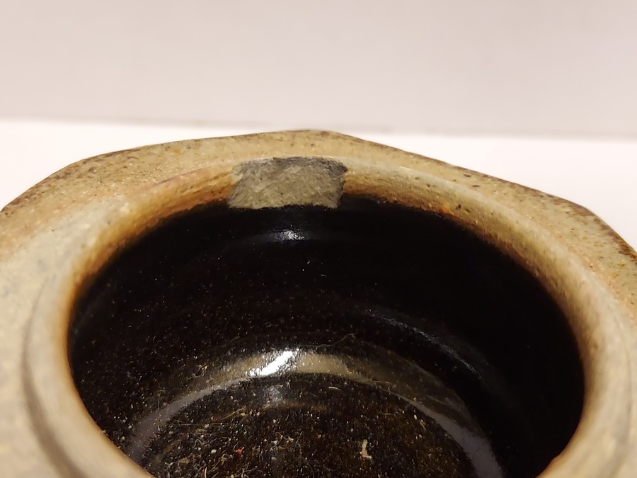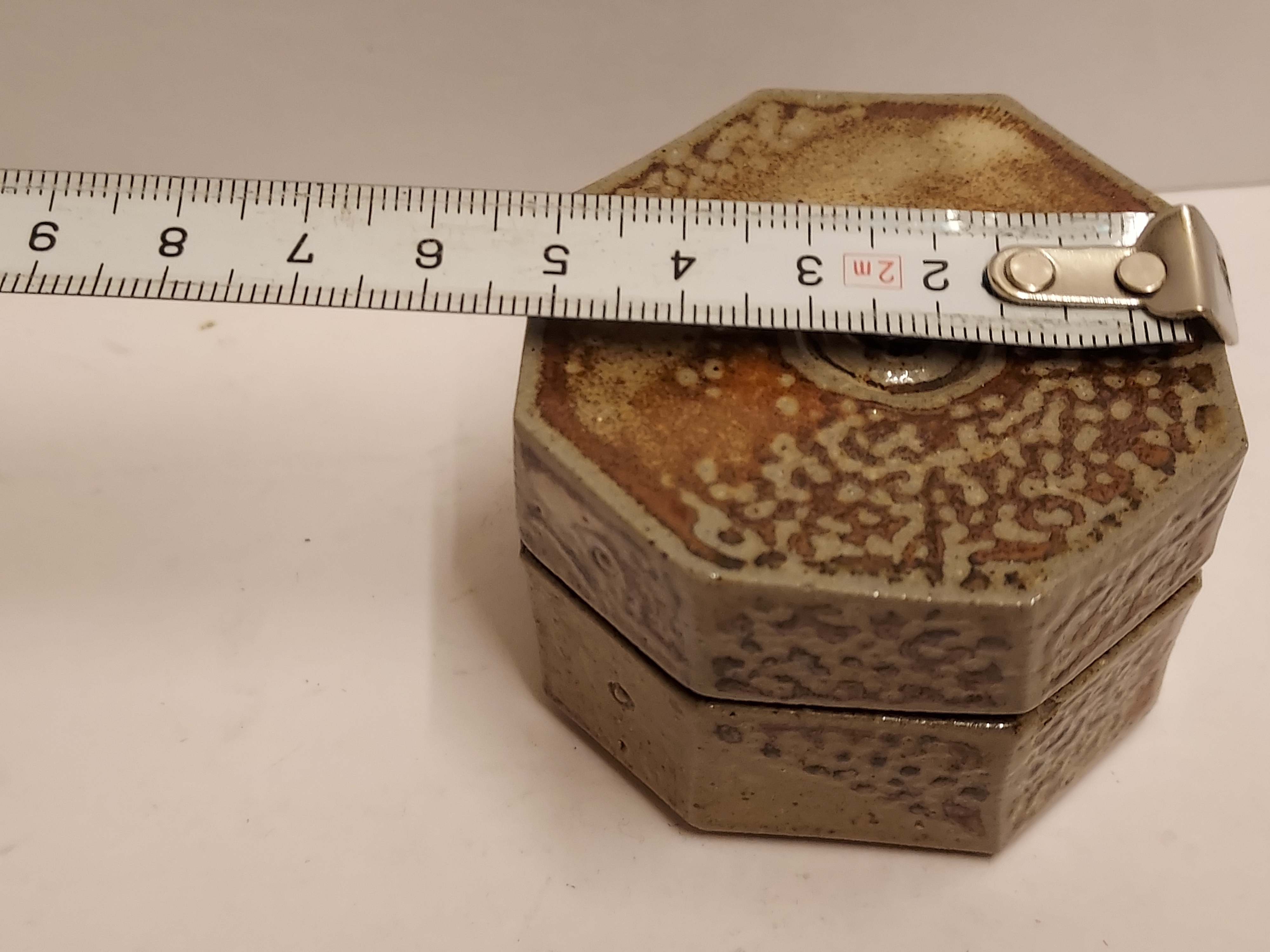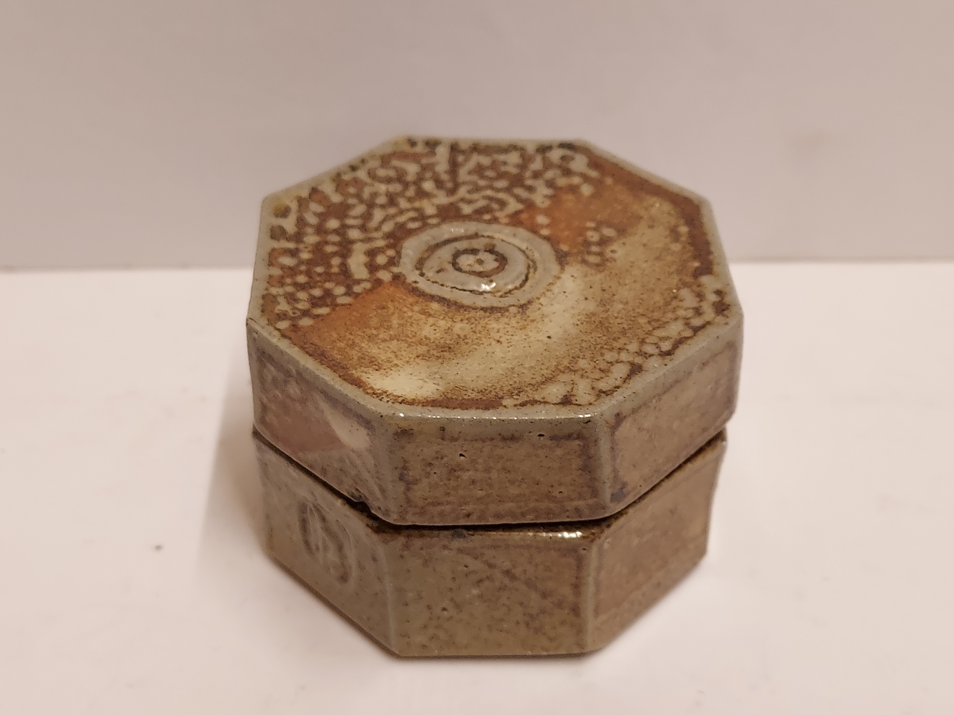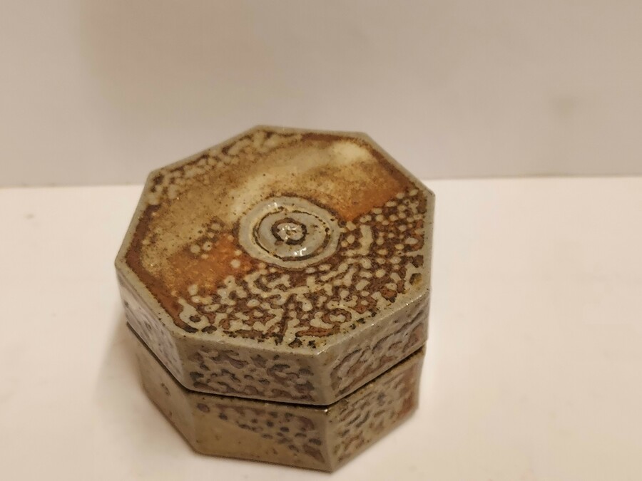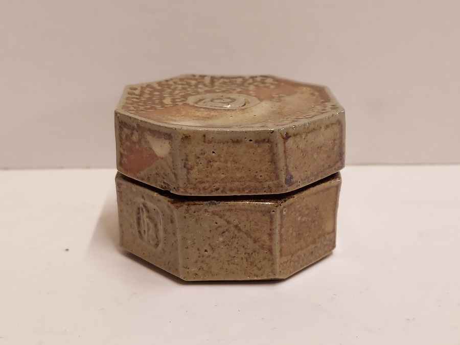 Achtkantige Deckeldose mit Salzglasur. Seitlich mit gestempeltem Markenzeichen.