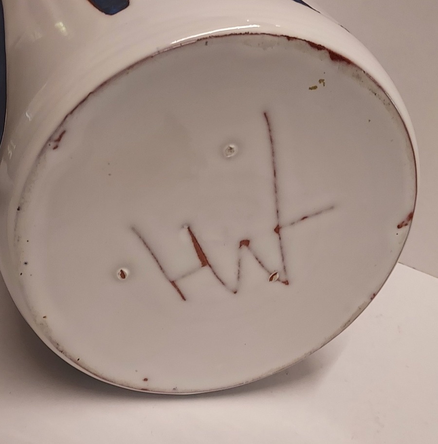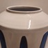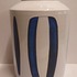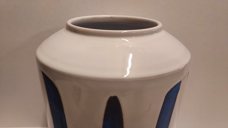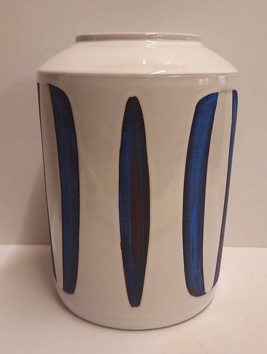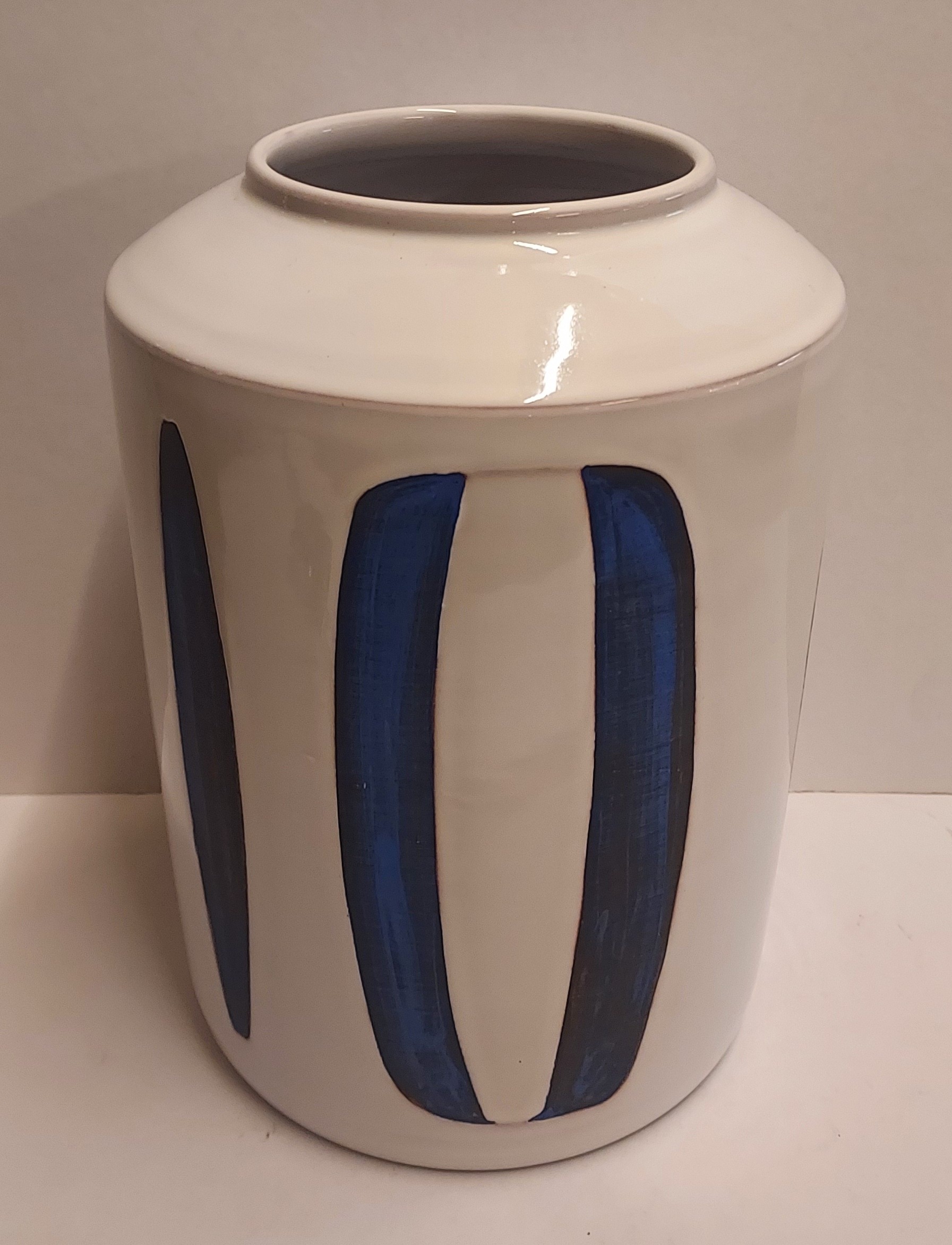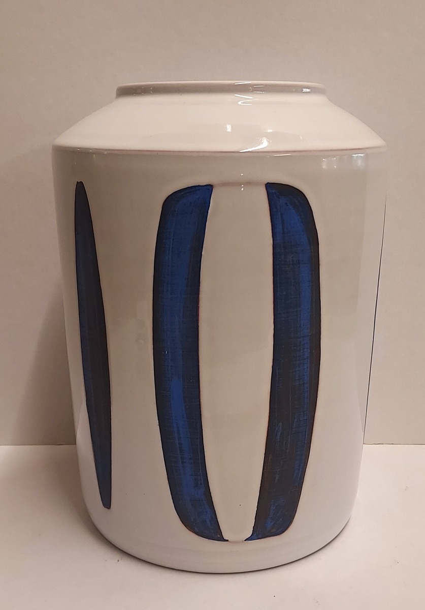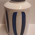 Große zylindrische Vase mit Zinnglasur und ausgesparten blauen Banddekorationen. Unterseite mit Monogramm HW.