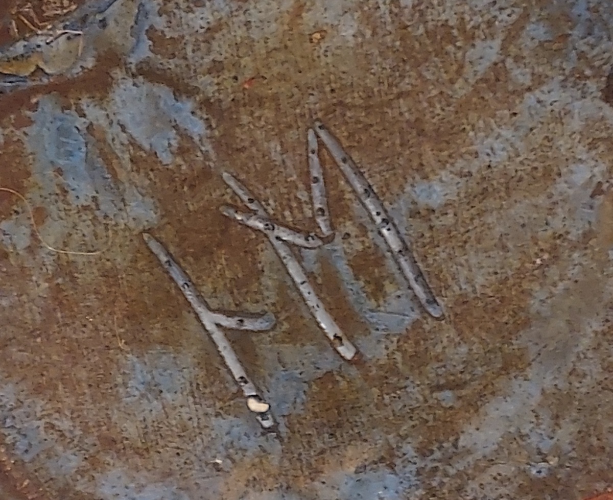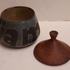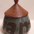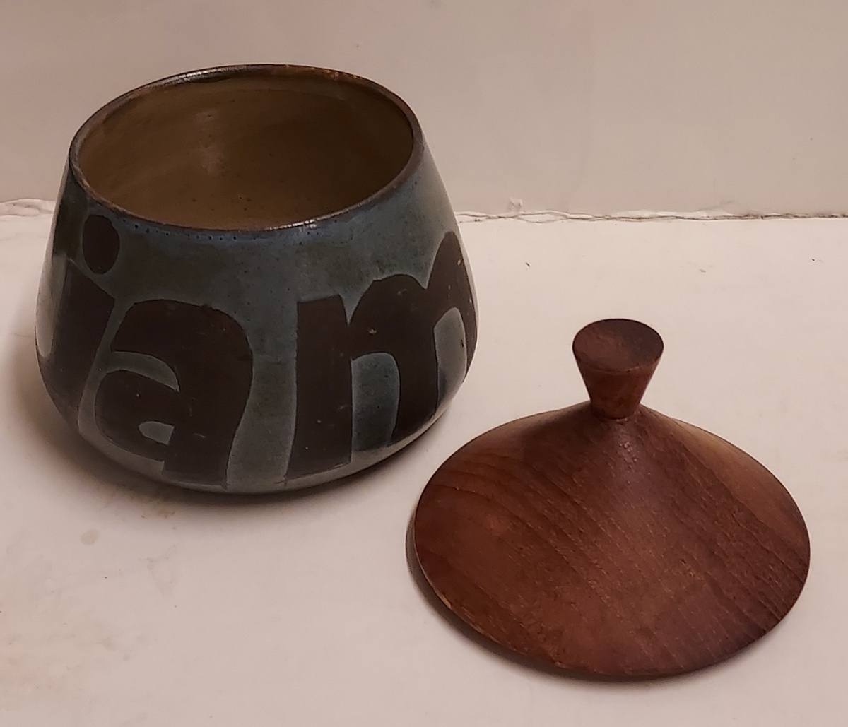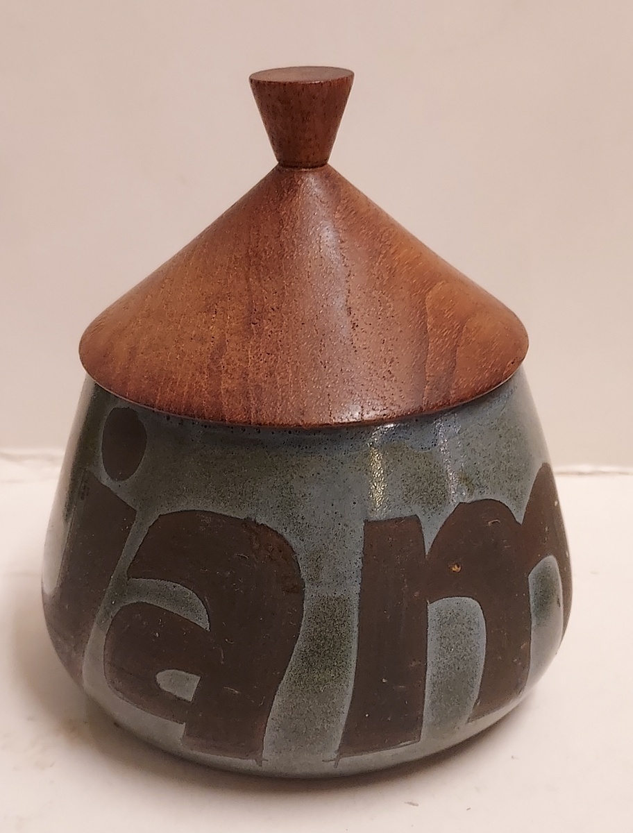 Marmeladentopf mit Aufschrift und Holzdeckel. Unterseite mit Monogramm.