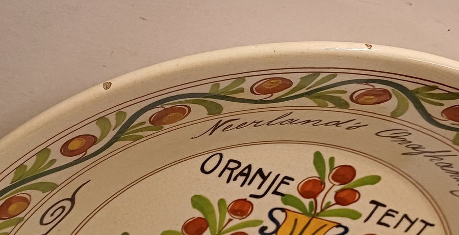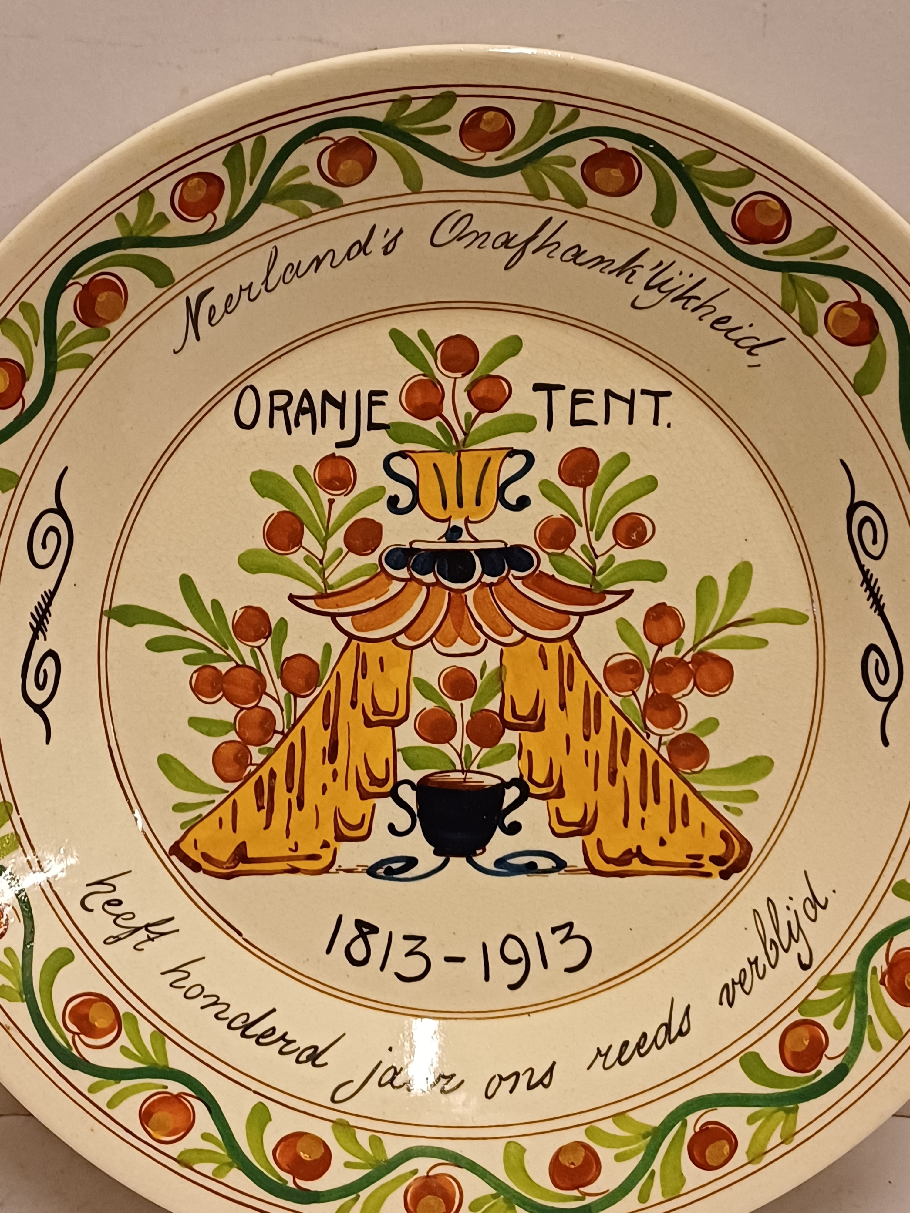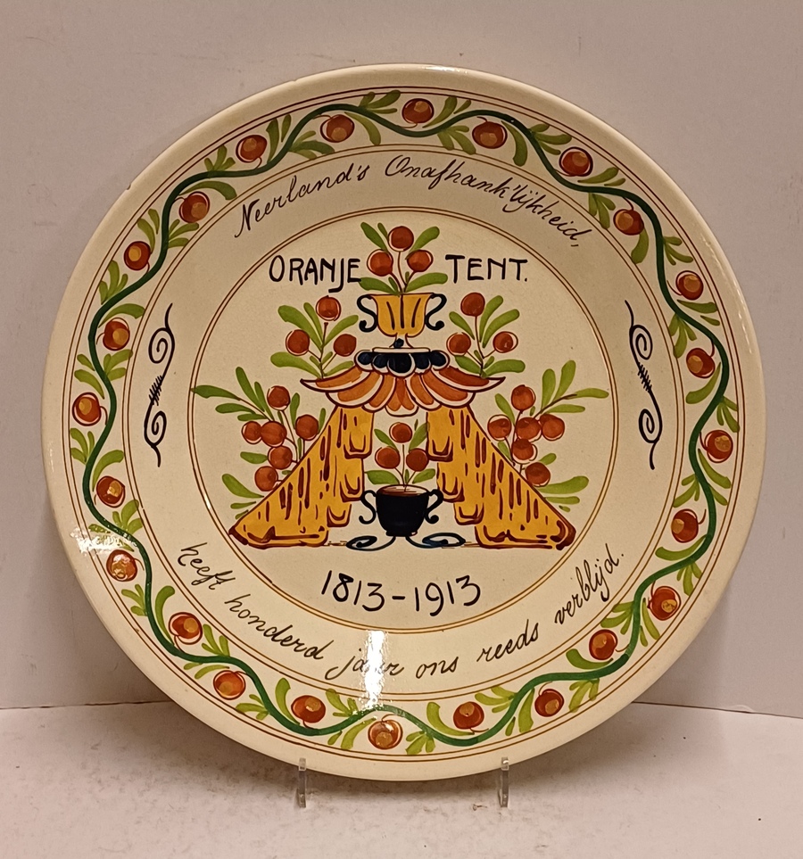Platelen bord met de tekst "Nederlands onafhankelijkheid Oranje Tent 1813-1913 Heeft honderd jaar ons reeds verblijd. Achterzijde met gestempeld merk.
