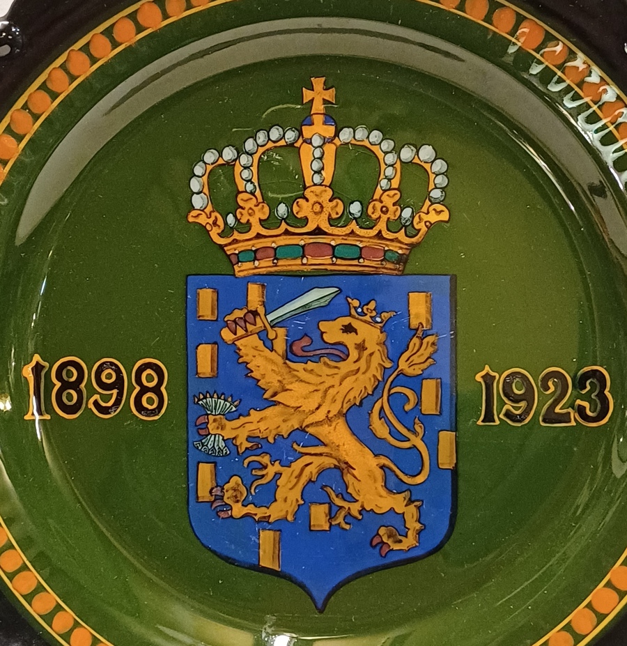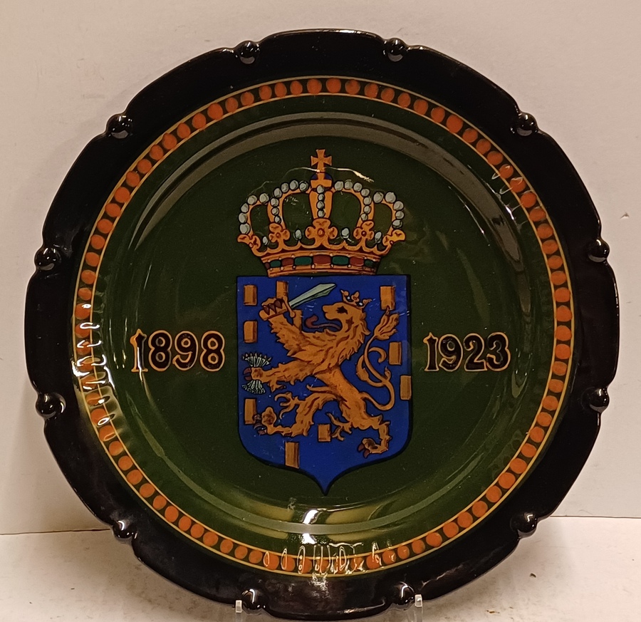 Platelen wandbord met geschulpte rand. Met op hjet plate geschilderd wapen van Nederland met de jaartallen 1898-1923. Achterzijde gemerkt.