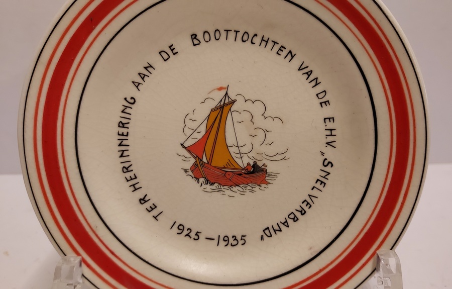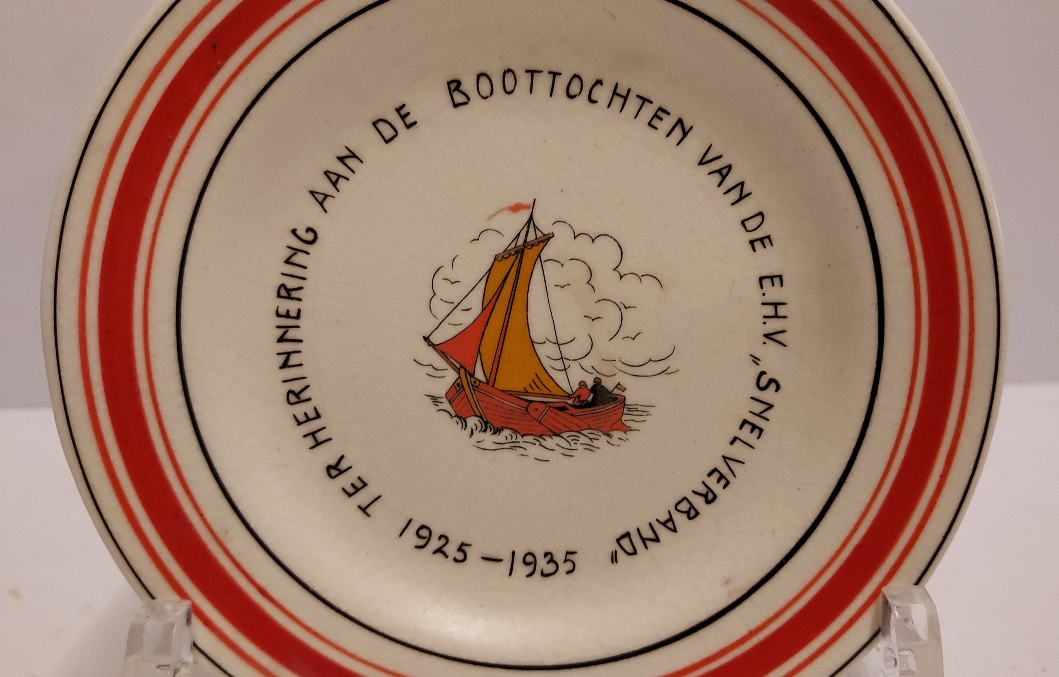 Darstellung eines Schiffes mit dem umlaufenden Text "Ter herinnering aan de boottochten van de E.H.V. Snelverband 1925-1935". Rückseite mit Fabrikmarke.