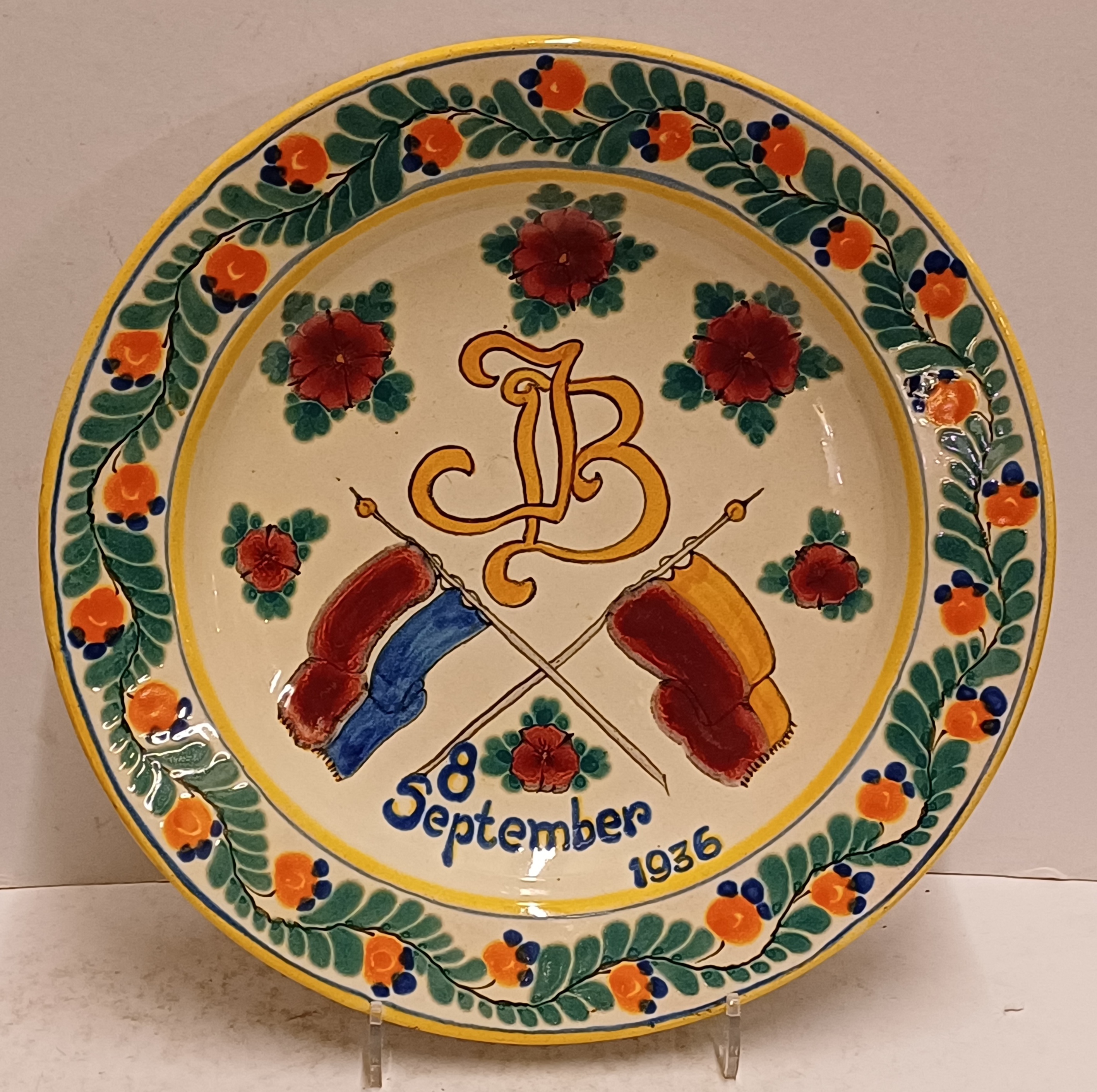 Platelen wandbord met gekruiste vlaggen en de datum 8 sept 1936. Achterzijde met fabrieksmerk.