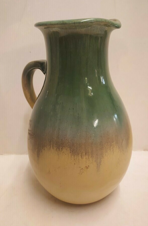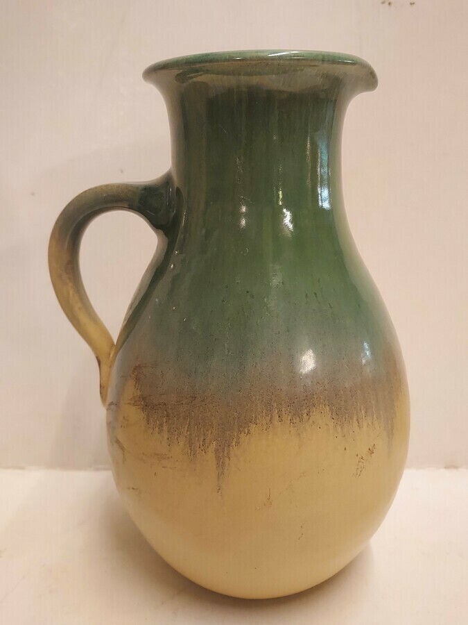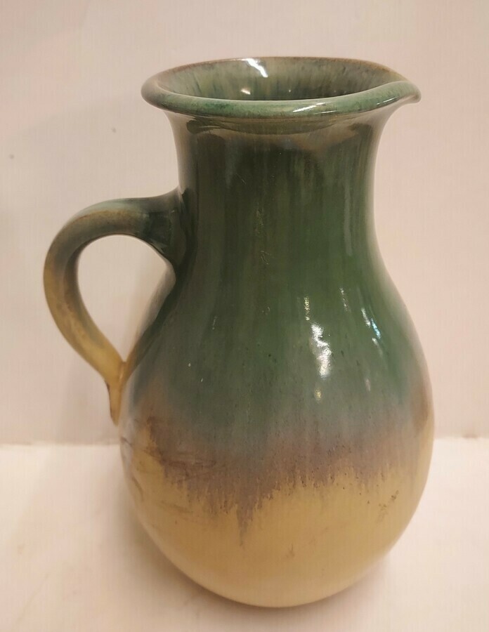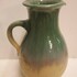 Schenkkanne mit grüner Glasur auf cremefarbenem Untergrund. Entwurf von Klaas Mobach II. Unterseite signiert.