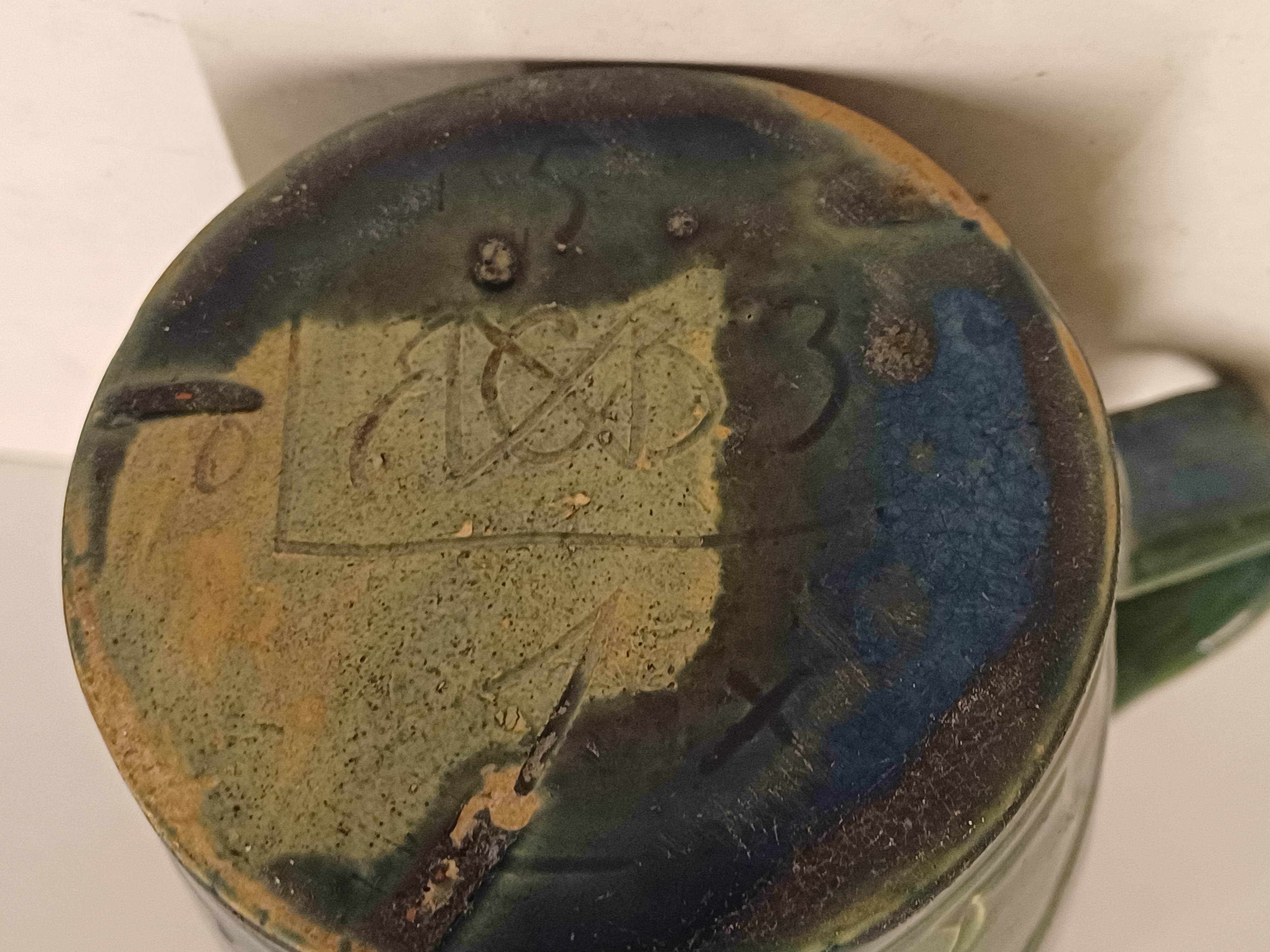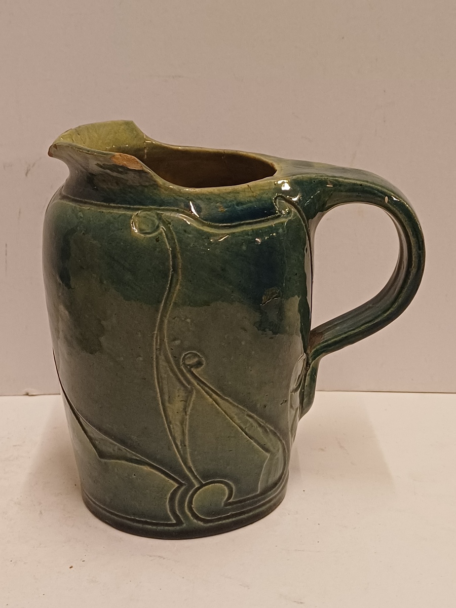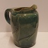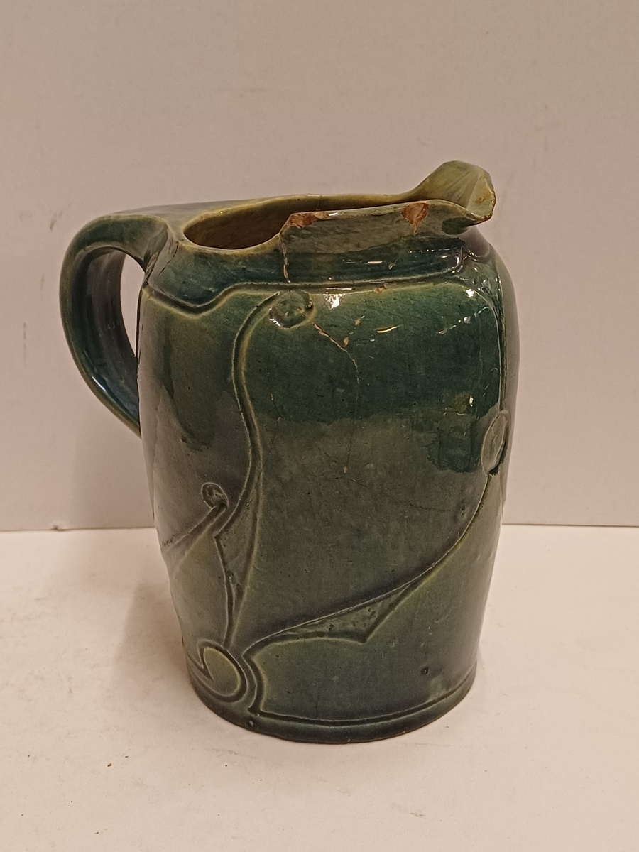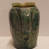 Blau glasierte Steingutgießkanne mit ausgeschnittener Dekoration. Unterseite mit eingekerftem Markenzeichen.