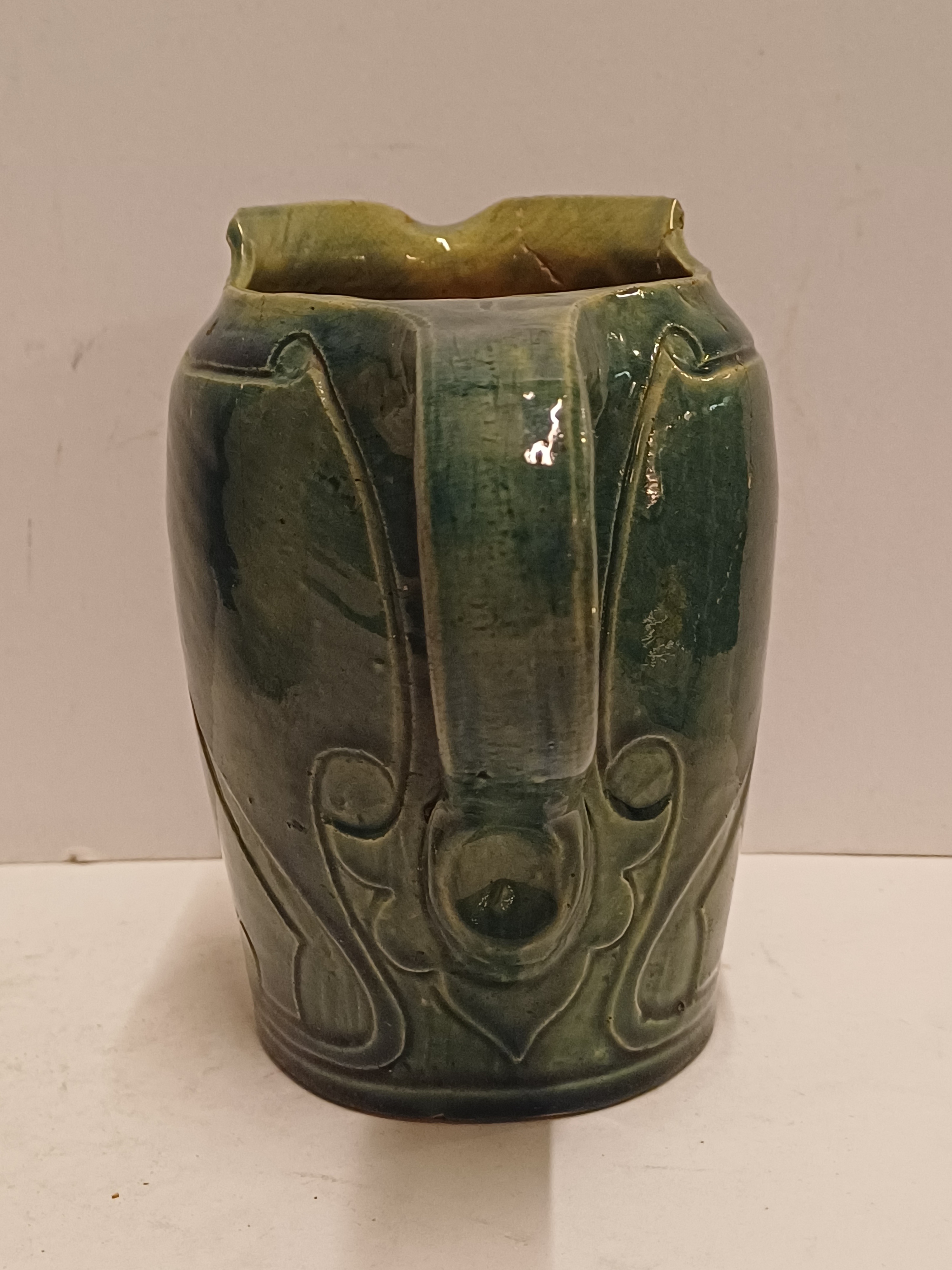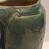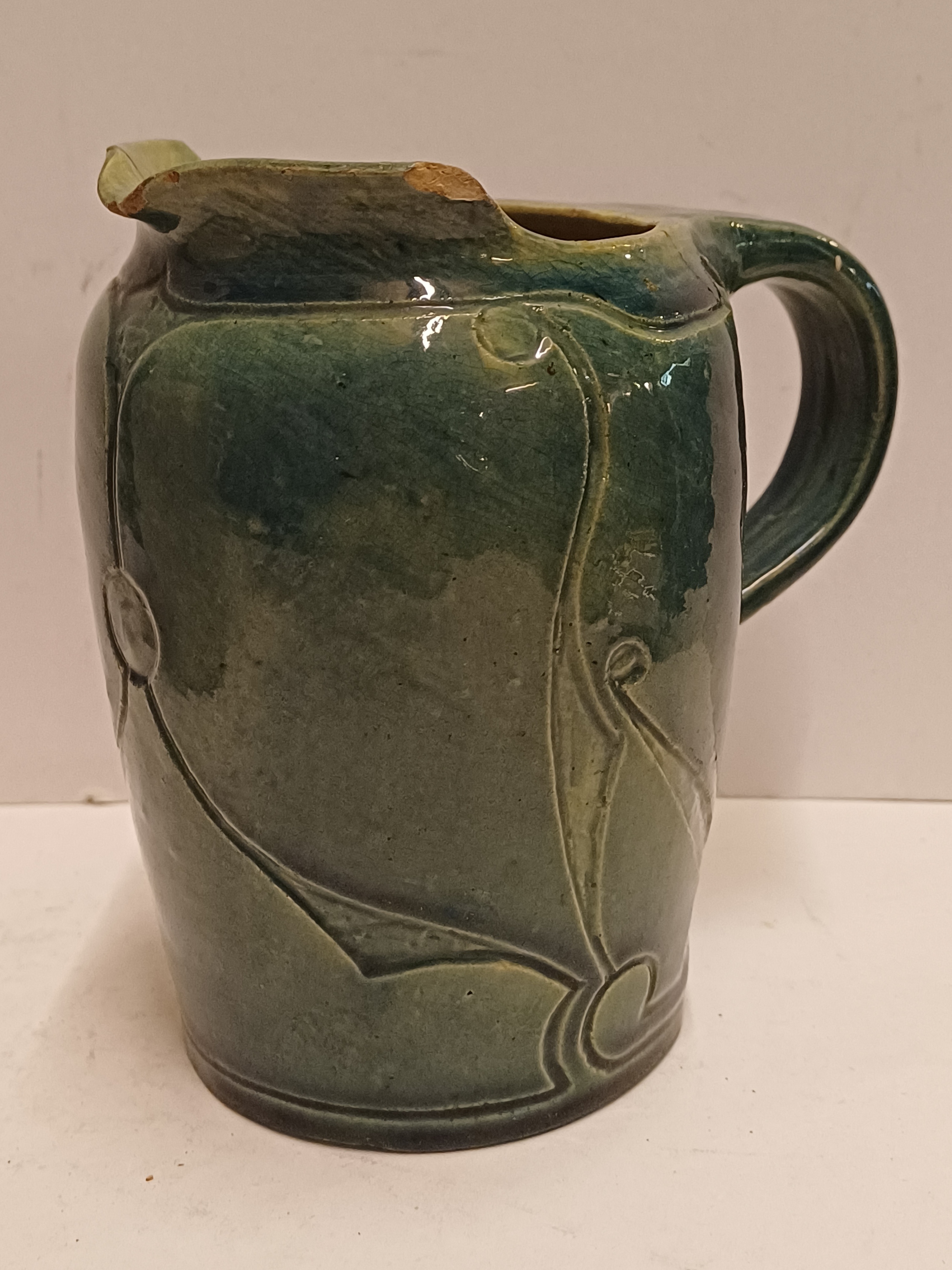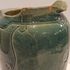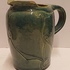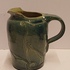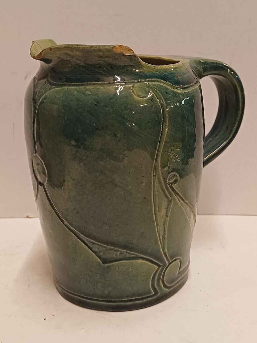 Blau glasierte Steingutgießkanne mit ausgeschnittener Dekoration. Unterseite mit eingekerftem Markenzeichen.