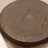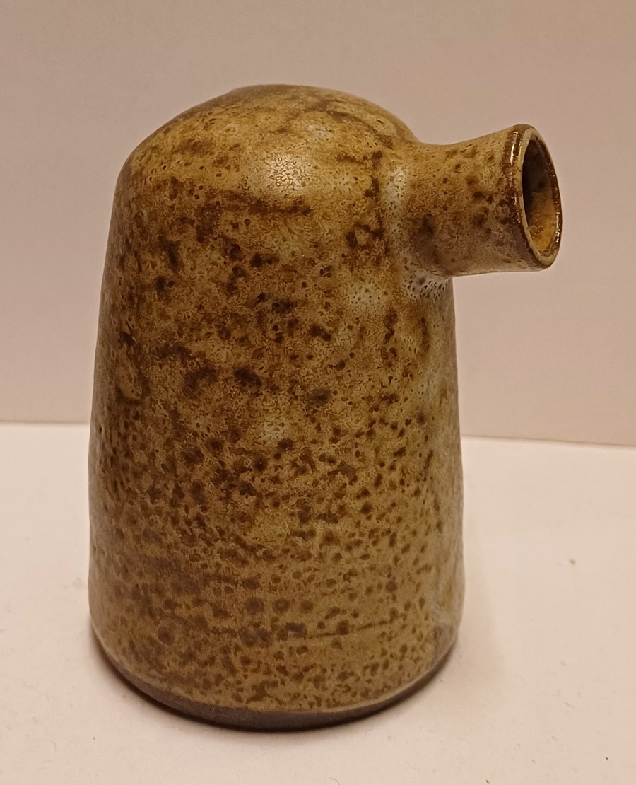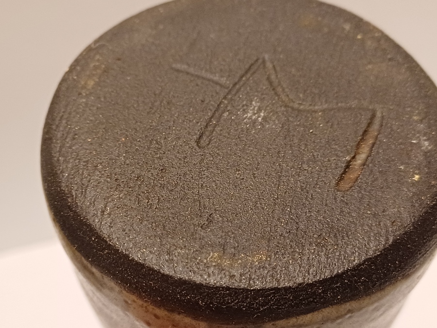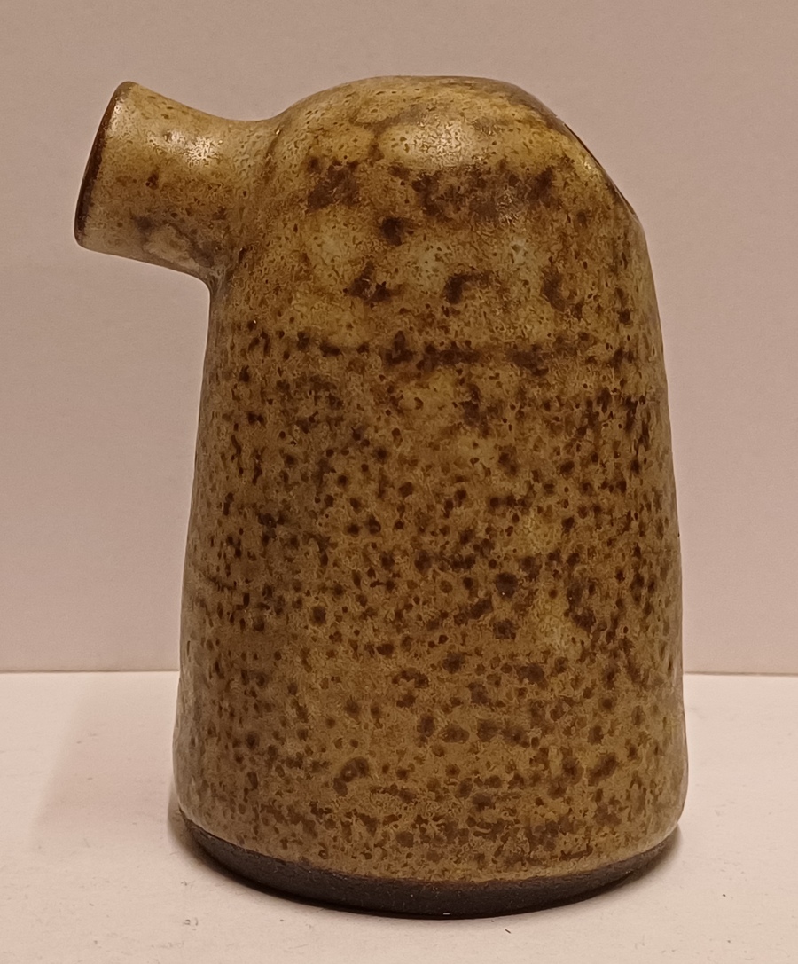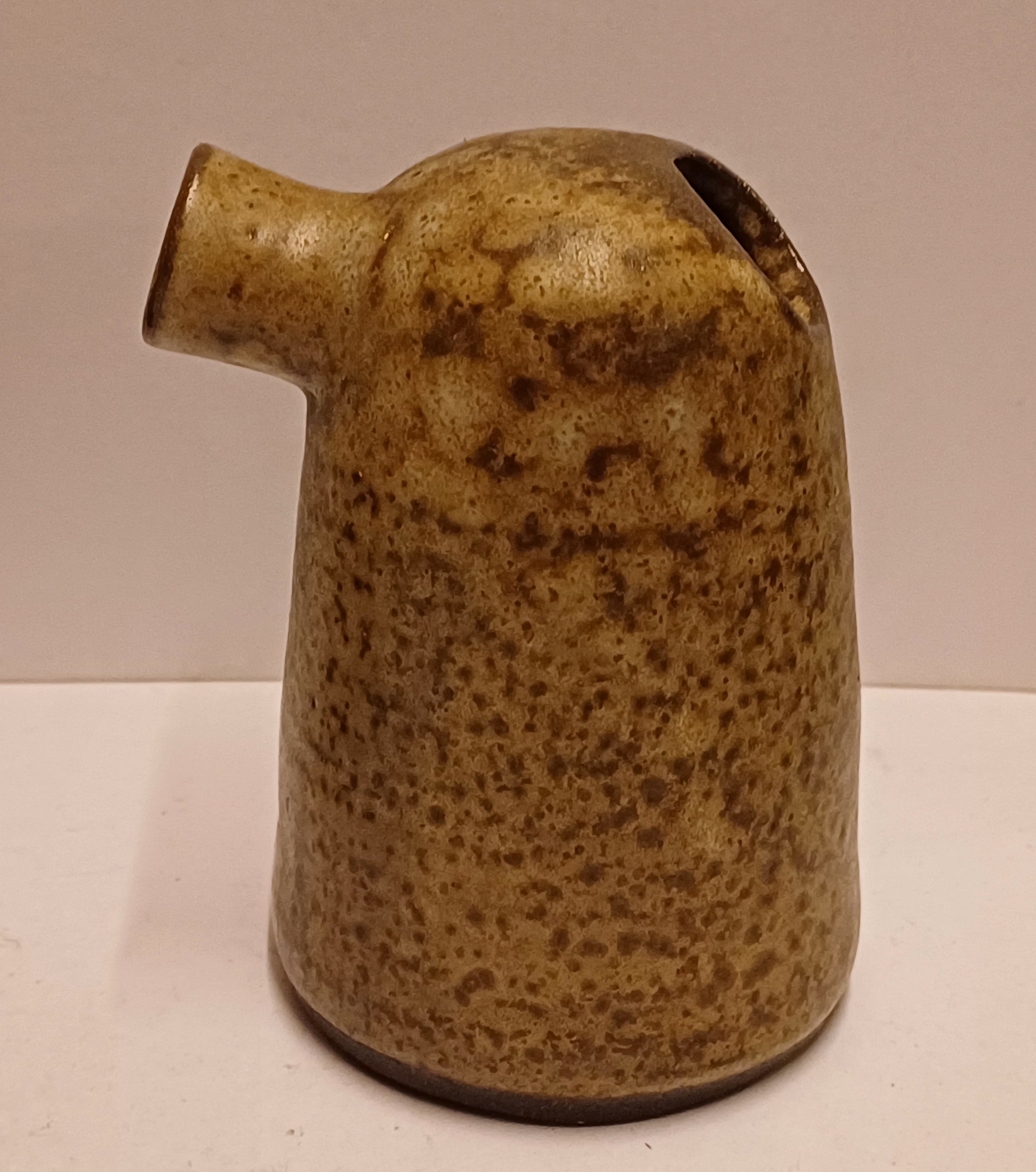Bruin geglazuurd aardewerken kannetje. Onderzijde met monogram.