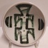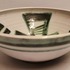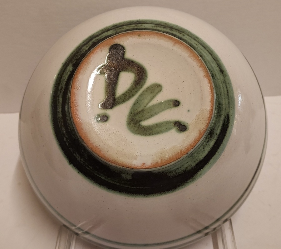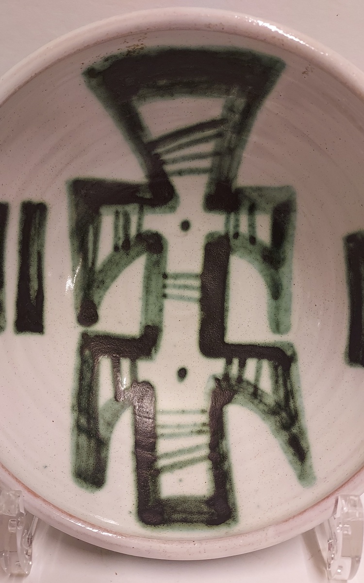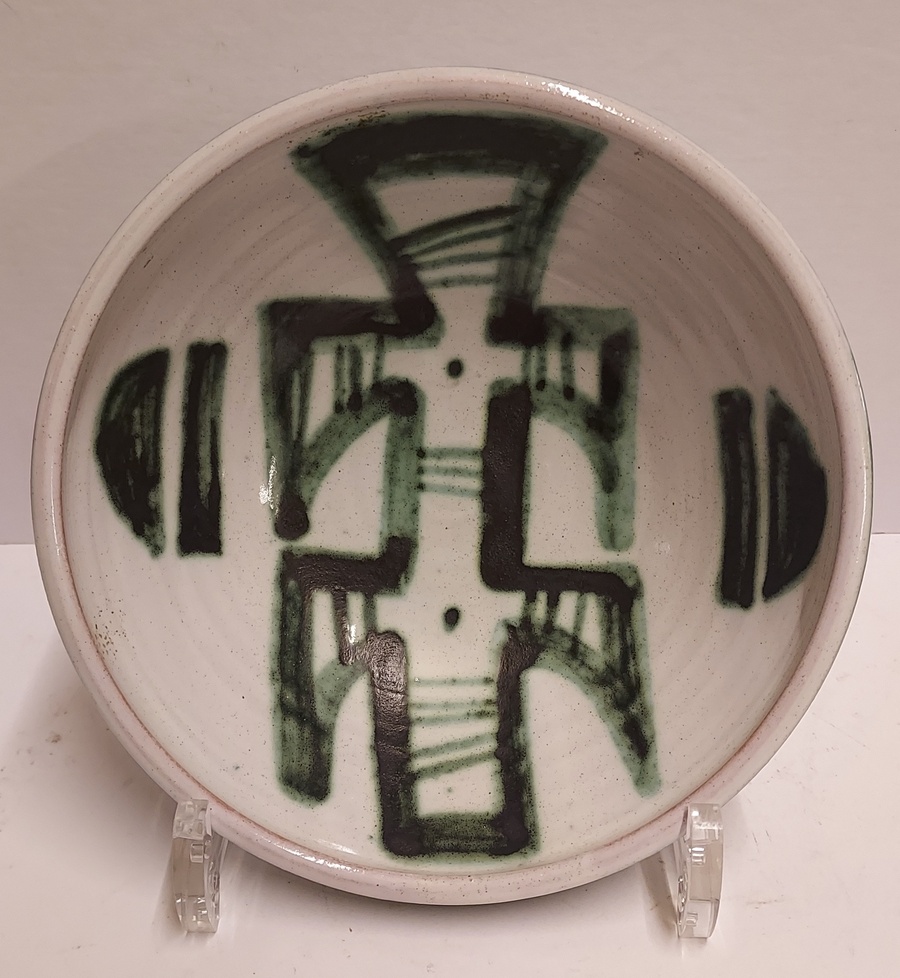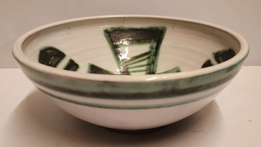 Schüssel mit grüner Dekoration von stilisiertem Dekor auf weißem Untergrund. Unterseite gekennzeichnet mit D'E. Entwurf und Ausführung von Simon Engelhard.