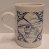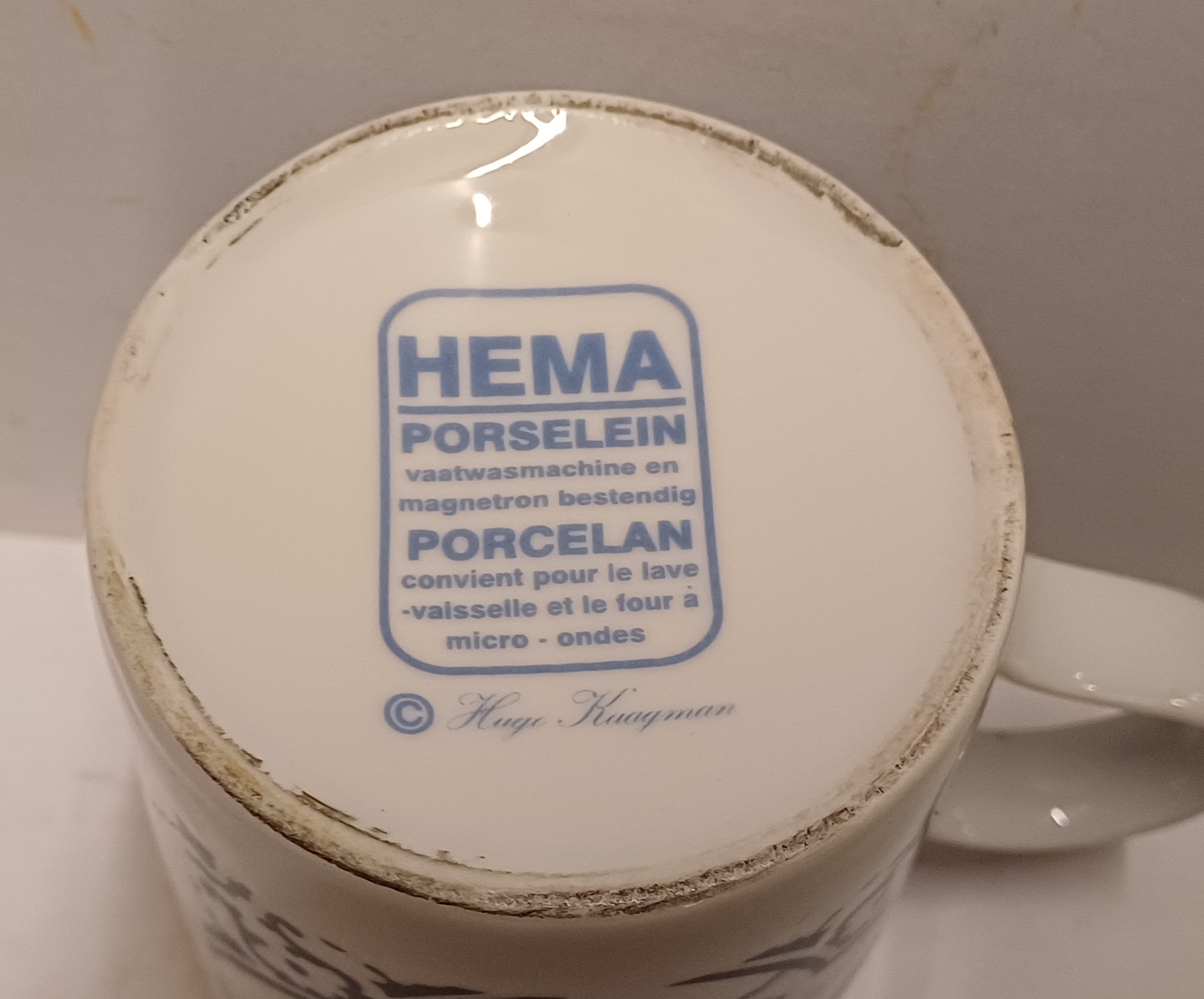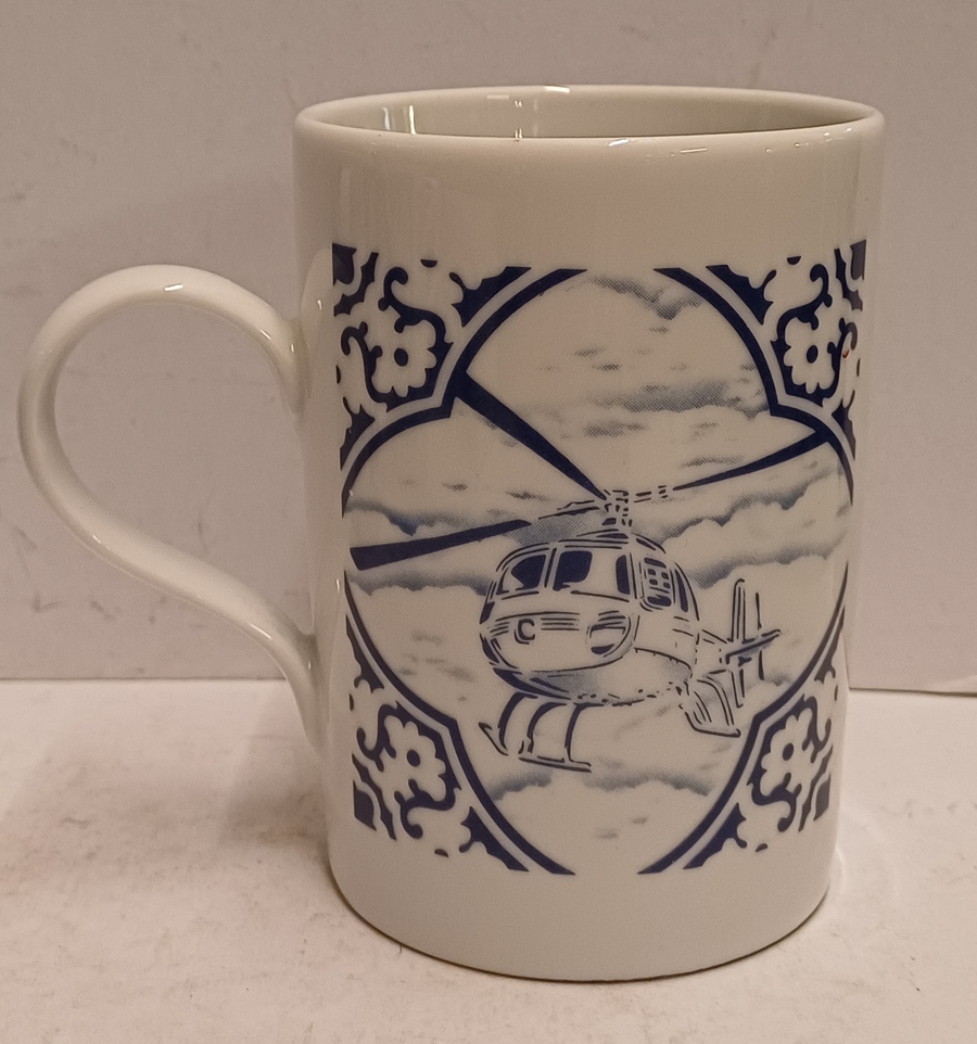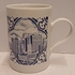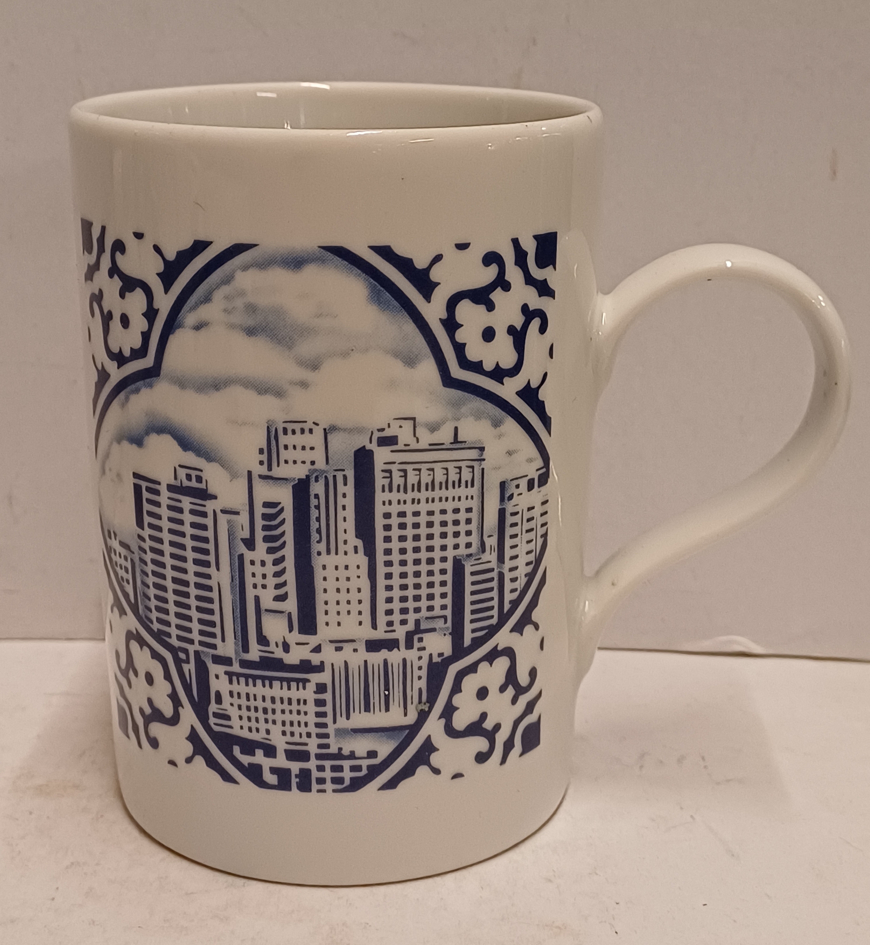 Porseleinen mok met blauw decor van wolkenkrabbers en helicopter aan weerszijden met typerende Kaagman Hoekmotieven. Onderzijde gemerkt Uitvoering Hema.
