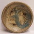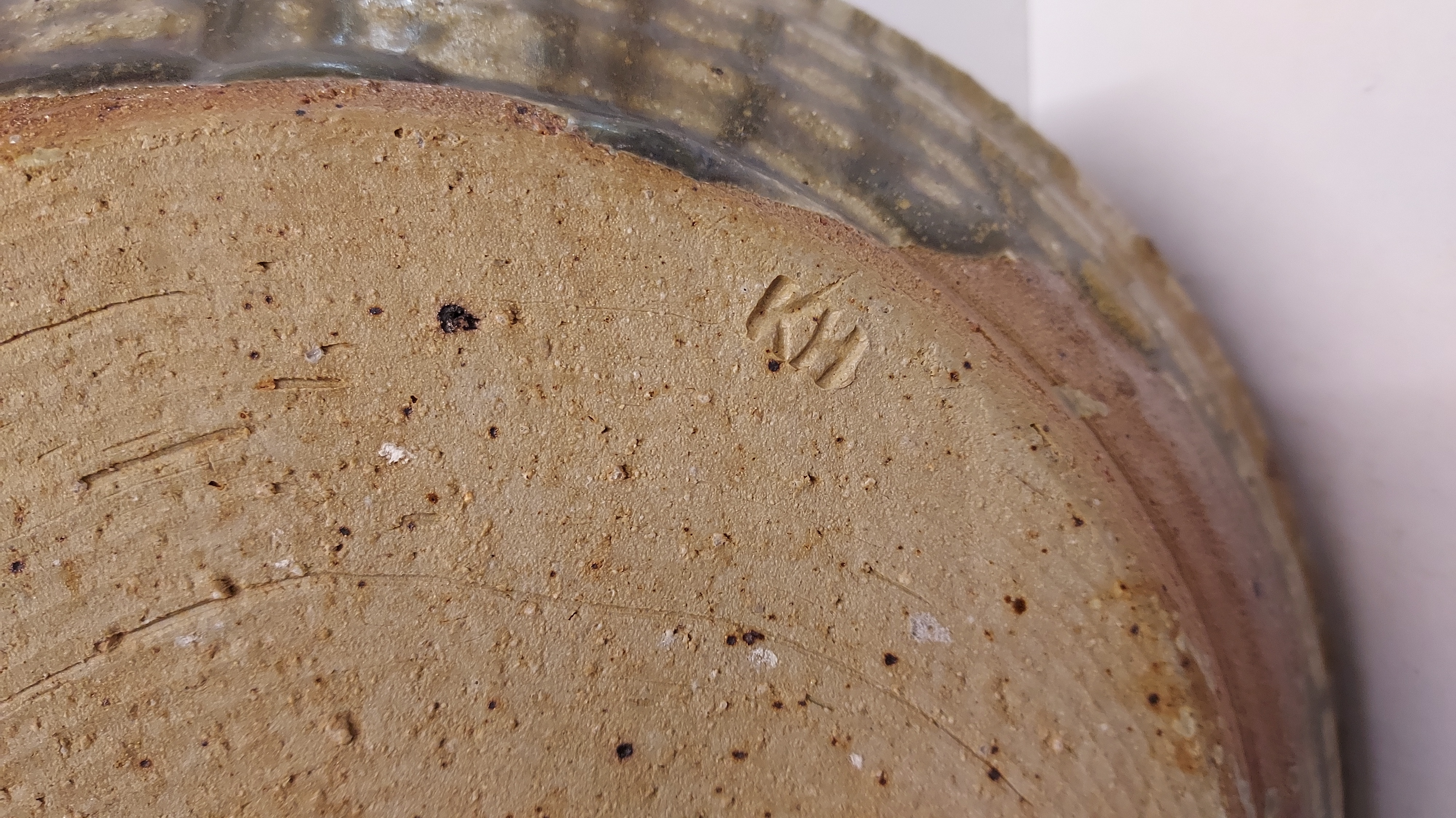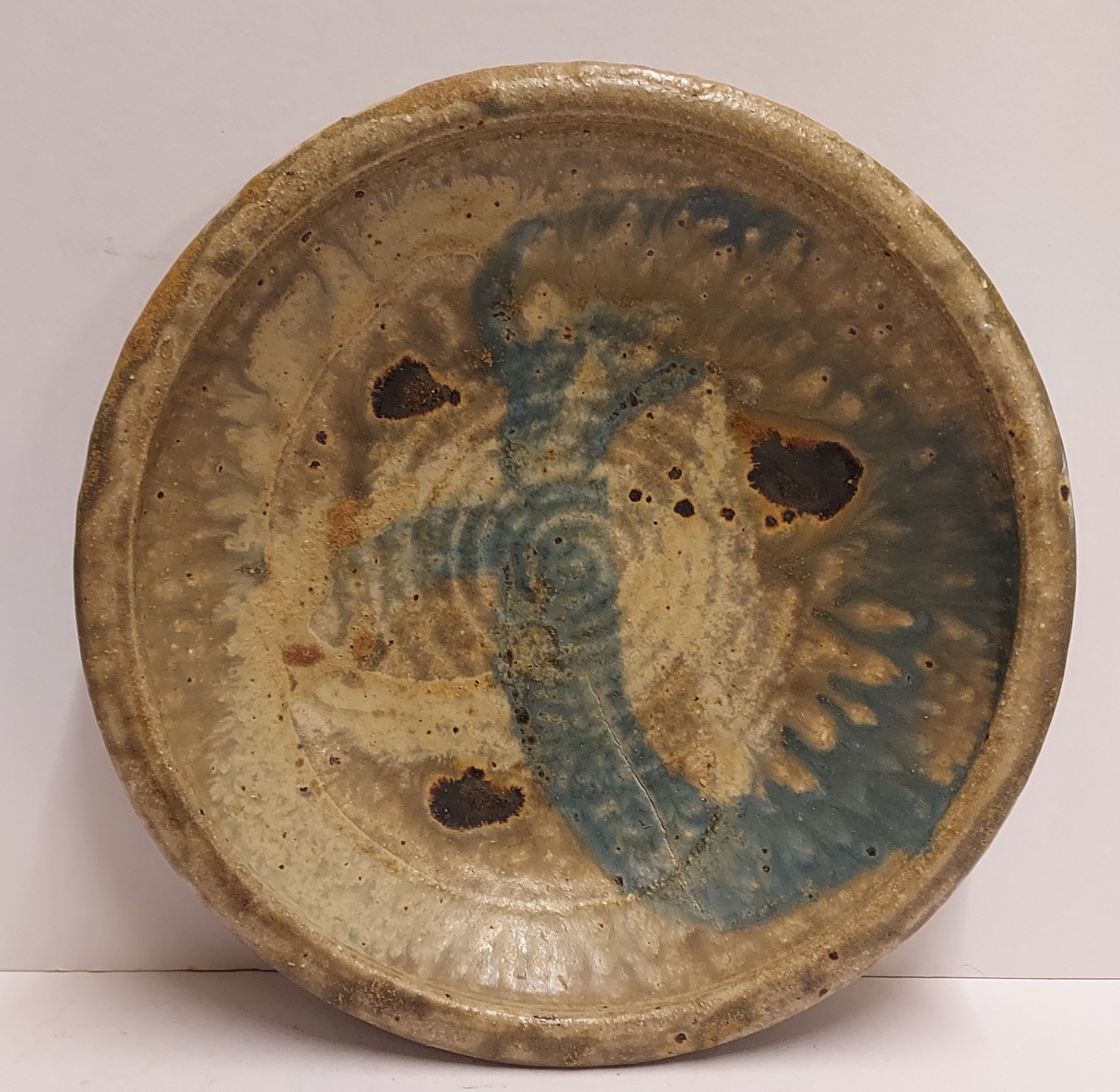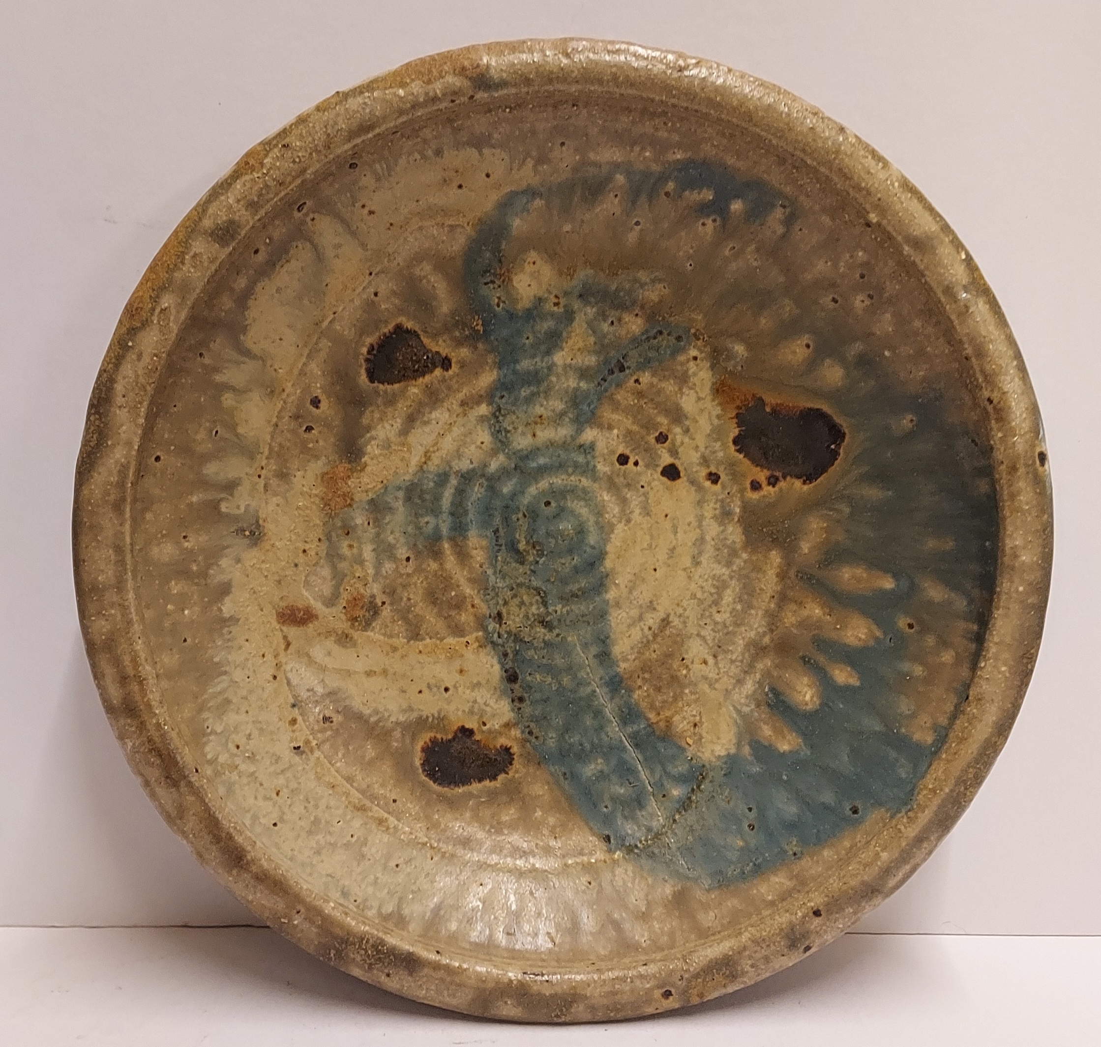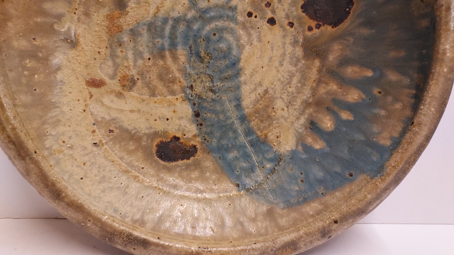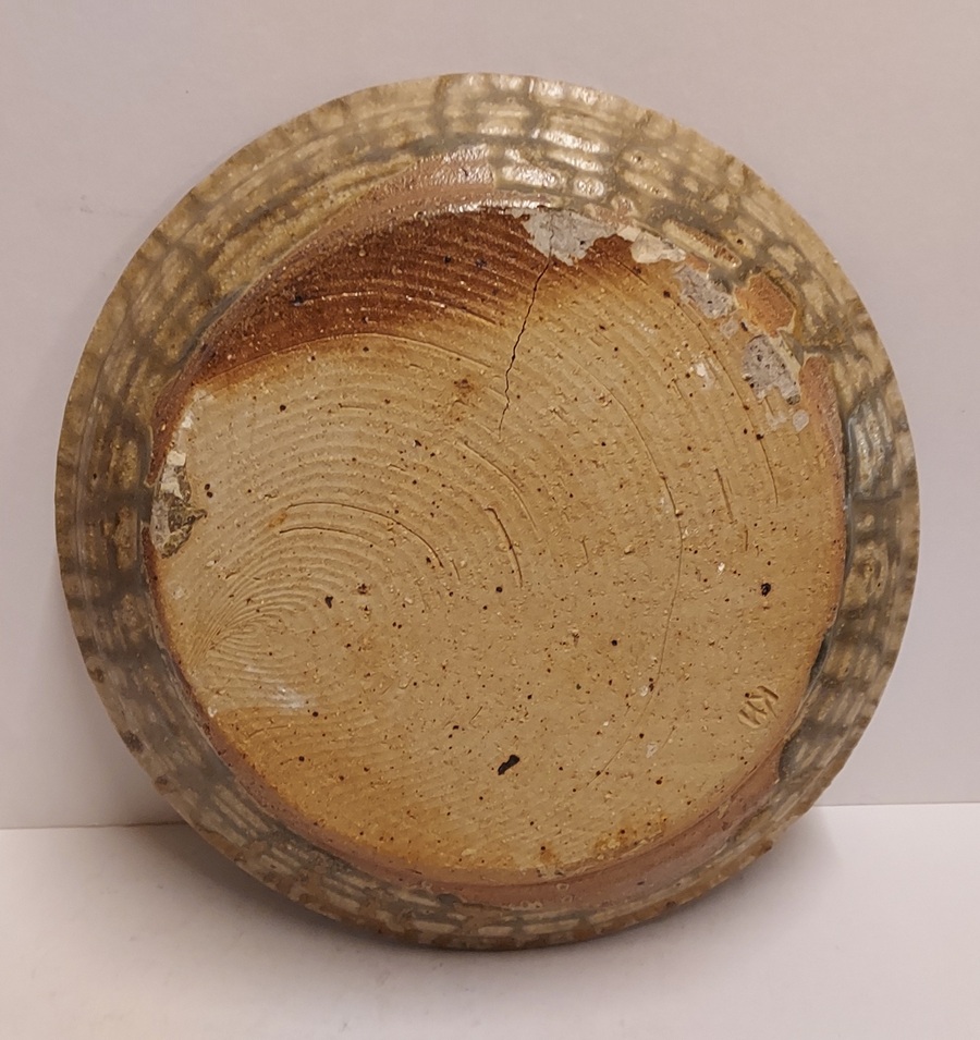 Steingut Schale mit Salzglasur und blauem Wisch. Rückseite mit Monogramm signiert.