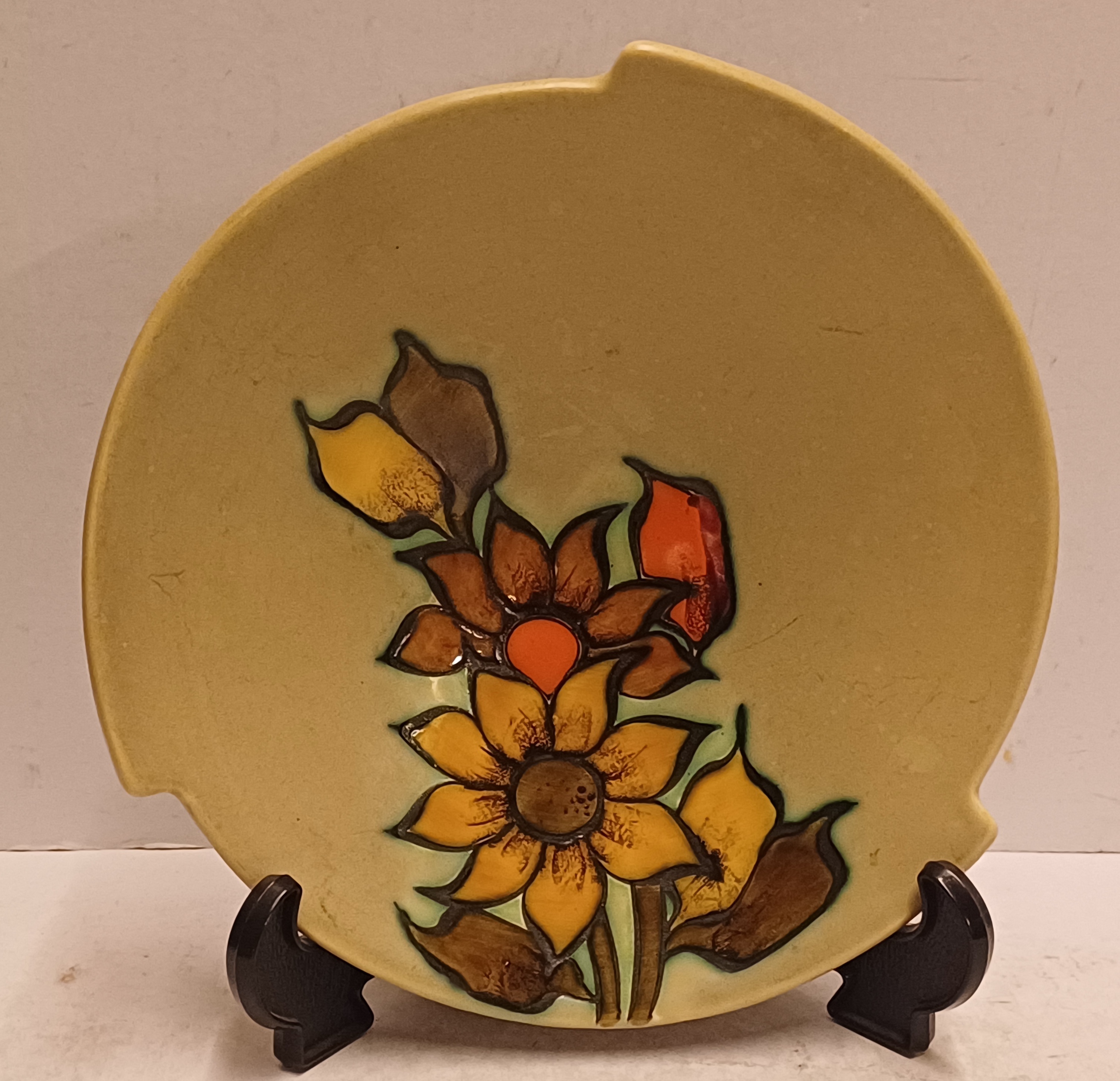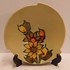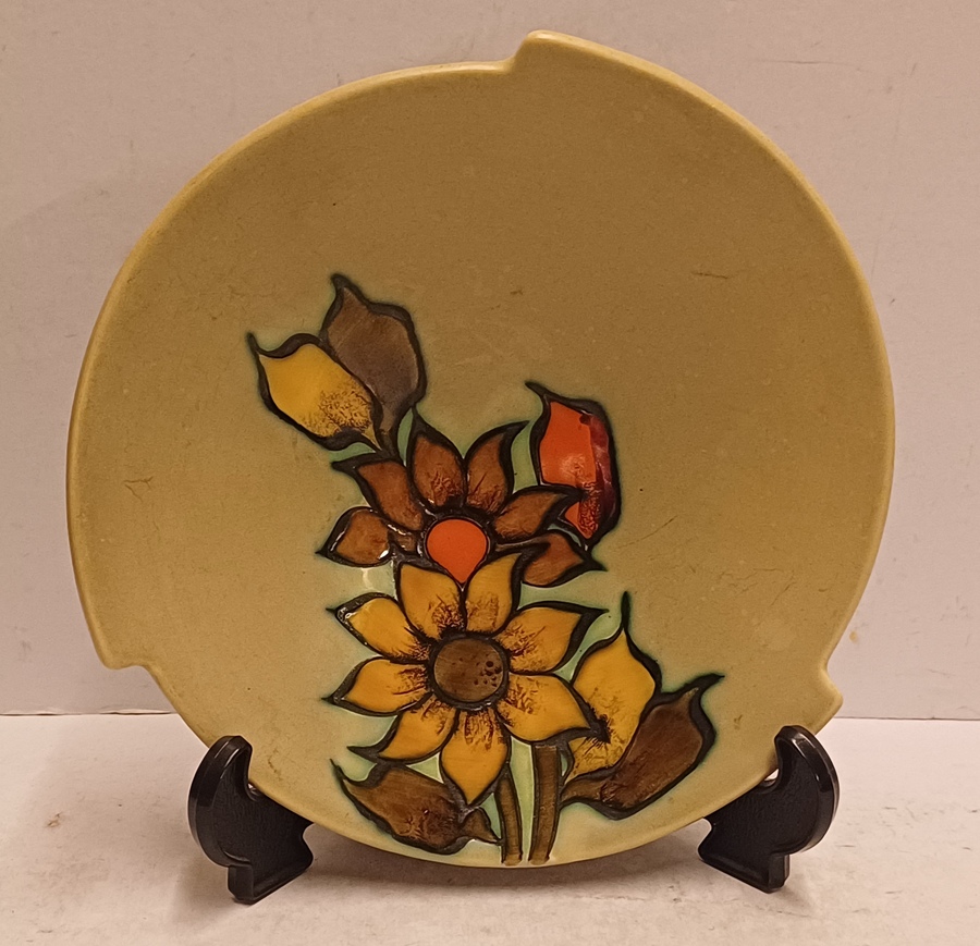 Platelen schaaltje met floraal decor op olijfgroen fond. Onderzijde met fabrieksmerk.