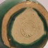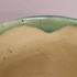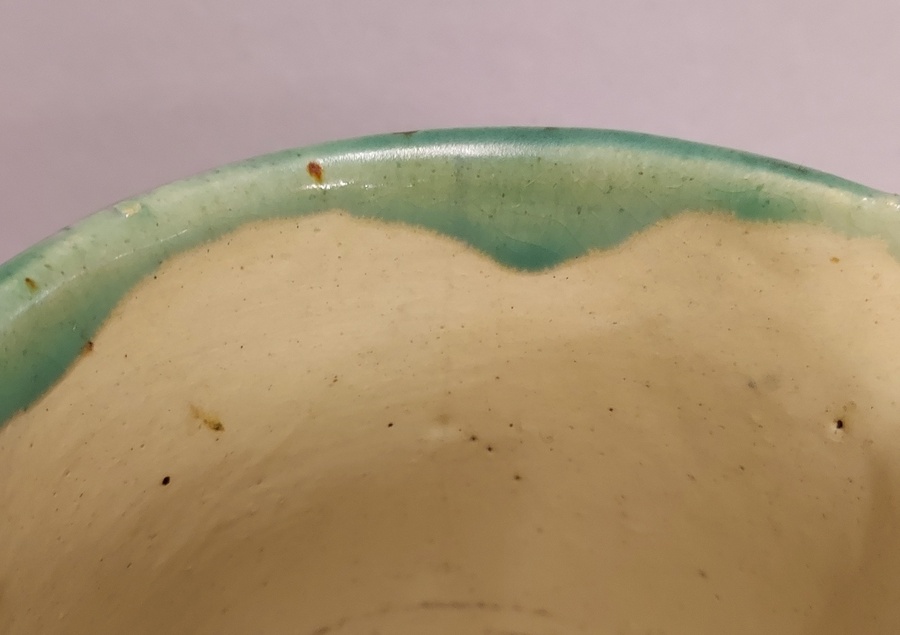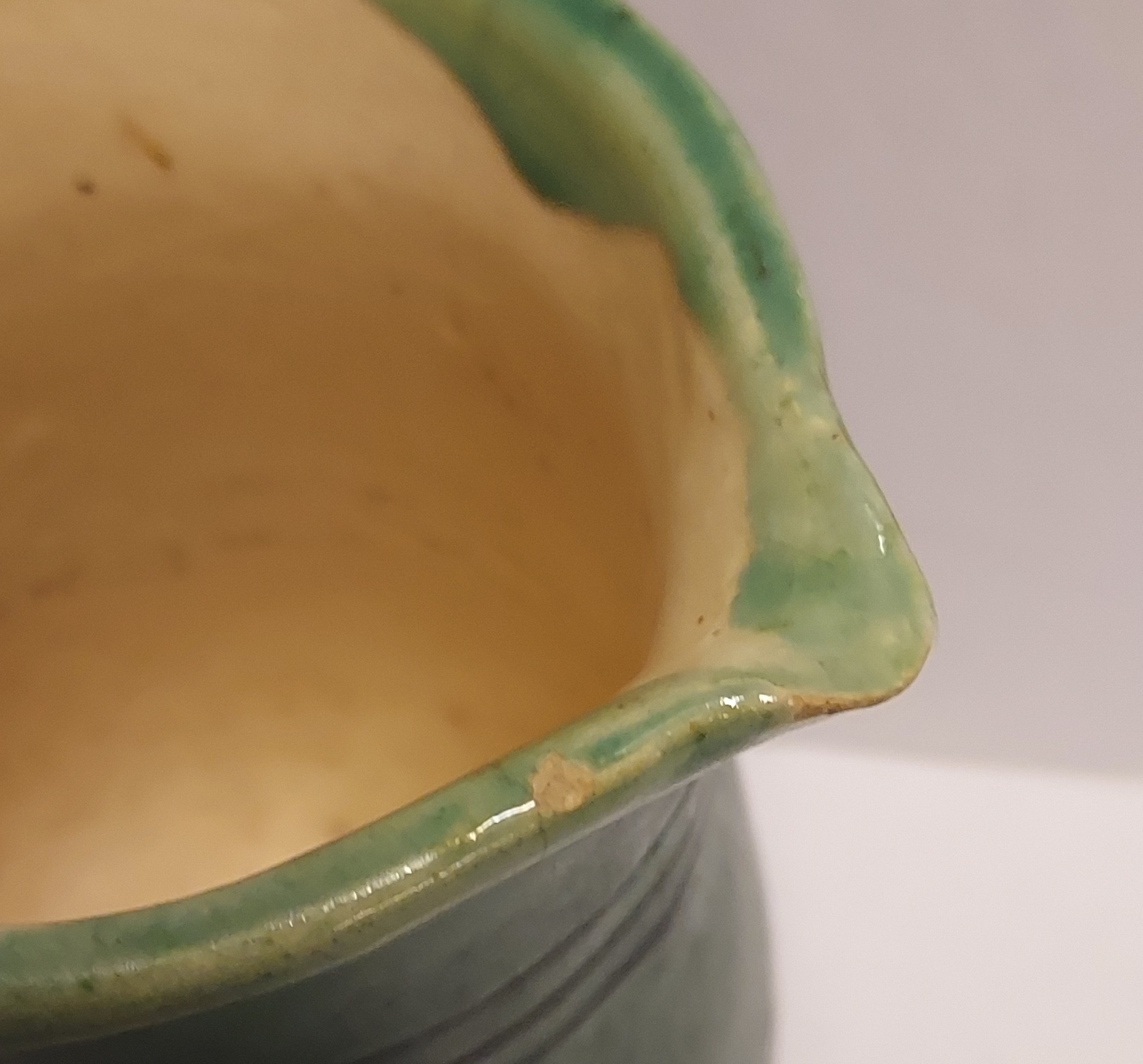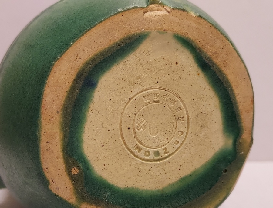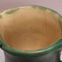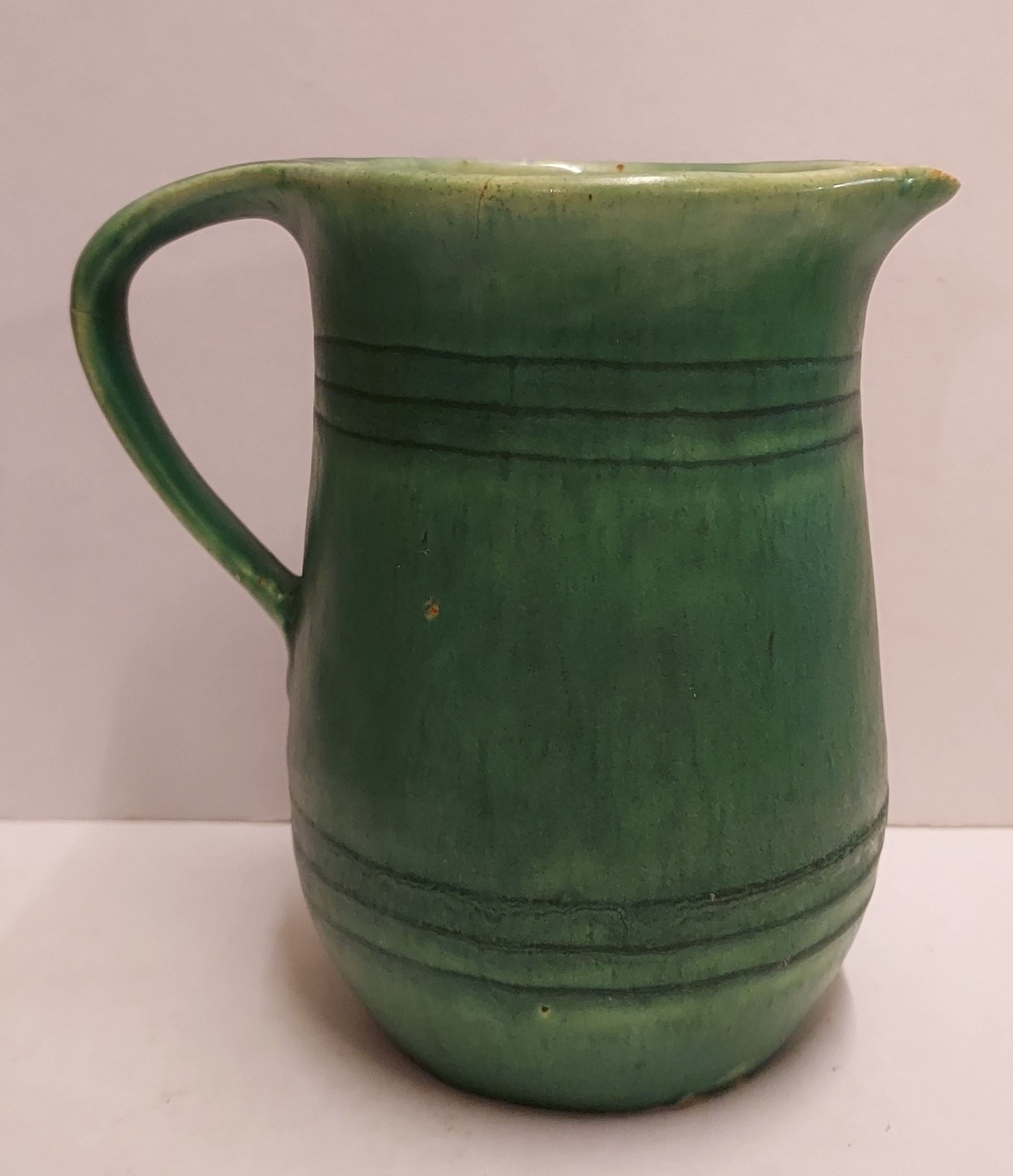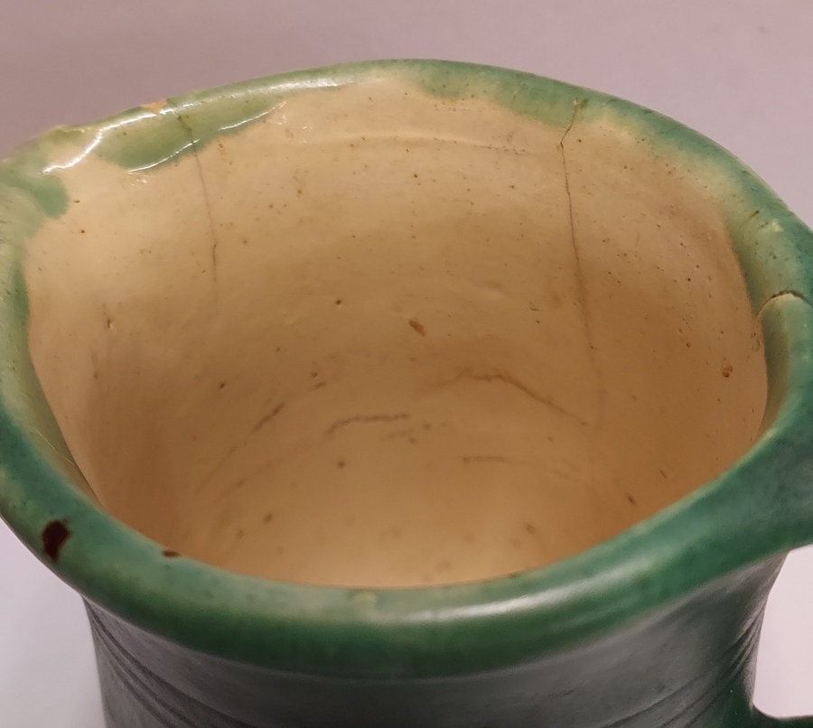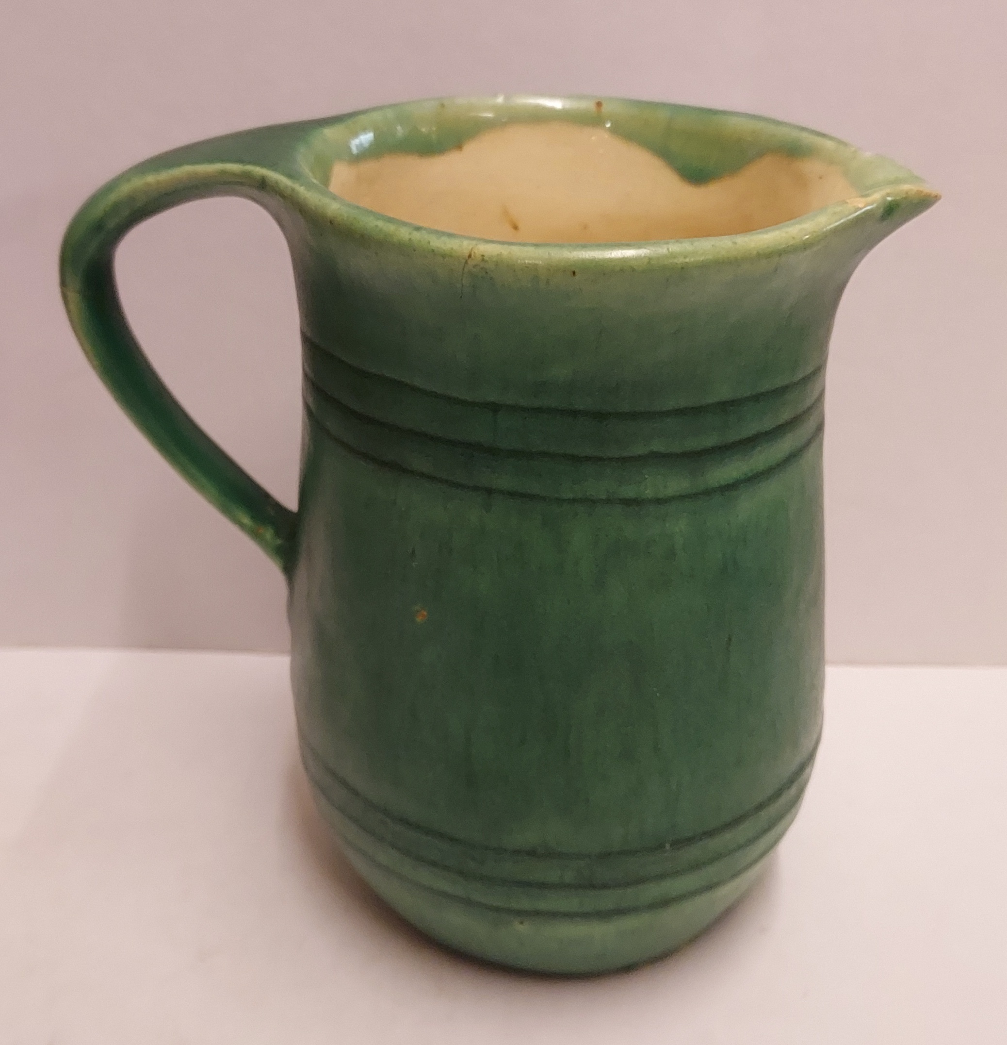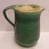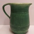 Grün glasierter Krug mit eingeritzten Bändern. Innenseite mit leichter Glasur. Unterseite mit Fabrikmarke.