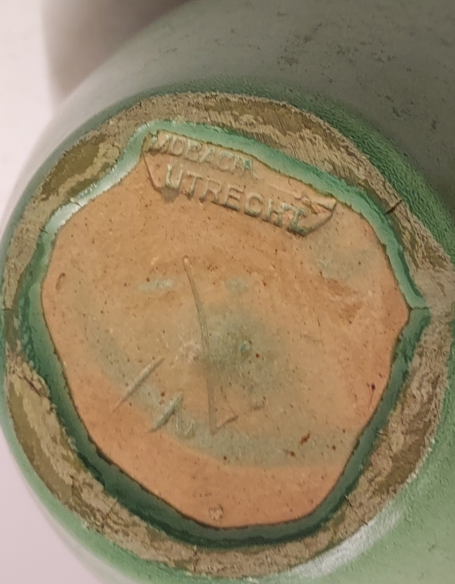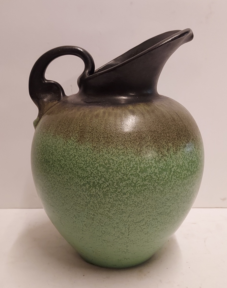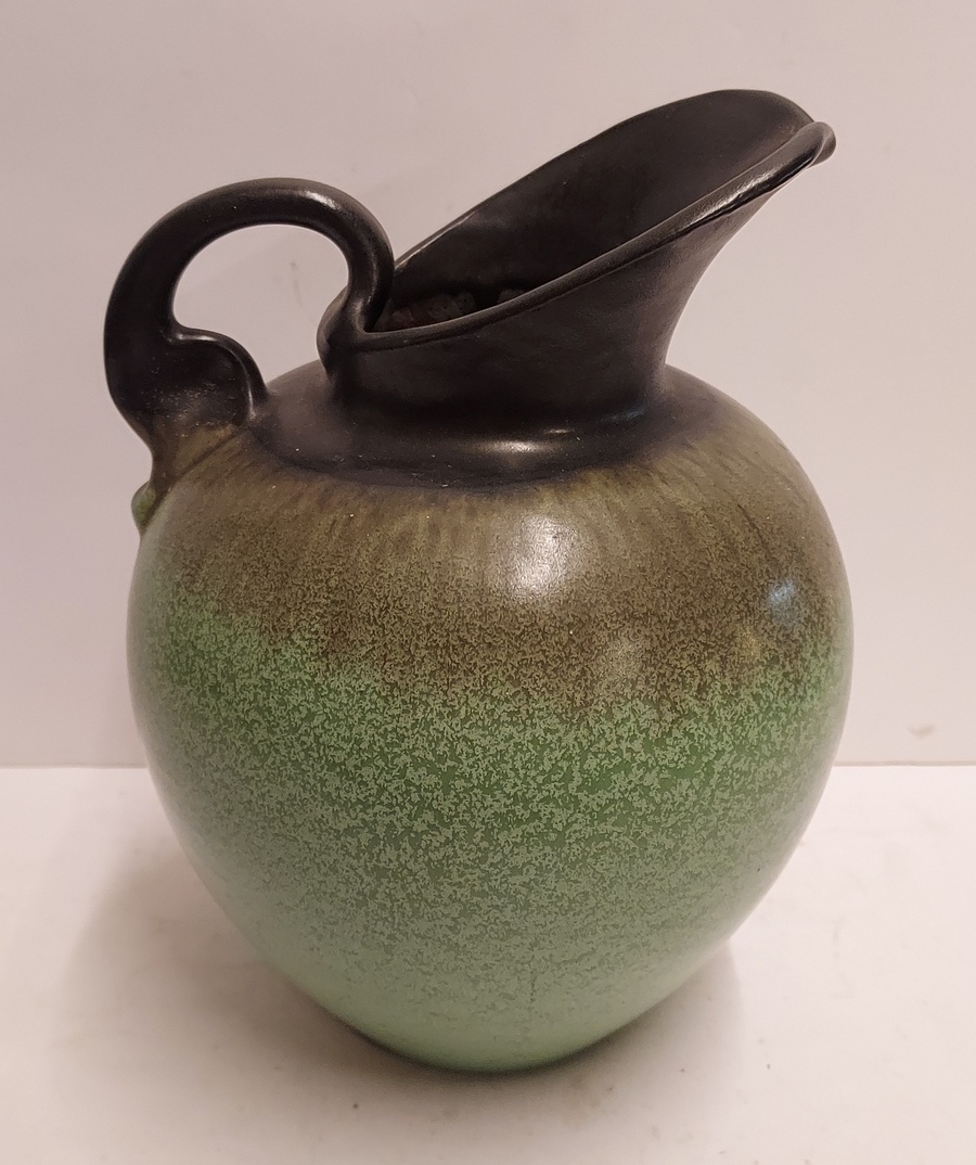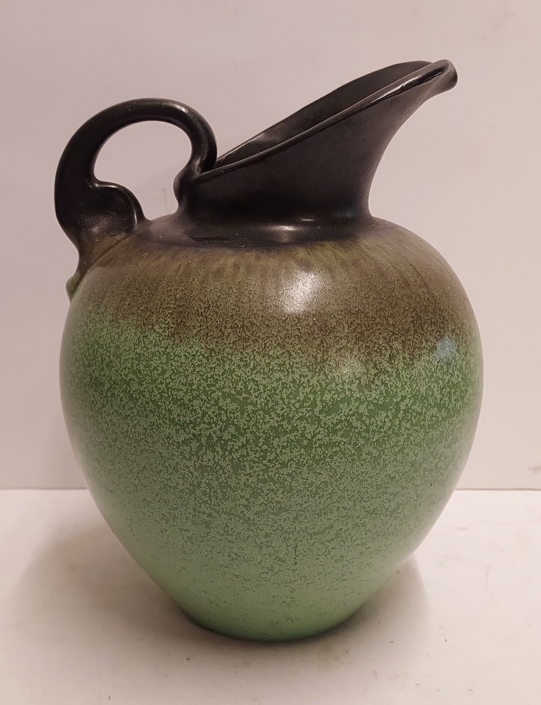 Art-Deco-Modell Schenkkanne mit grün-schwarzer Glasur. Unterseite mit Fabrikmarke.