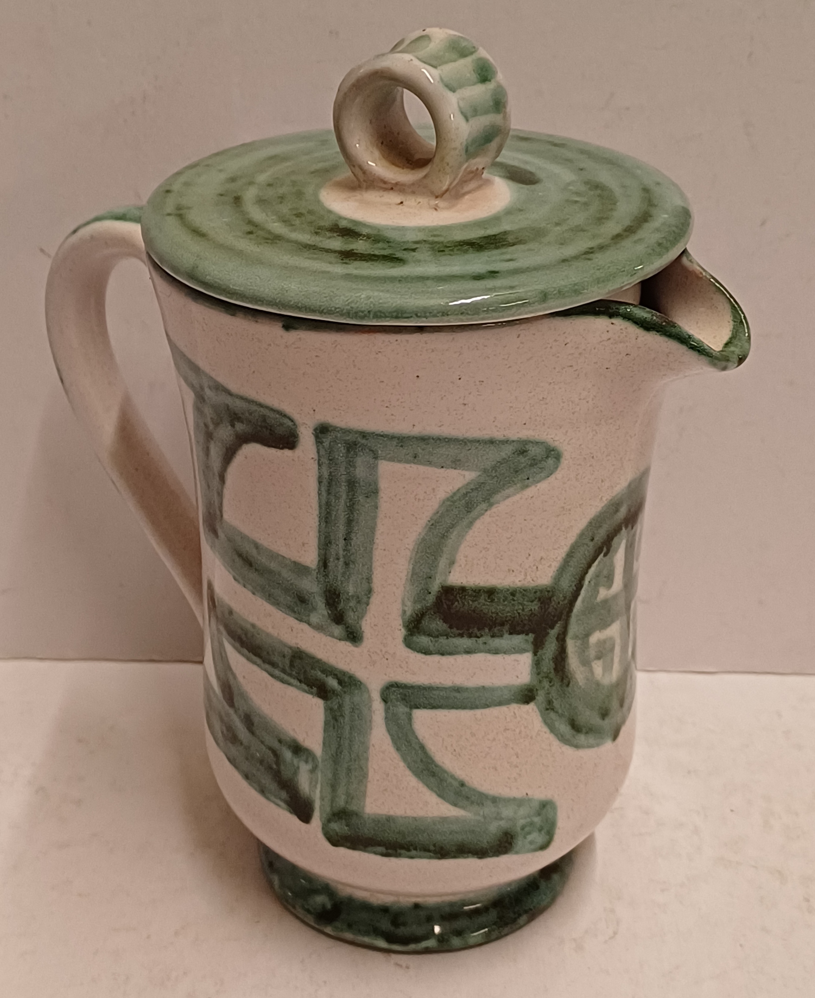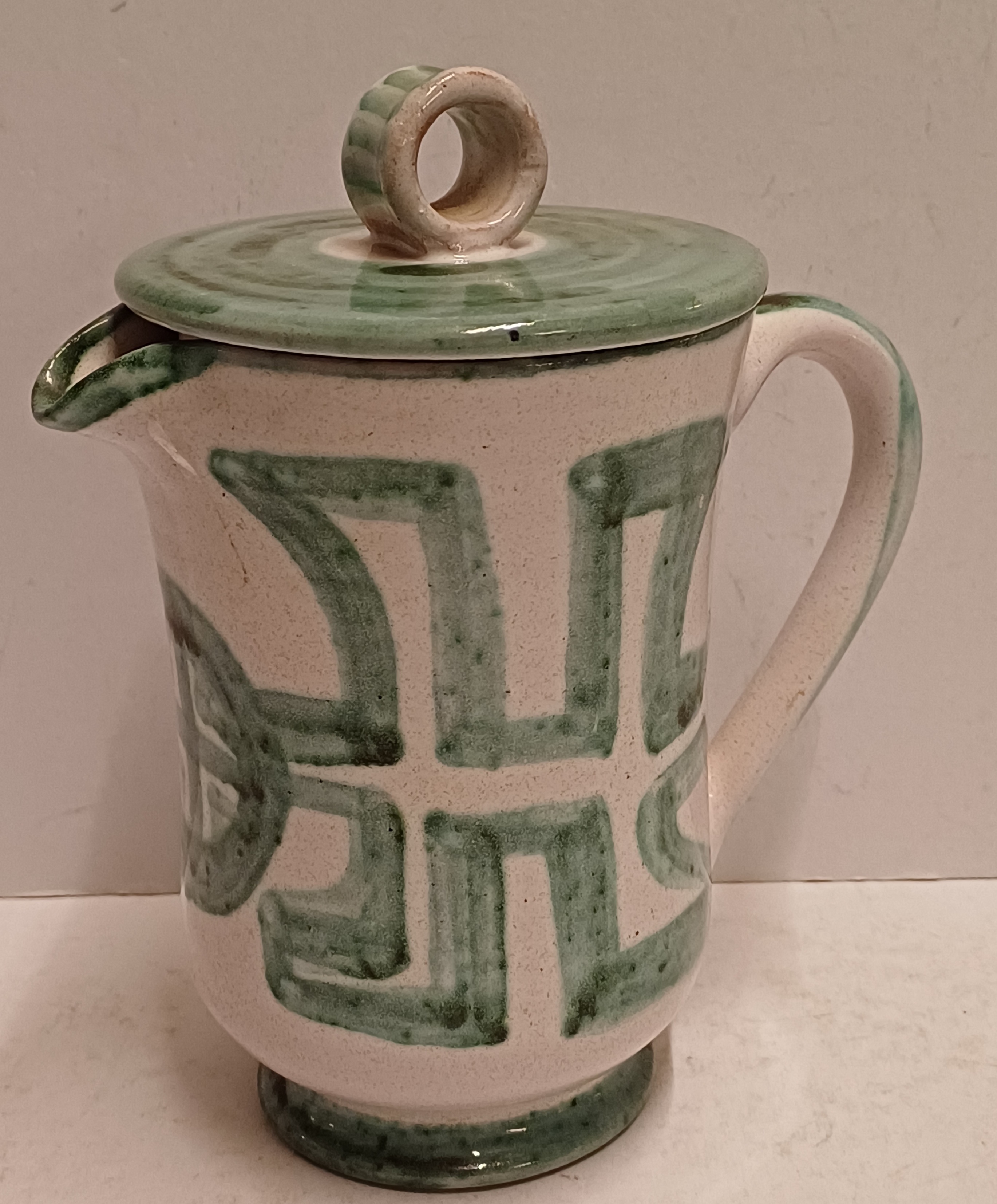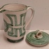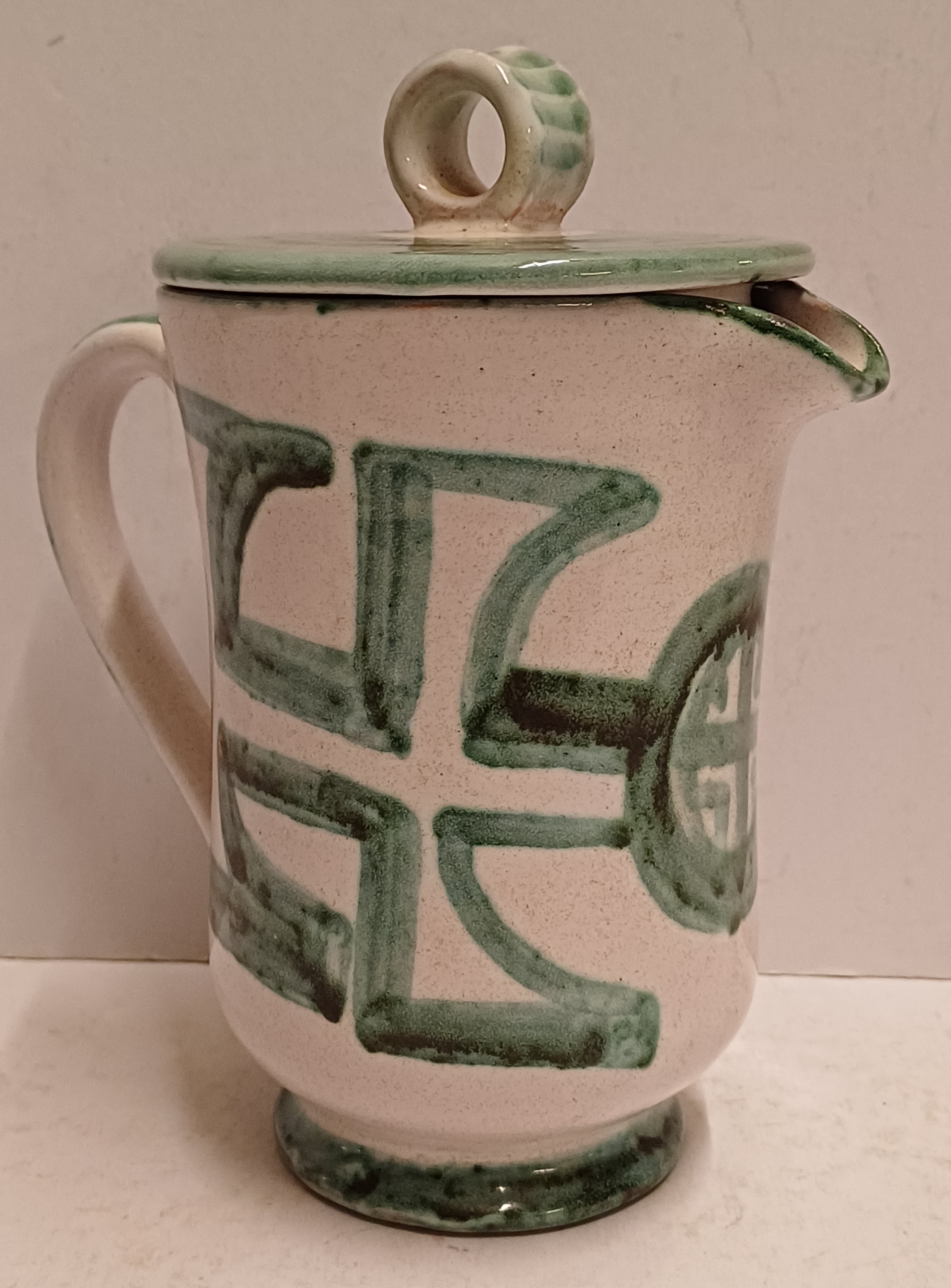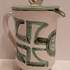 Steingut-Krug mit grüner gemalter Dekoration auf weißem Grund. Unterseite mit Signatur. Entwurf und Ausführung Simon Engelhard.