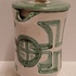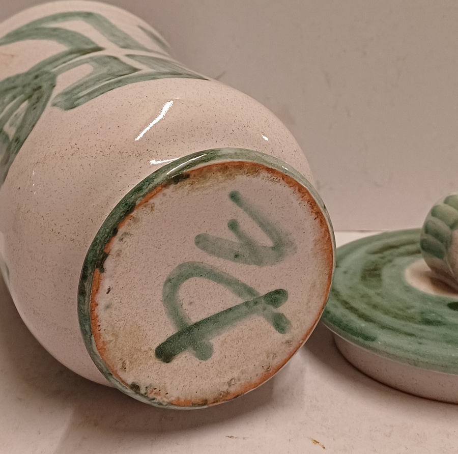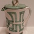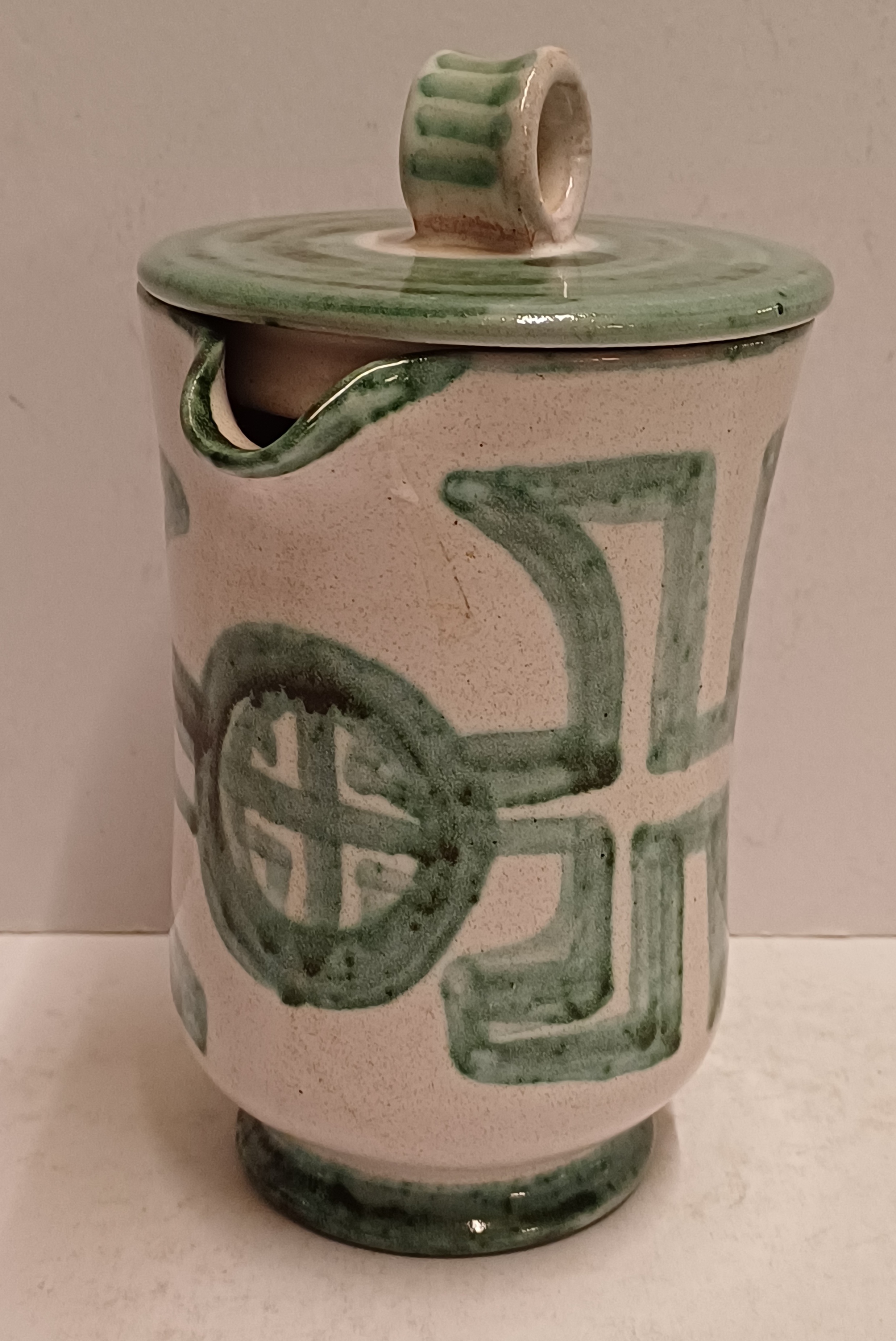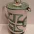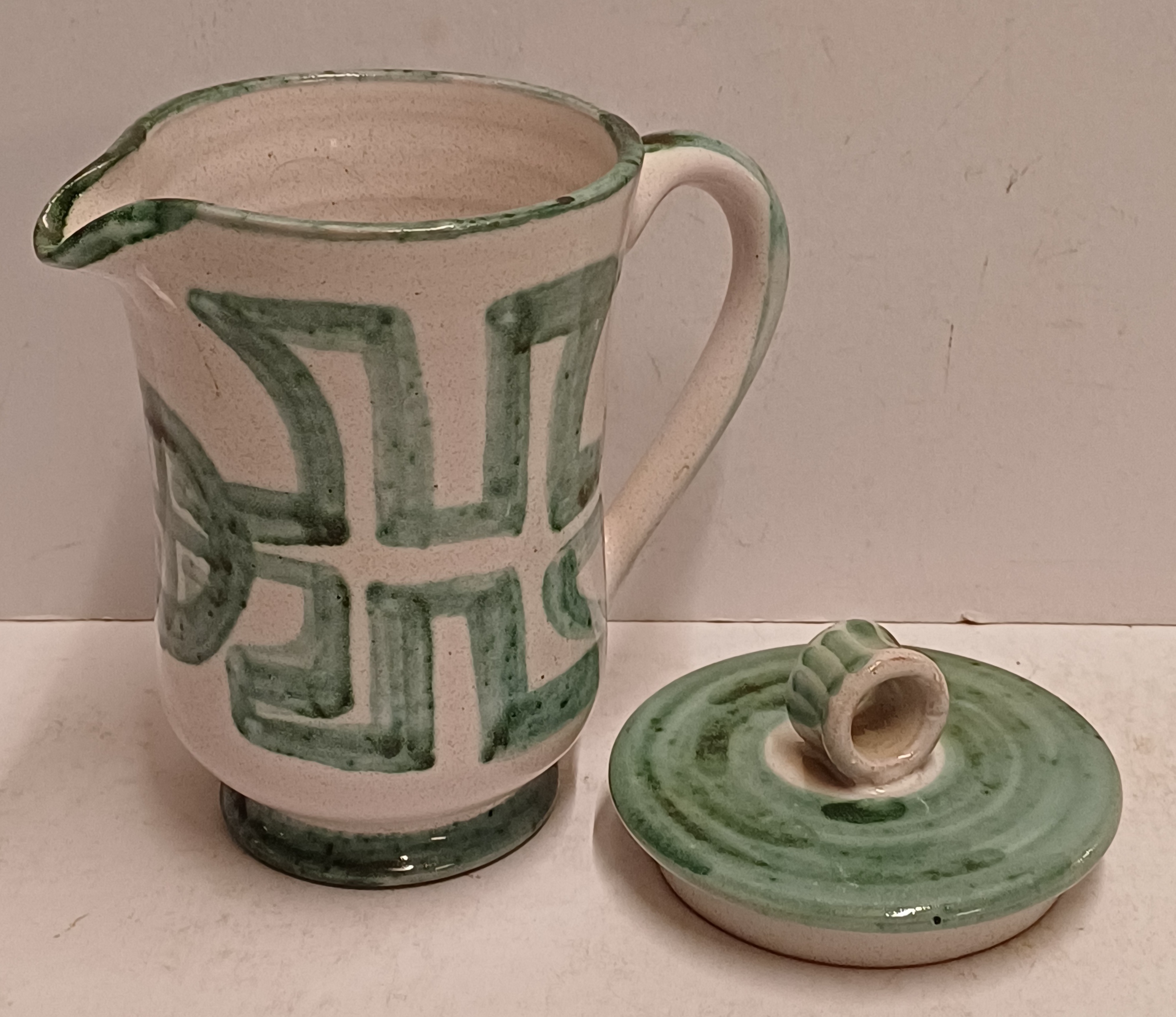 Steingut-Krug mit grüner gemalter Dekoration auf weißem Grund. Unterseite mit Signatur. Entwurf und Ausführung Simon Engelhard.