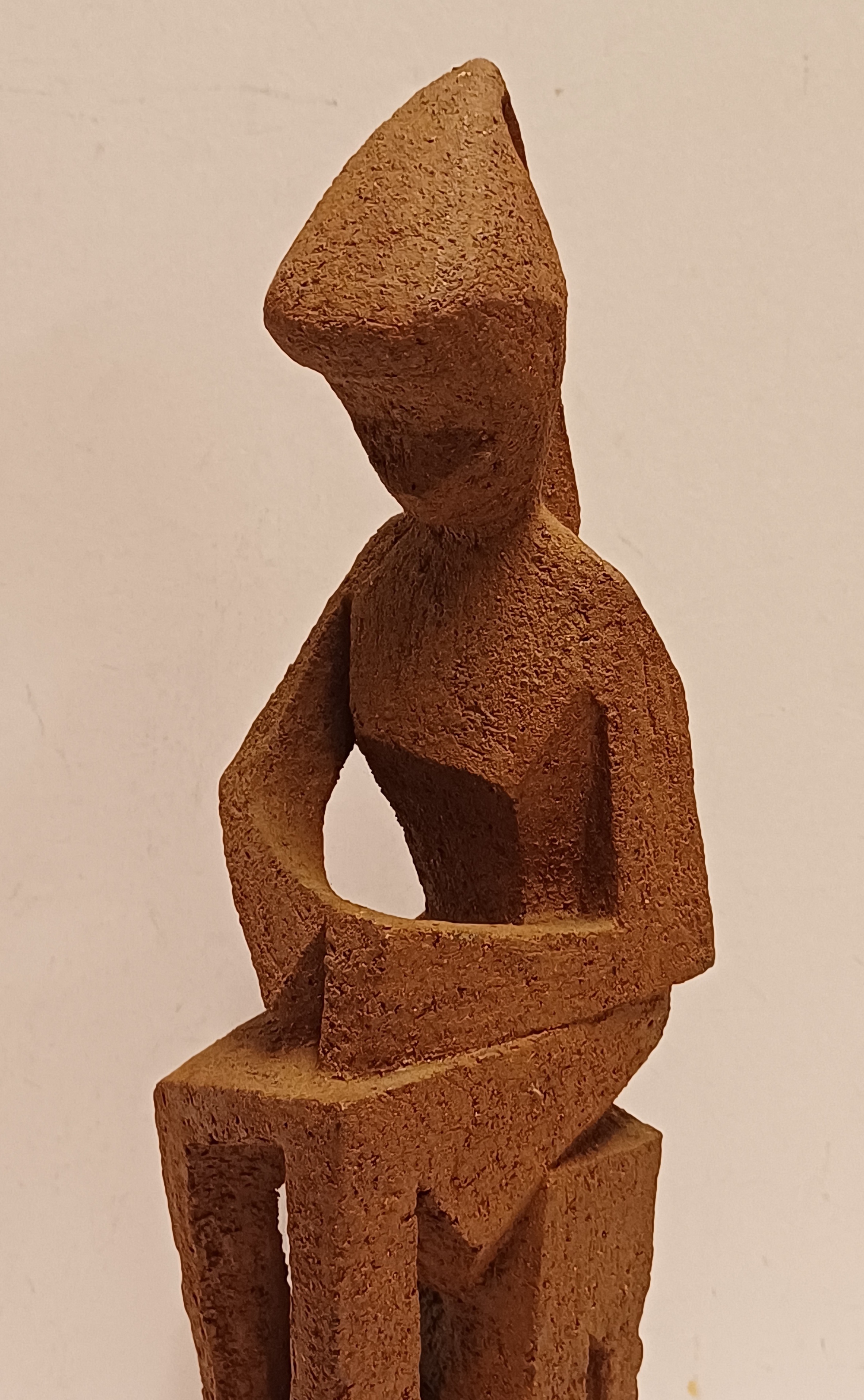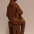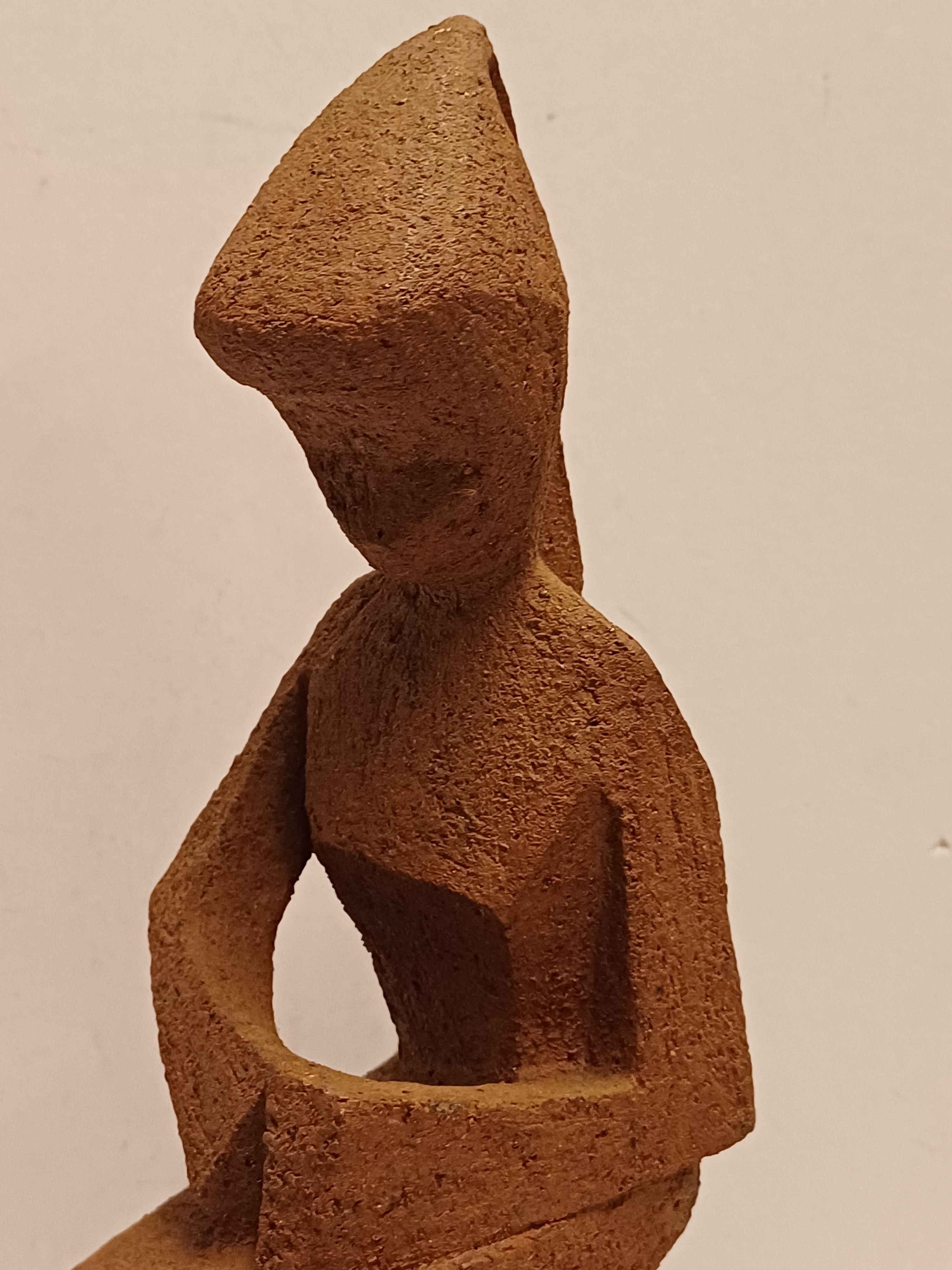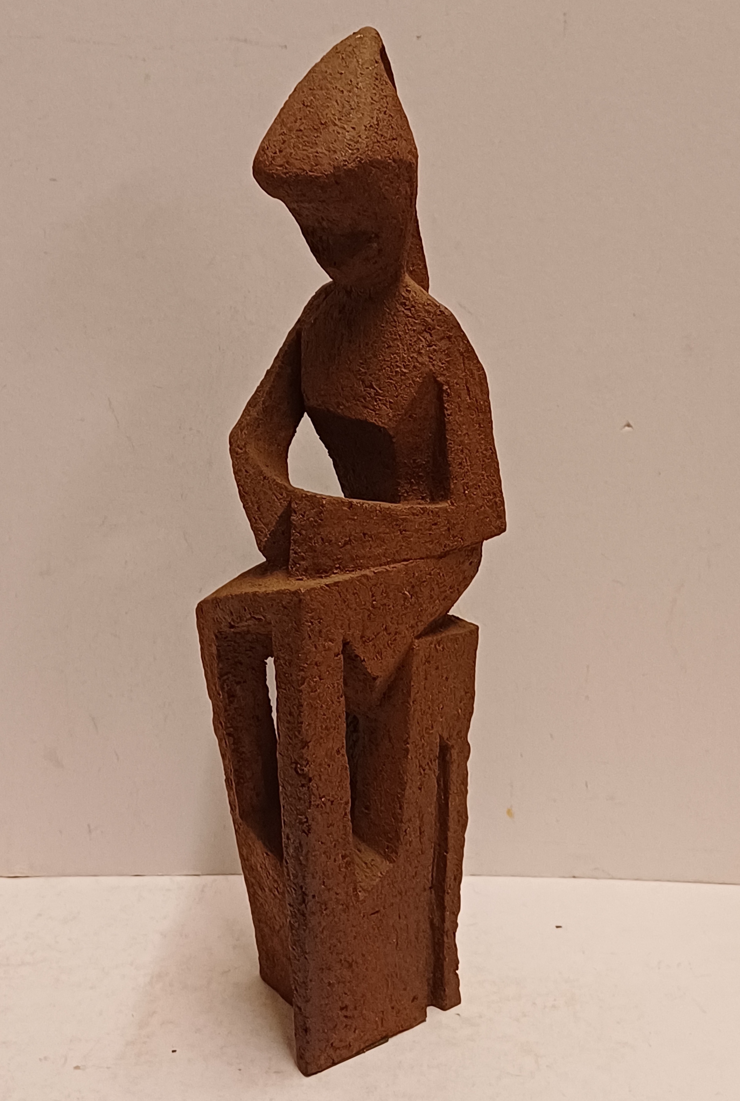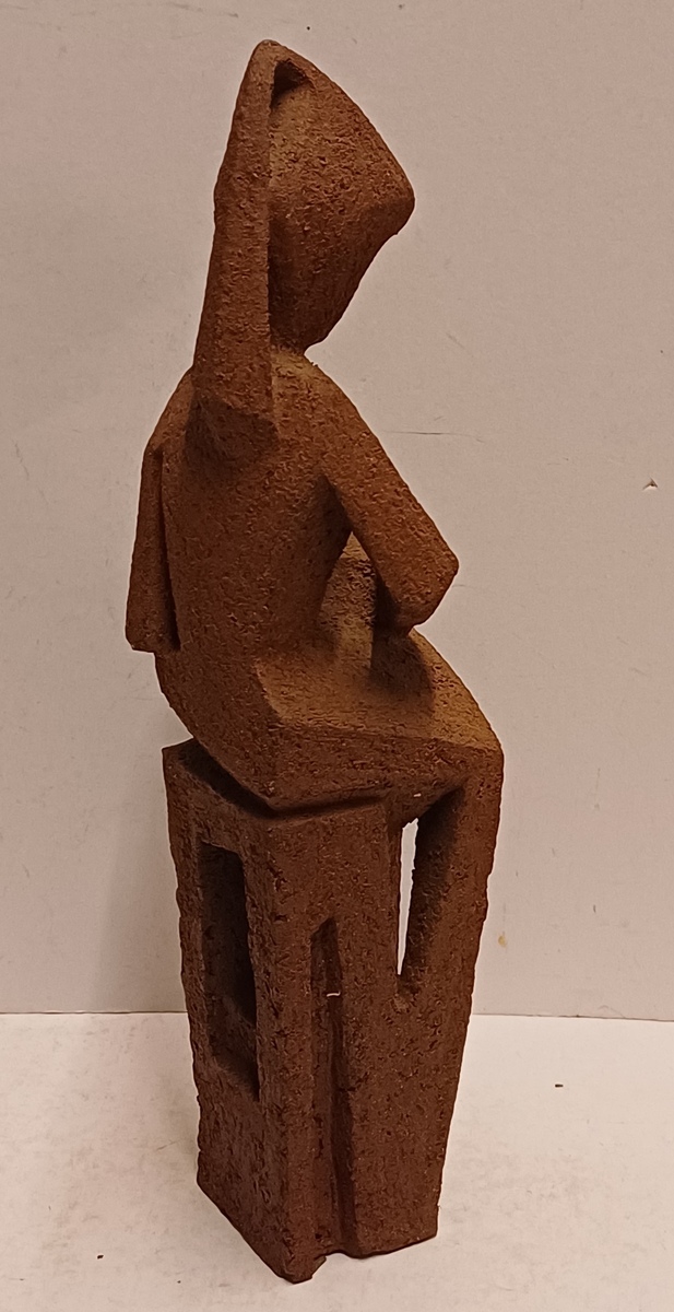 Aardewerken sculptuur van een zittende dame. Onderzijde gesigneerd