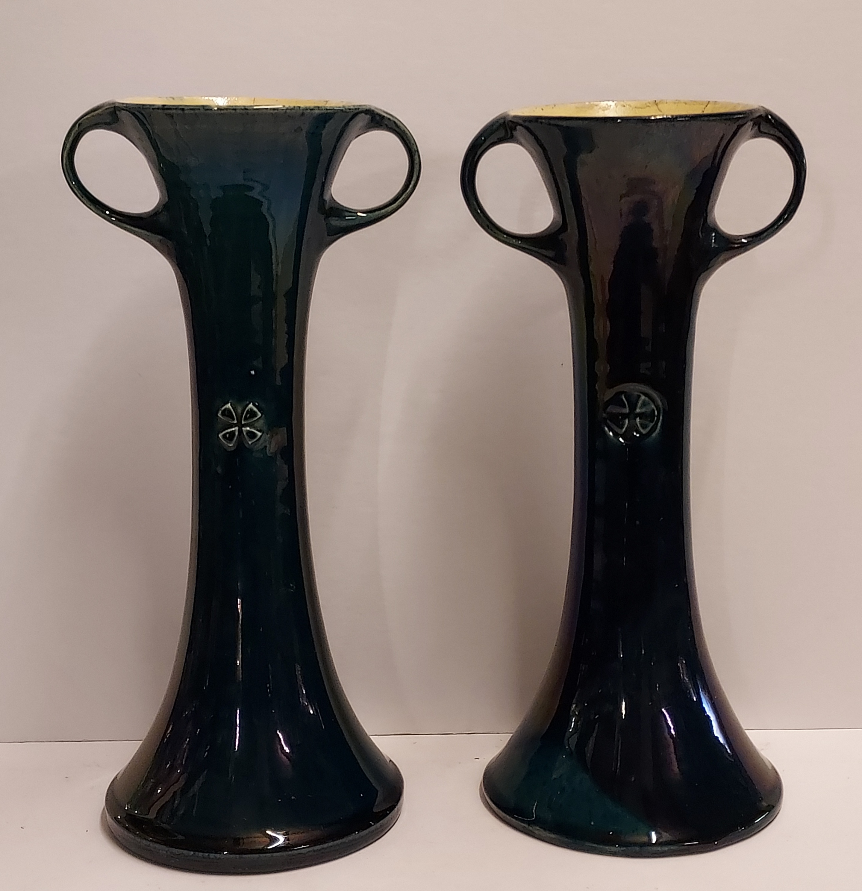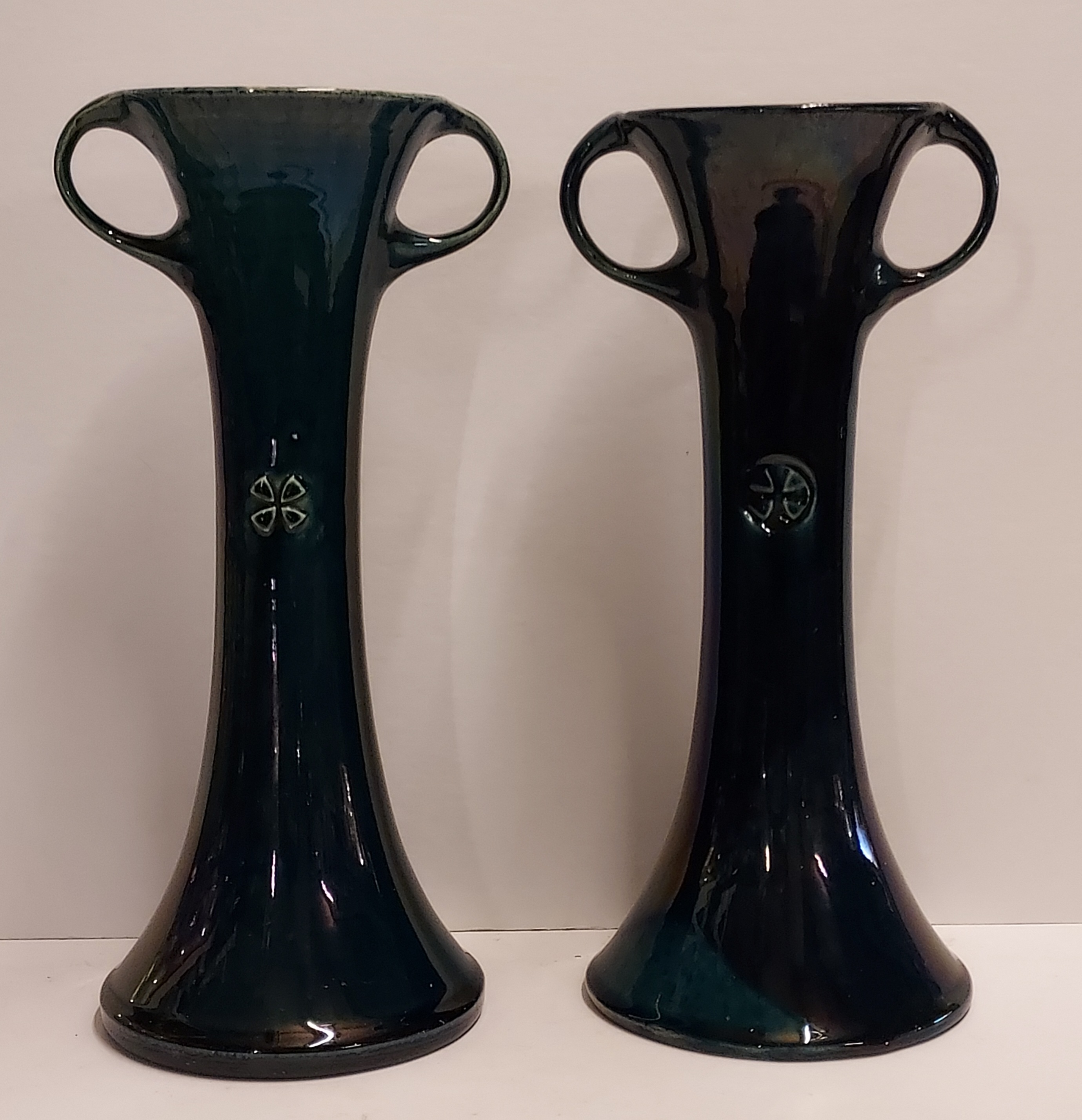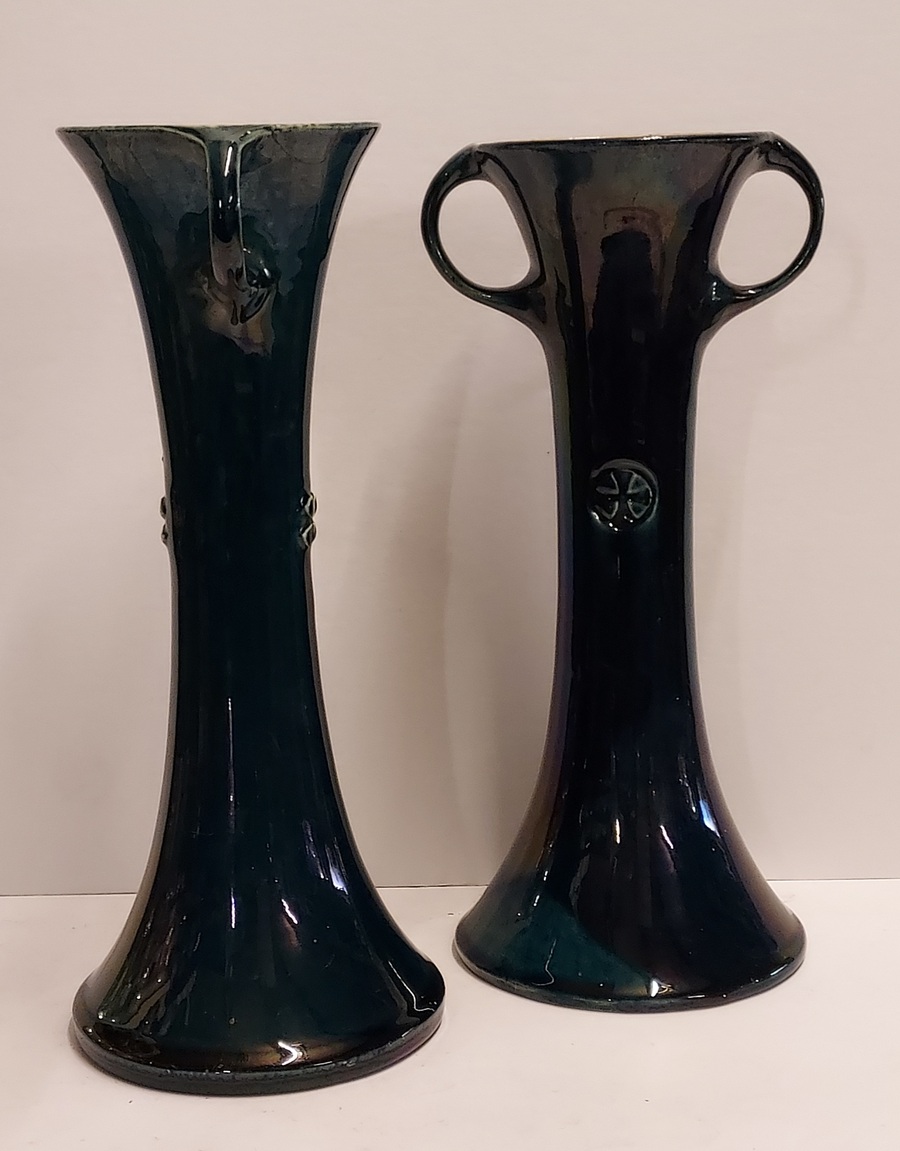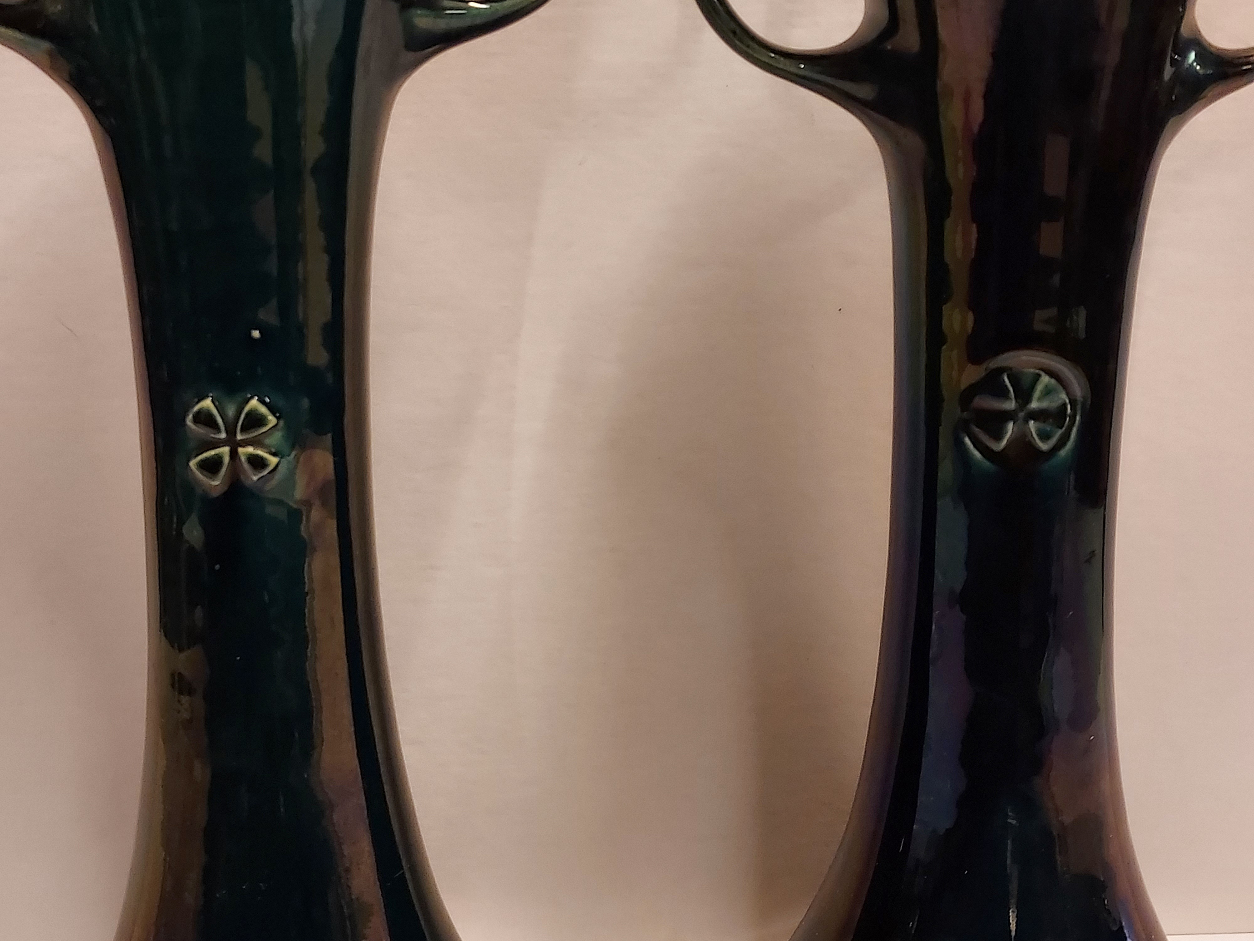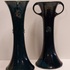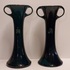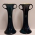 Ein Paar Vasen mit Henkeln und geometrischem Relief mit dunkelblauer Glasur. Entwurf von Chris van de Hoef. Unterseite mit Fabrikmarke.