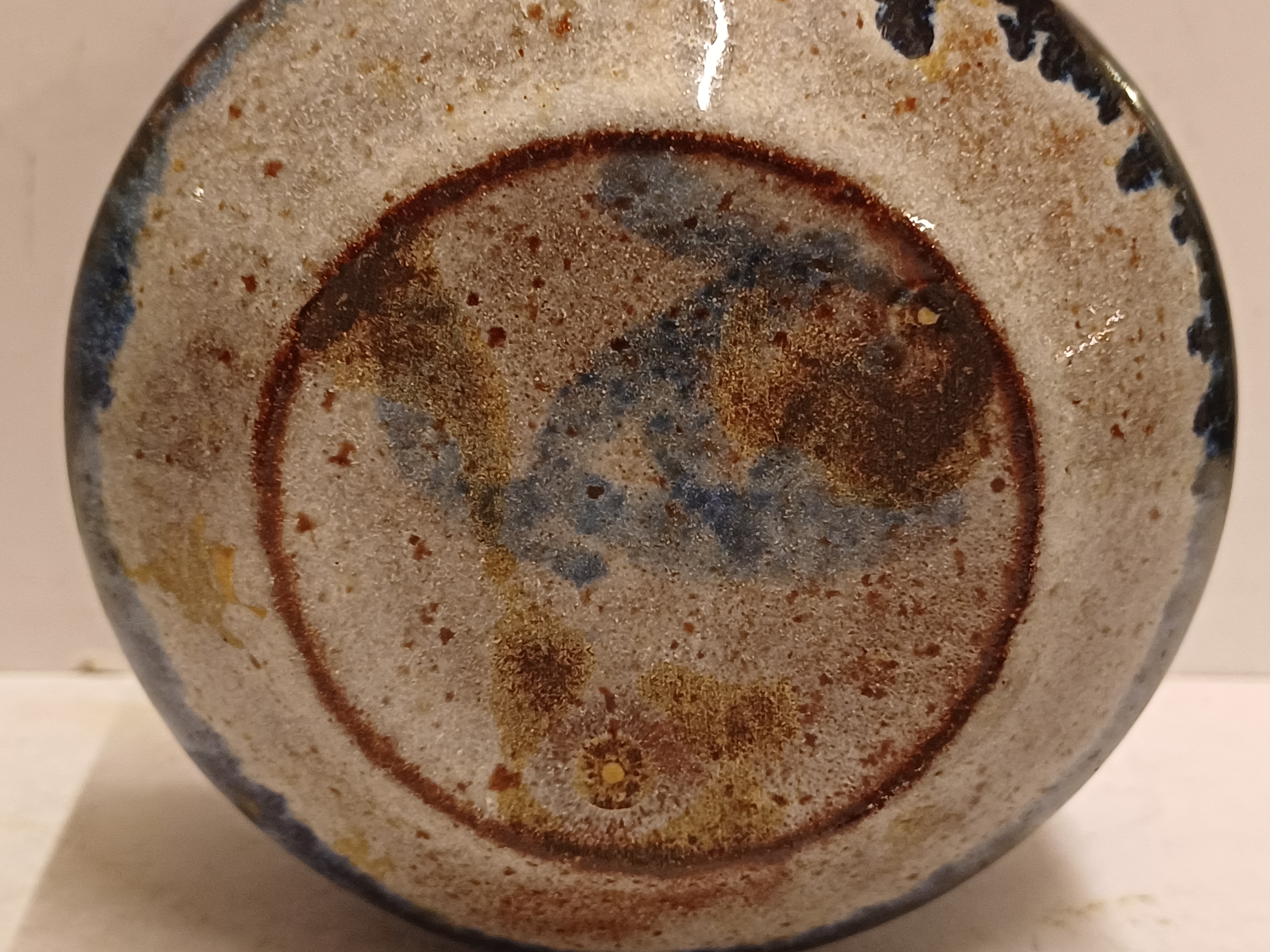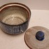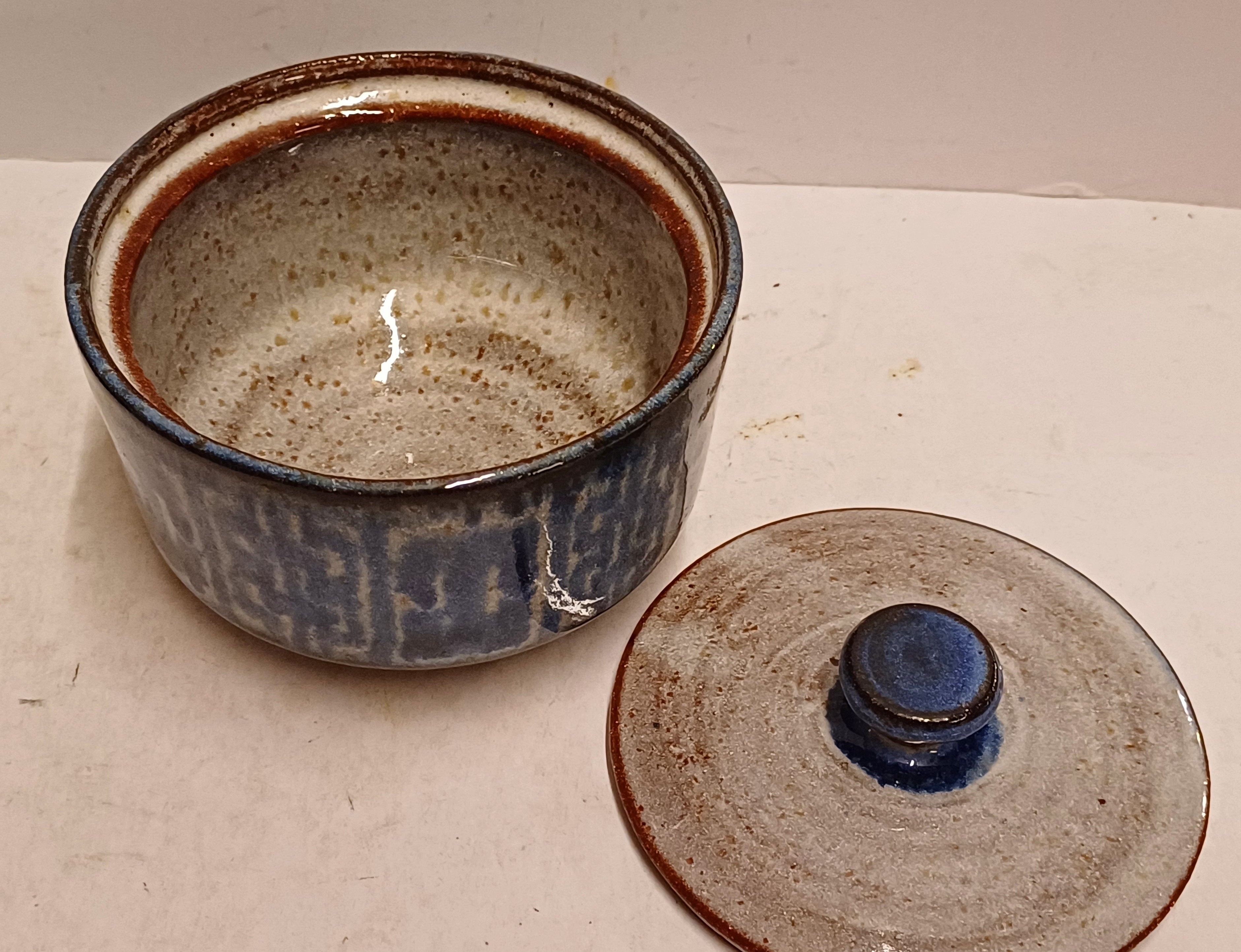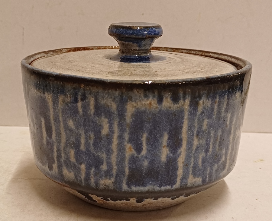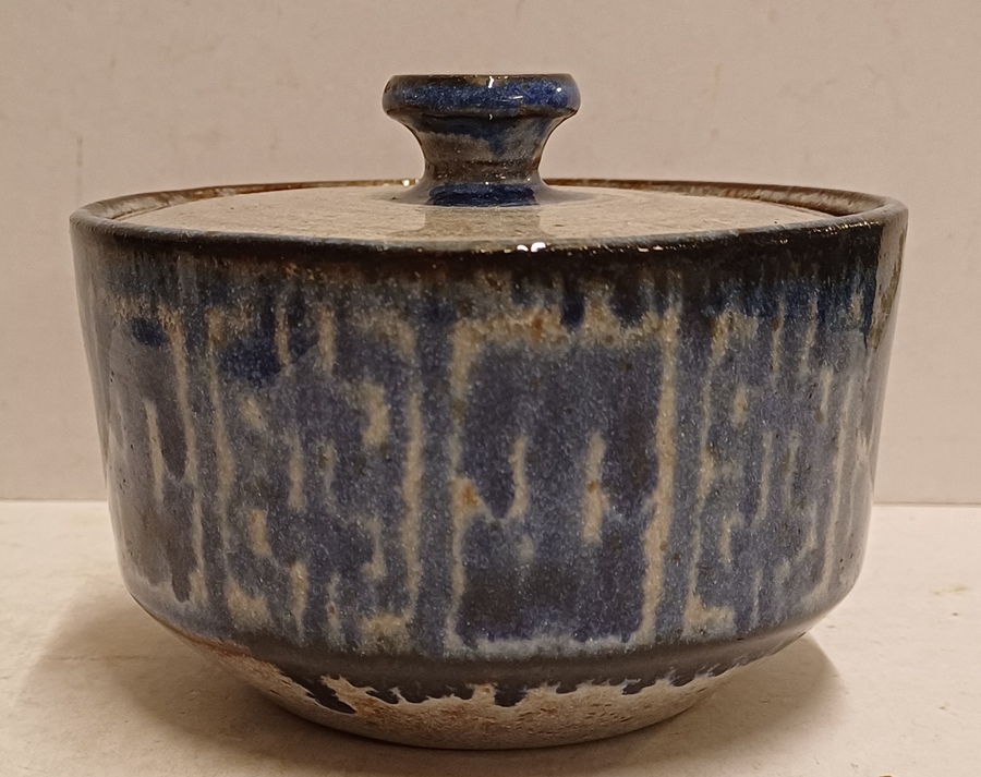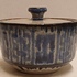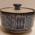 Aardewerken suikerpot met geometrische decoratie in blauw op grijze ondergrond. Onderzijde gemerkt.