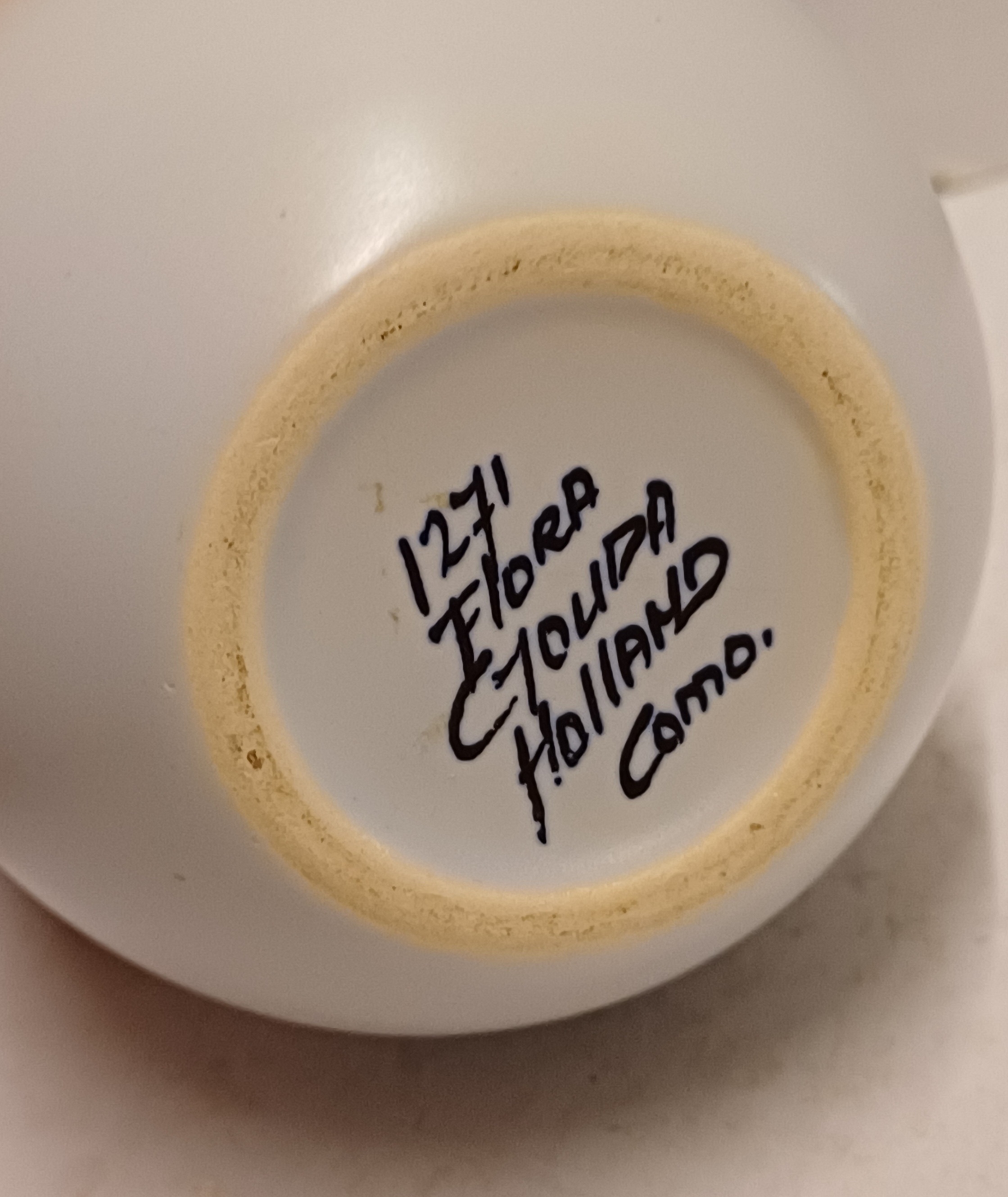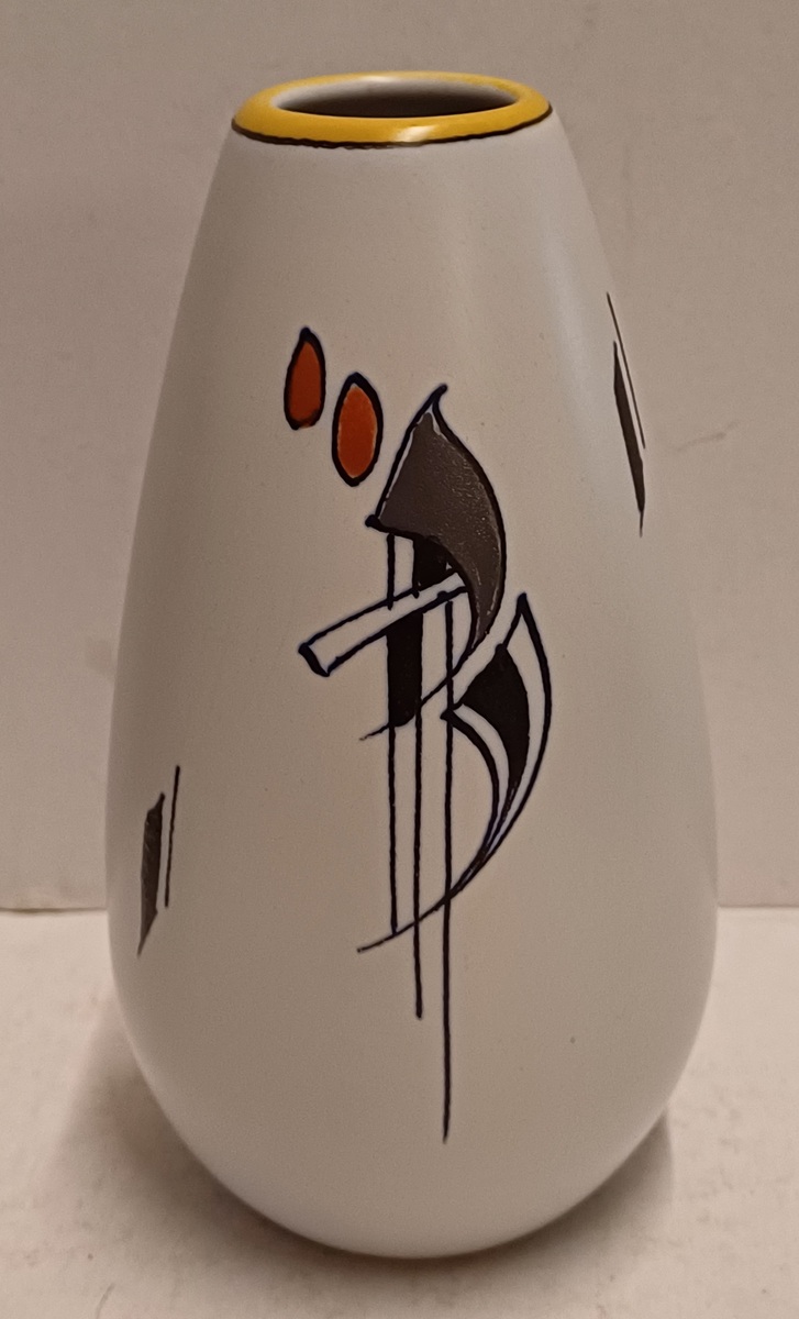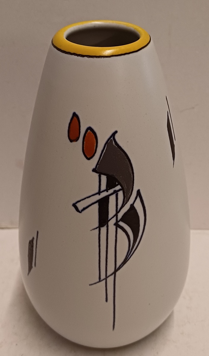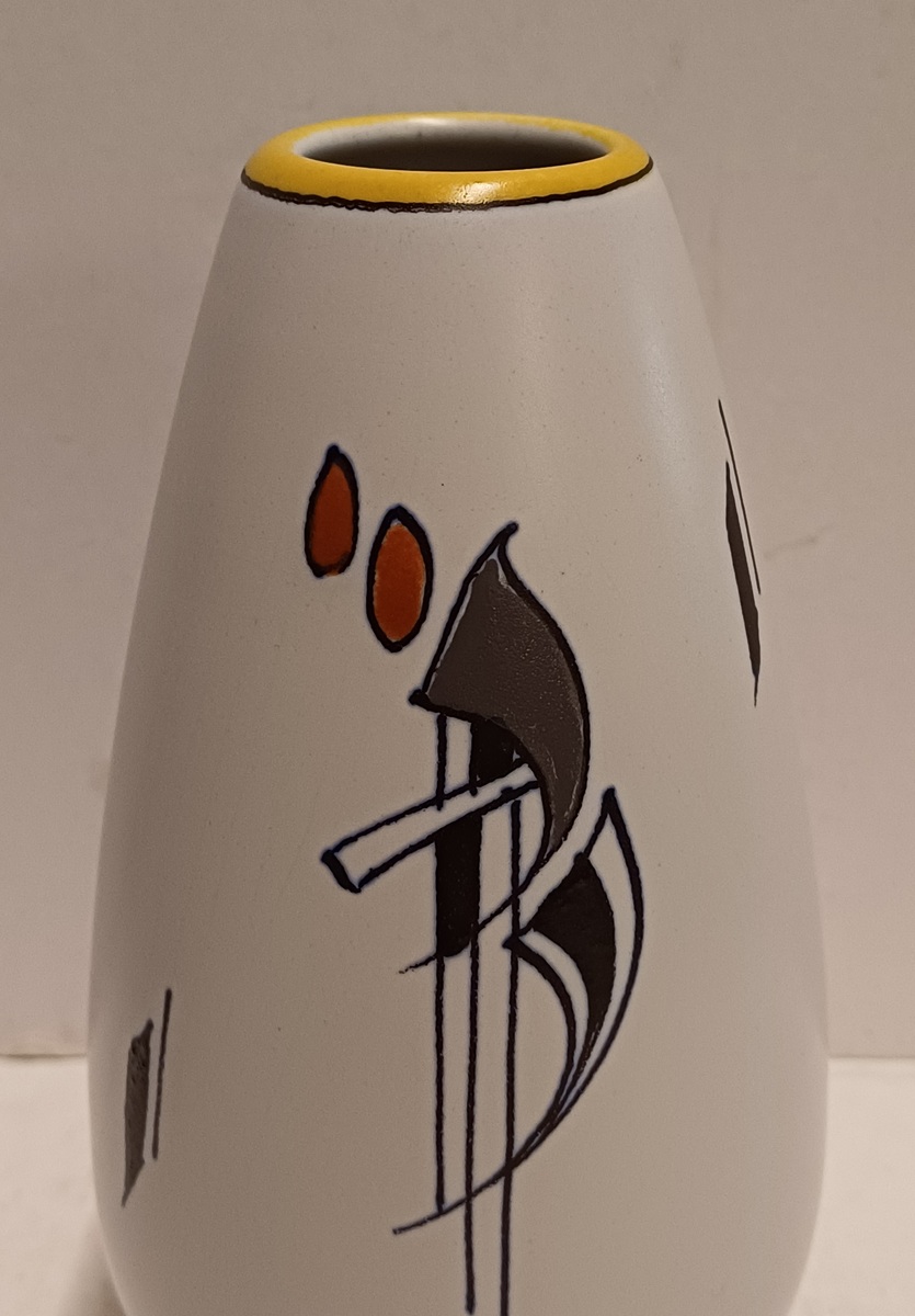 Plateel Vase mit Sixties-Dekor Como. Unterseite mit gemaltem Markenzeichen und Modellnummer.