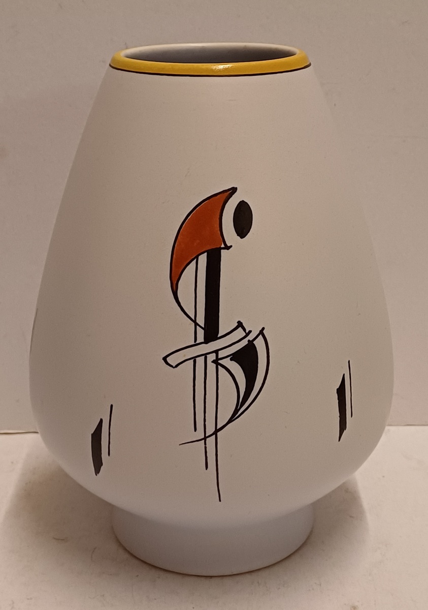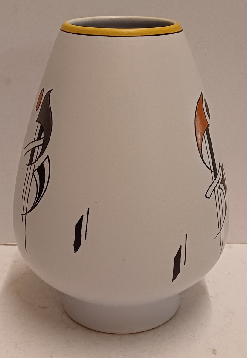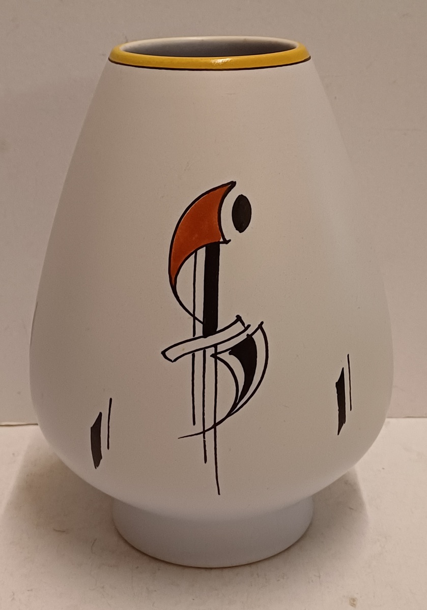 Plateel Vase mit Sixties-Dekor Como. Unterseite mit gemaltem Markenzeichen und Modellnummer.