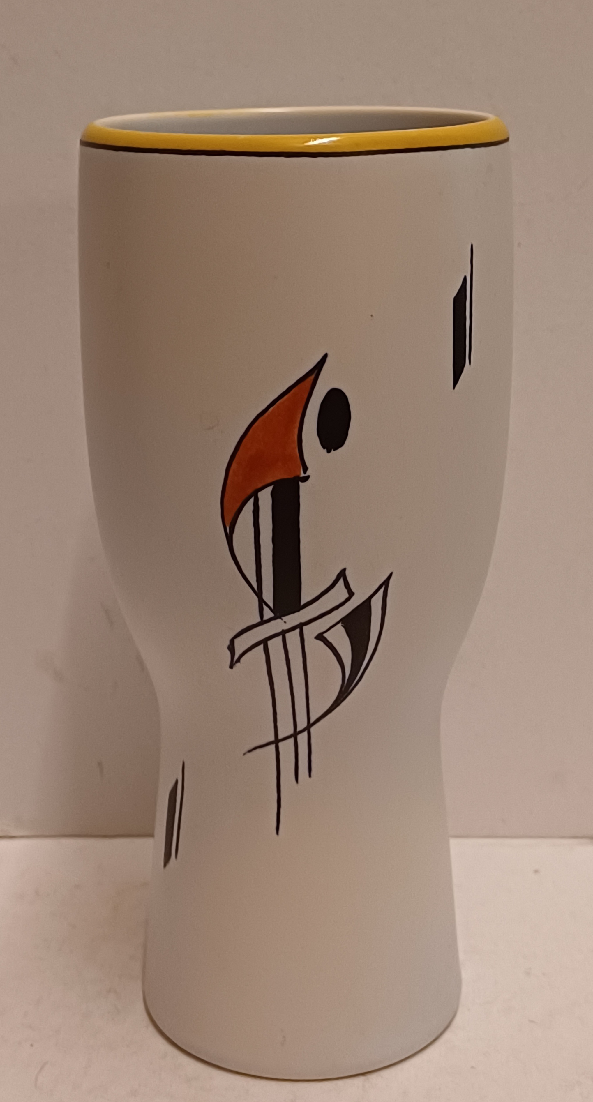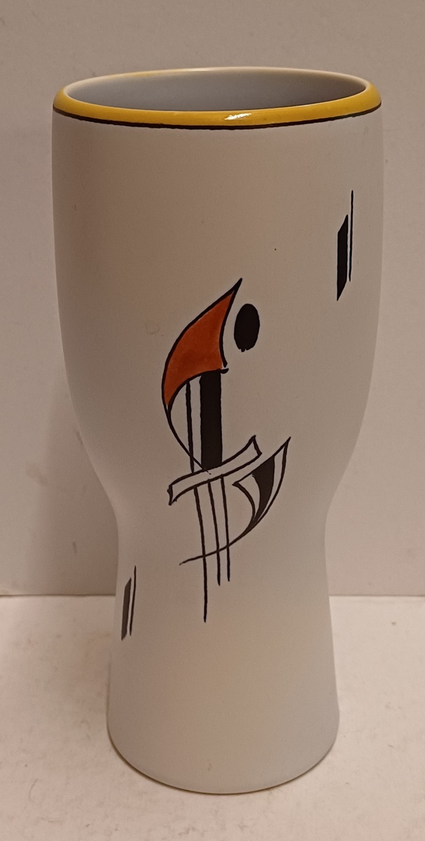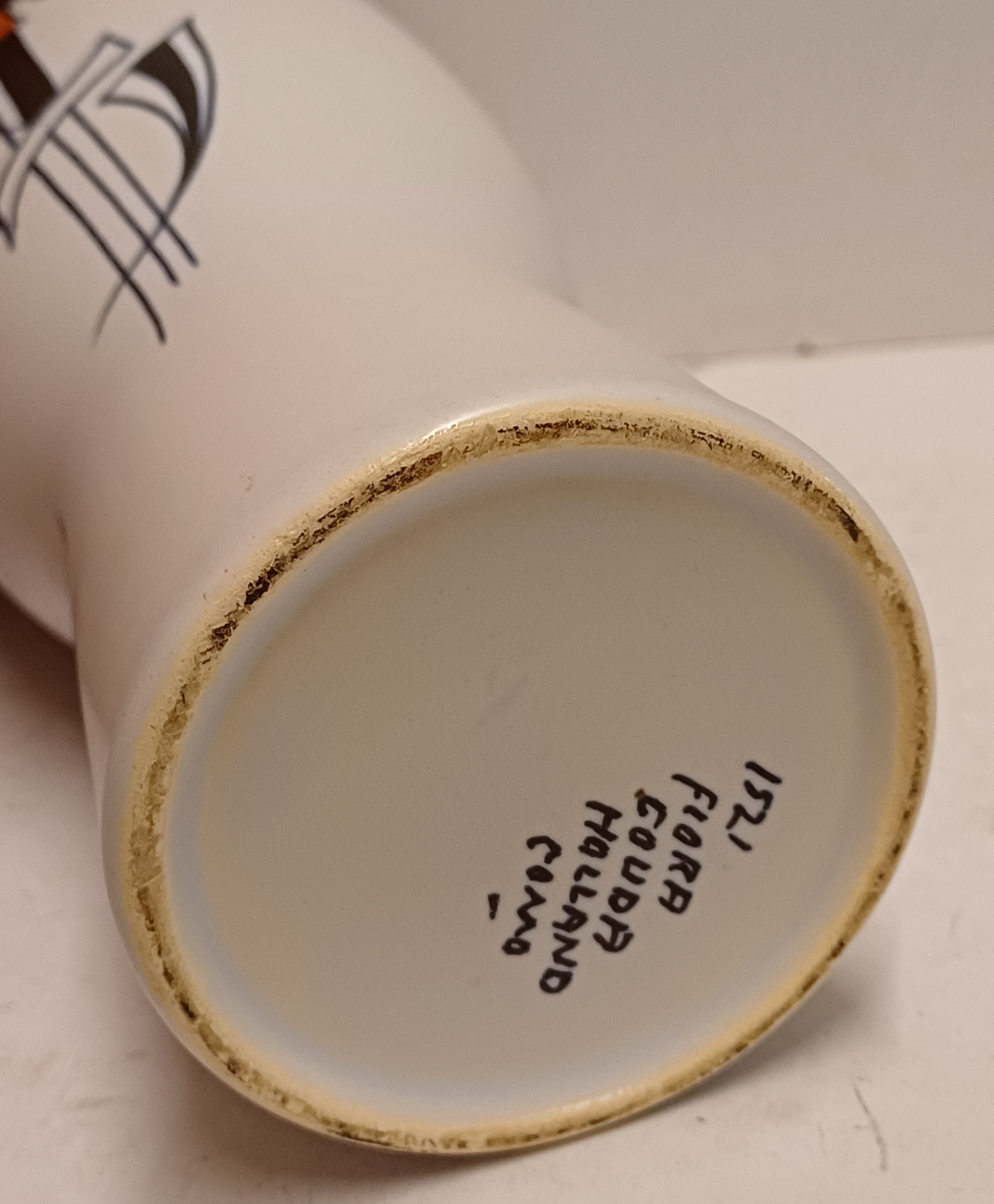 Plateel Vase mit Sixties-Dekor Como. Unterseite mit gemaltem Markenzeichen und Modellnummer.
