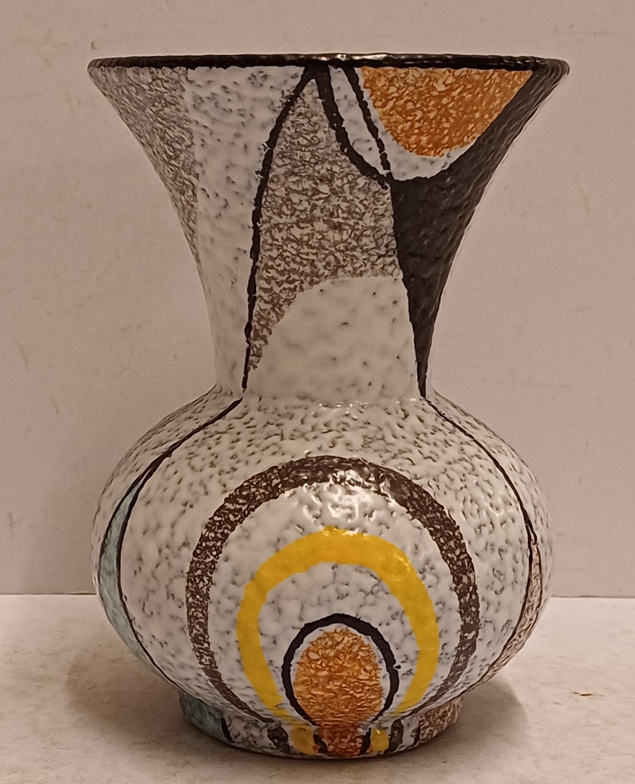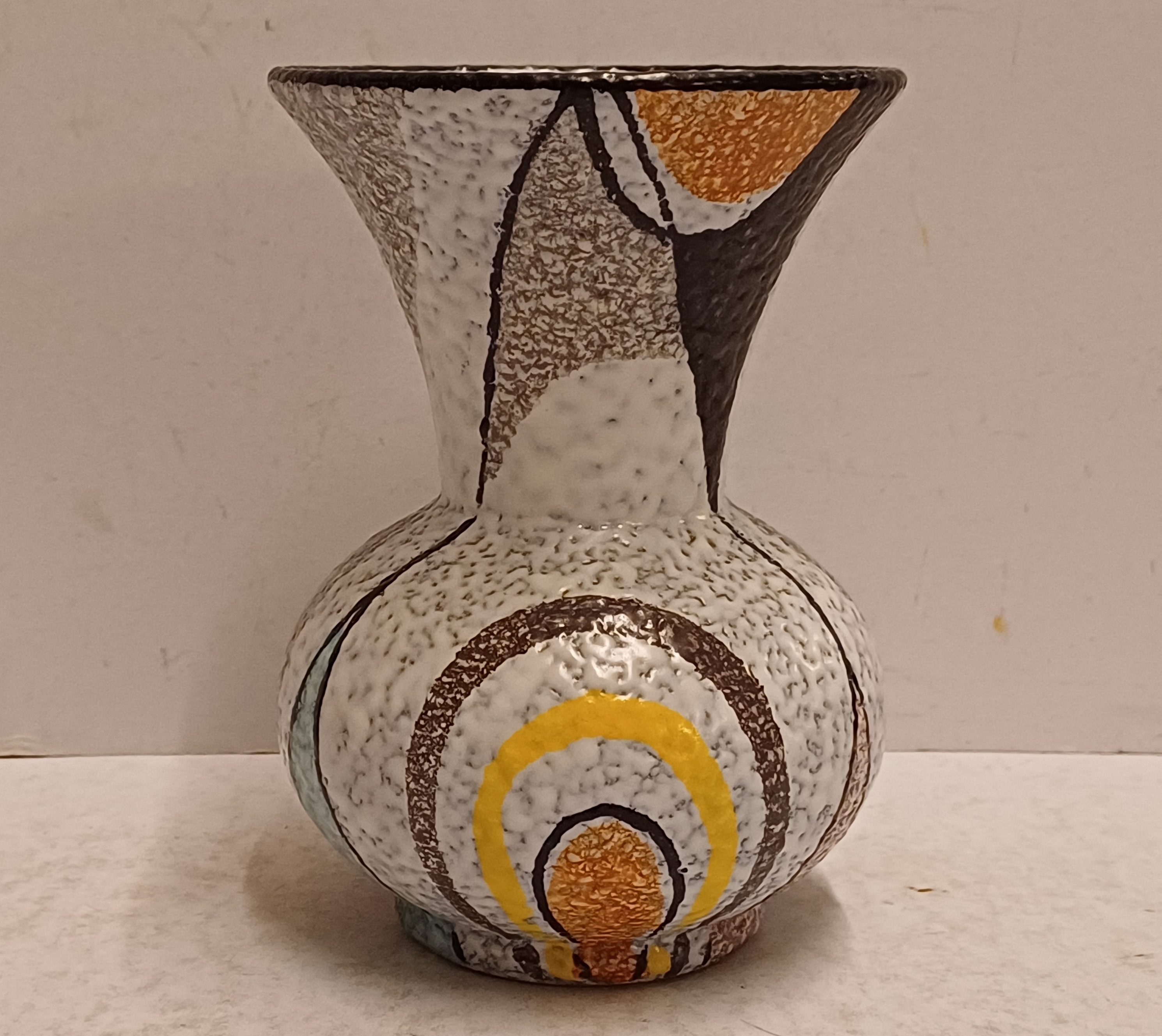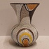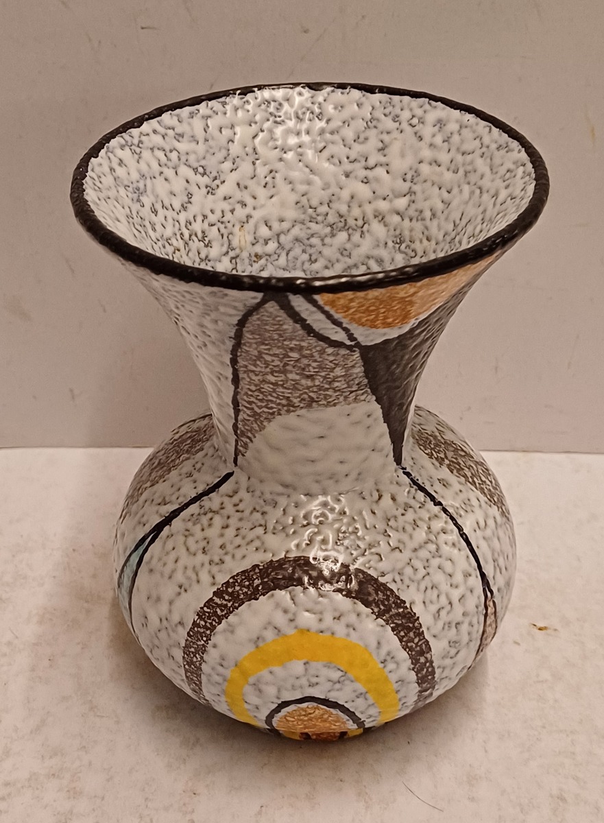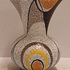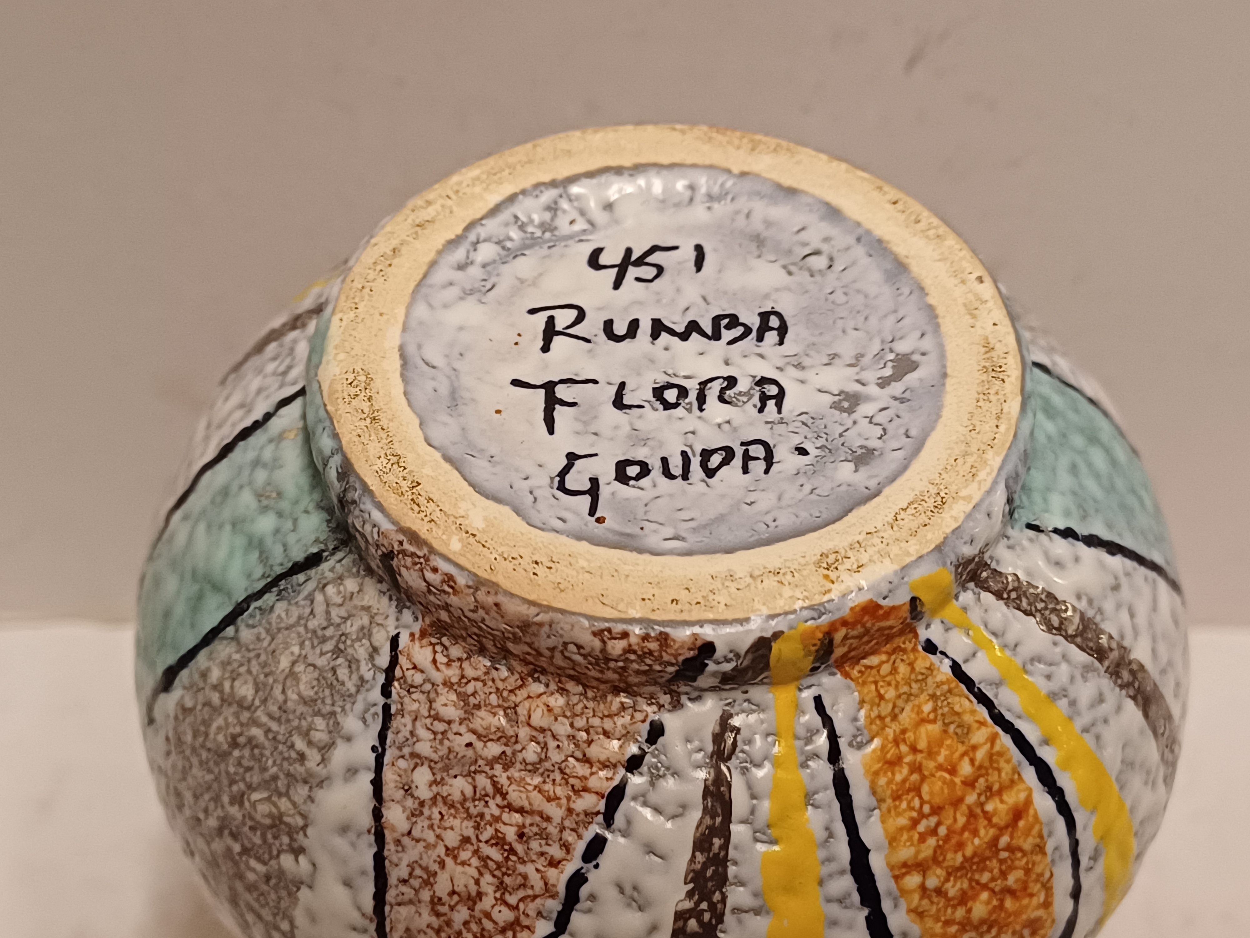 Platelen vaasje met decor Rumba op grijs fond. Onderzijde met fabrieksmerk en modelnummer.