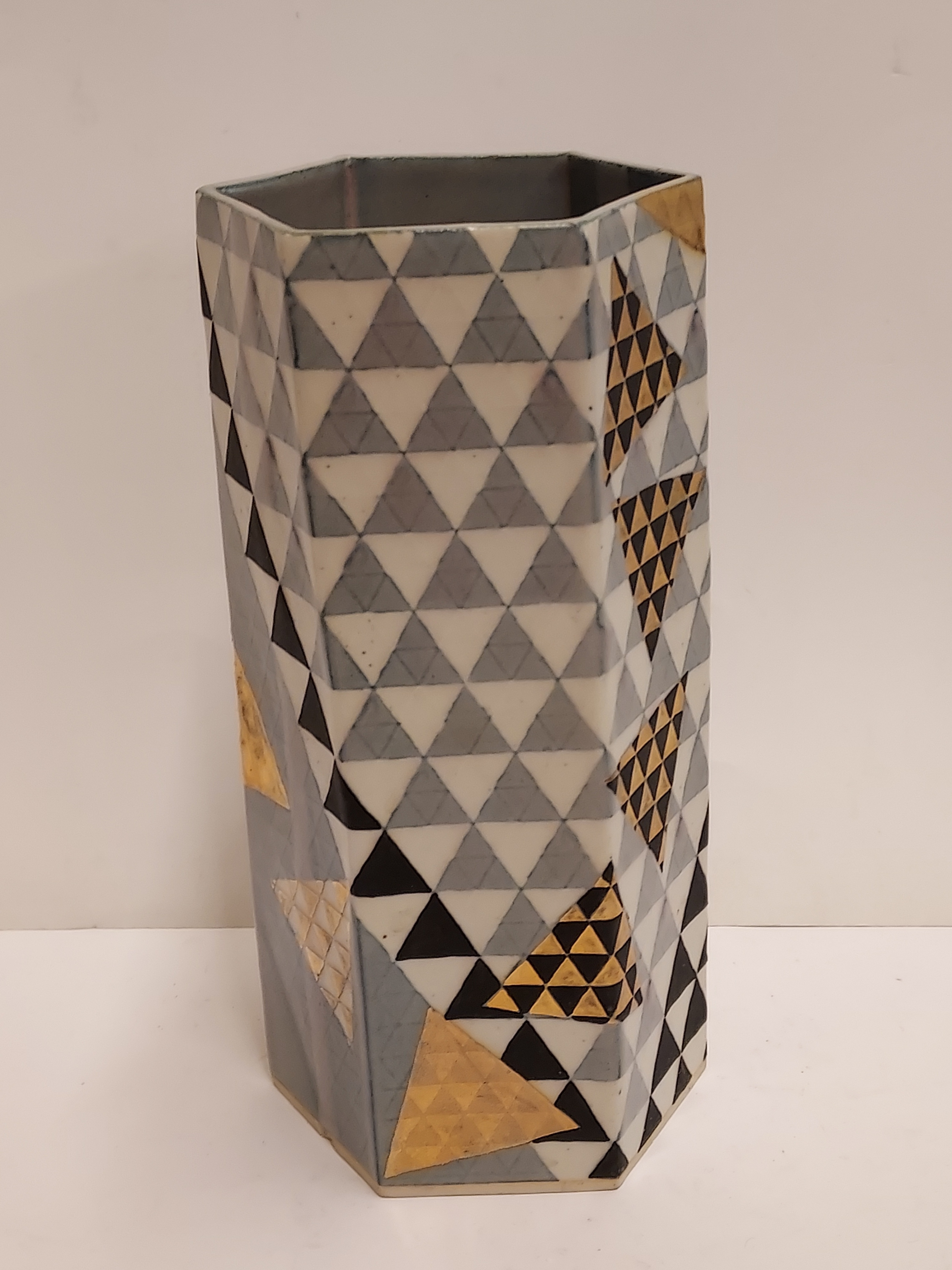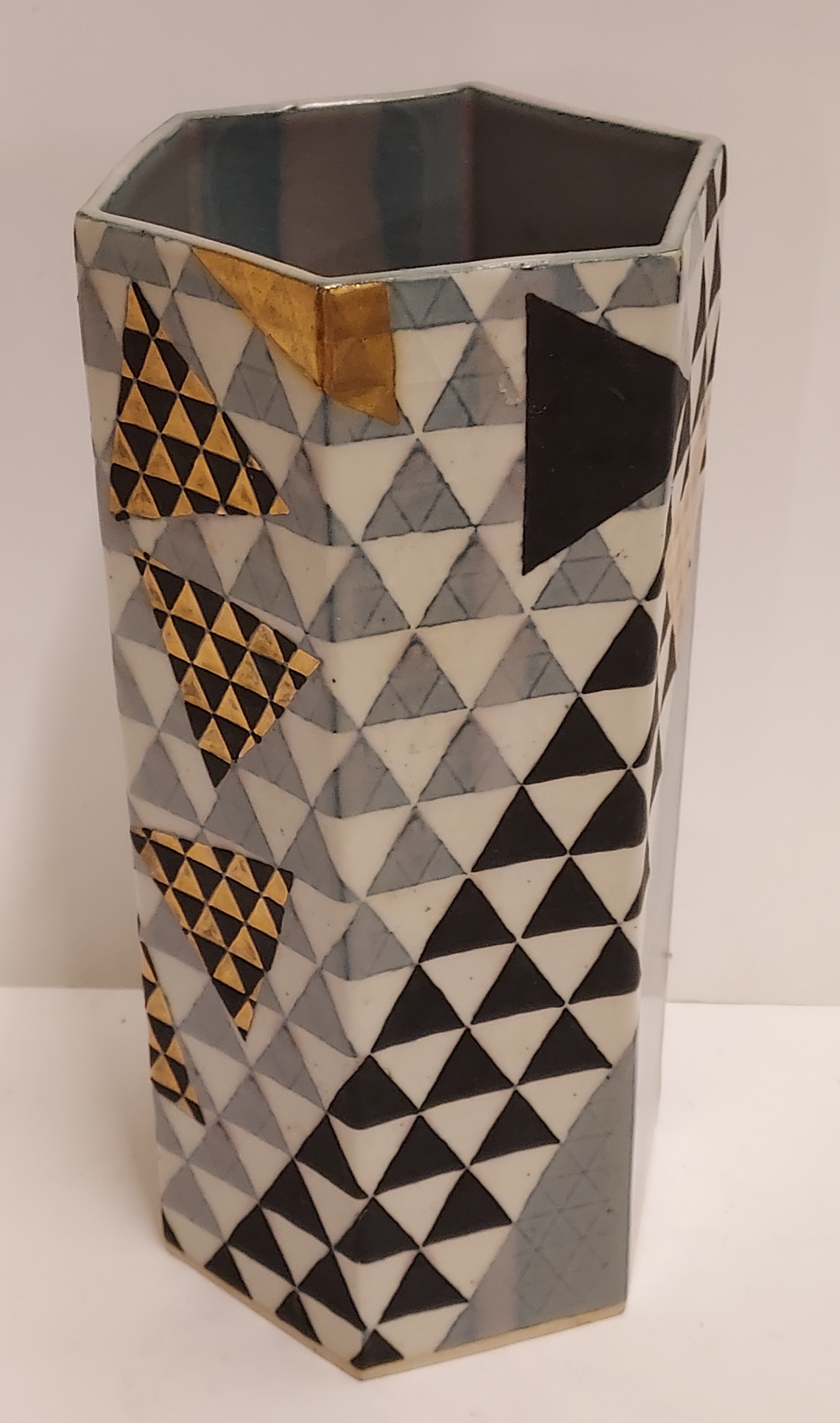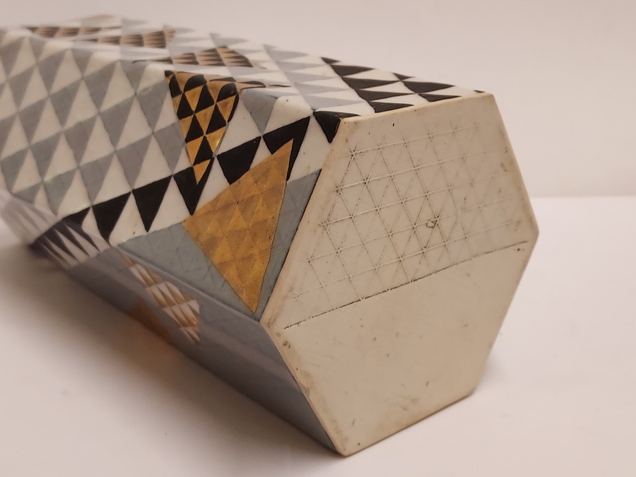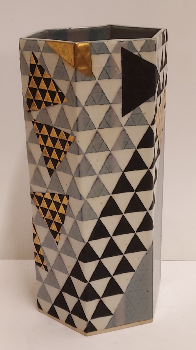 Sechseckige Vase mit geometrischer Dekoration. Nicht signiert.