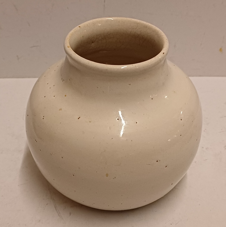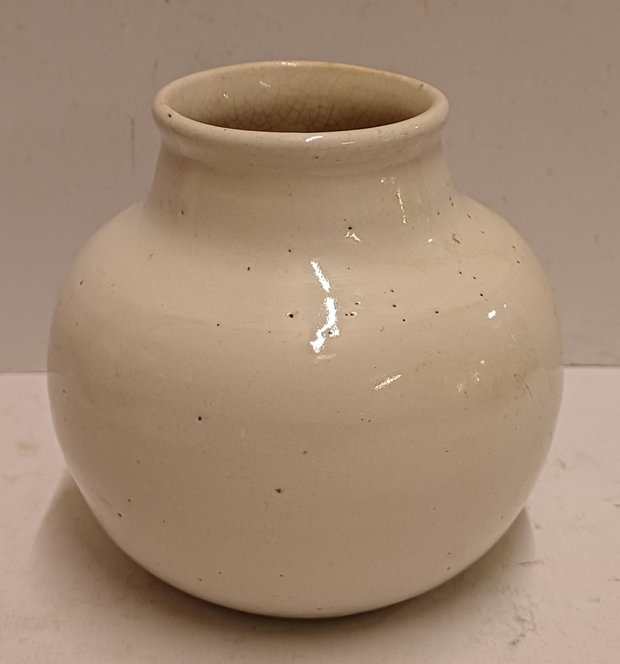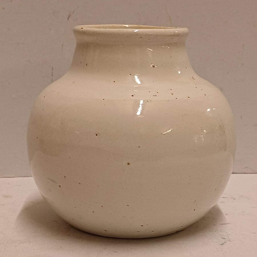 Aardewerken vaasje met witte glazuur. Onderzijde met fabrieksmerk.