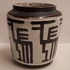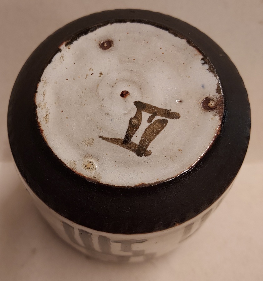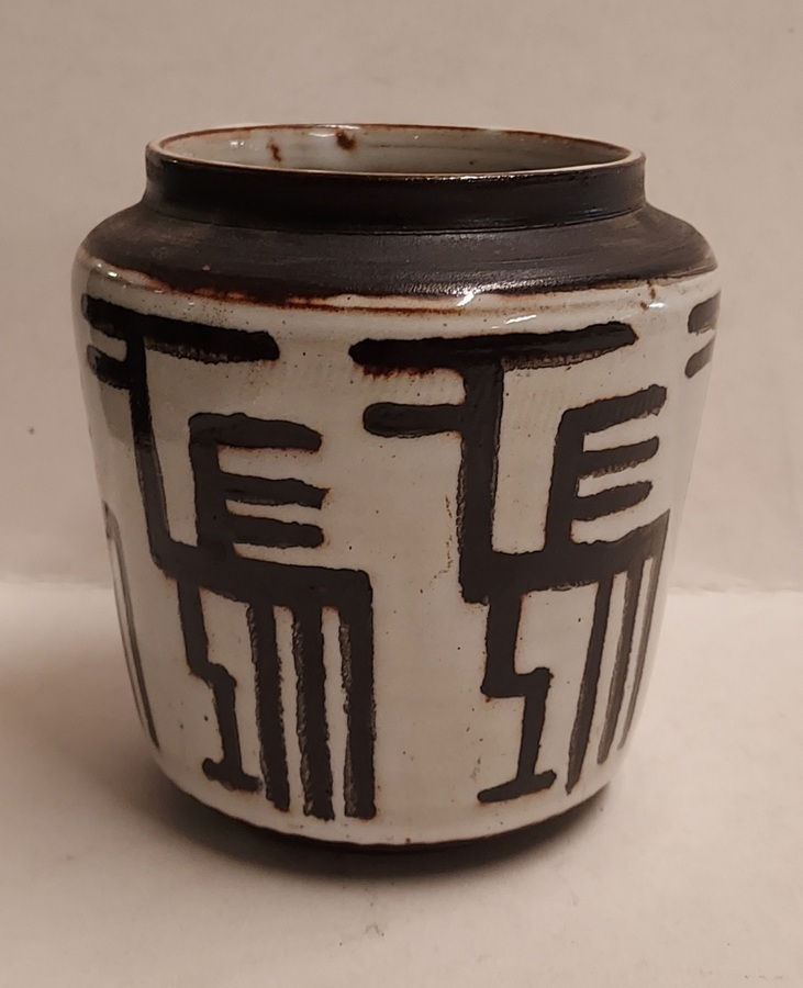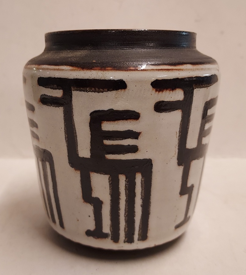 Frühe Vase mit schwarzem, wiederholendem Dekor eines Fantasietieres. Unterseite signiert.