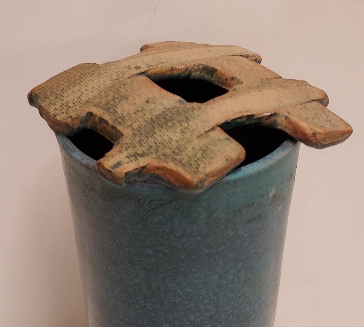 Vase mit keramischem Gitter an der Oberseite. Entwurf von Ed Meissenberg. Unterseite mit Signatur und Jahreszahl 97.