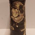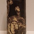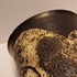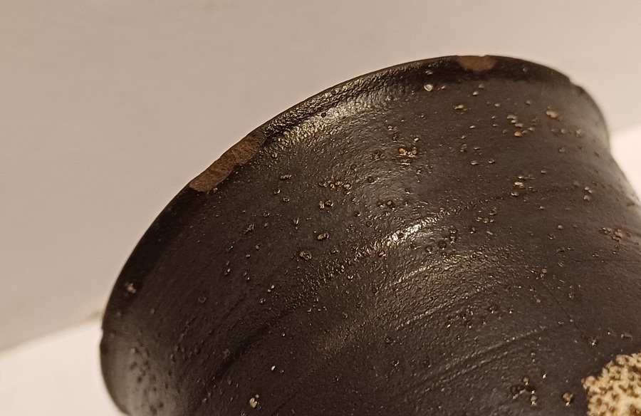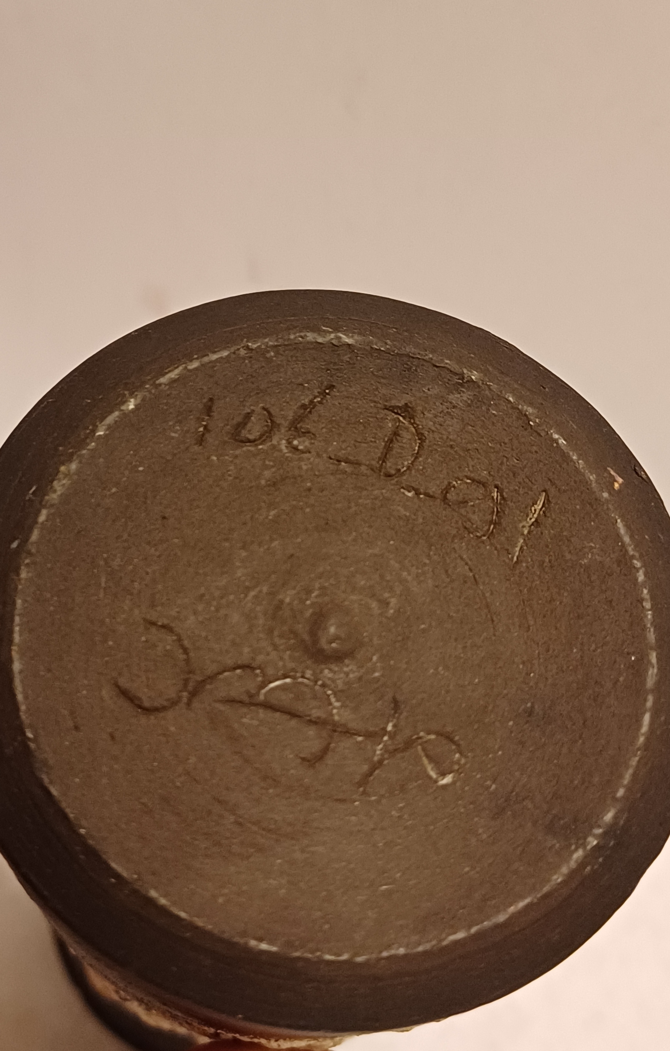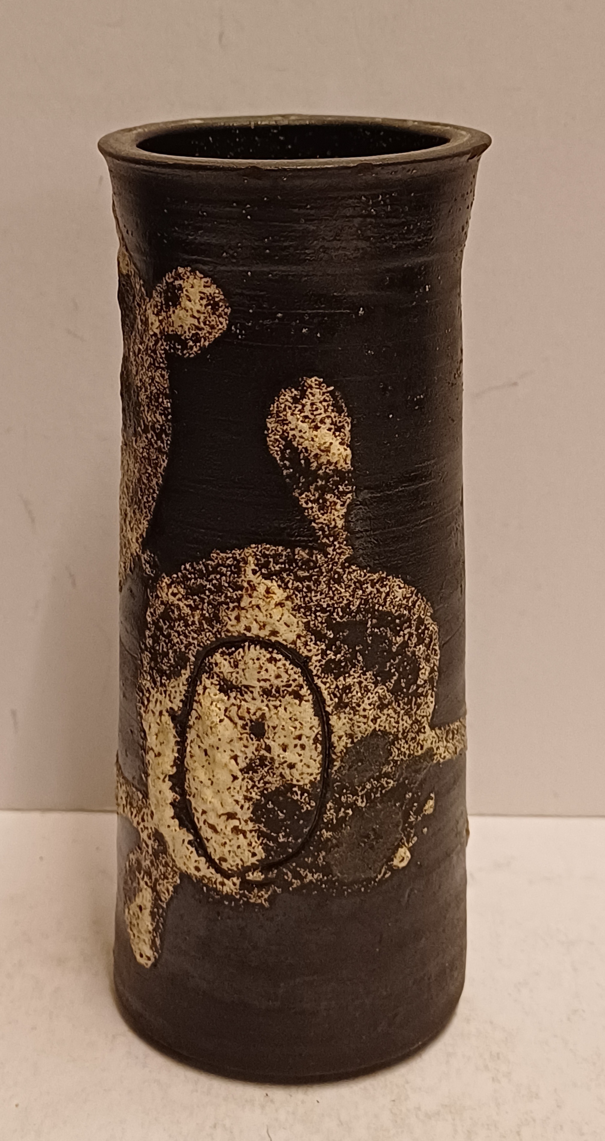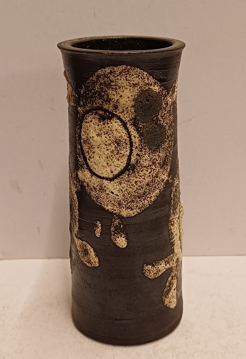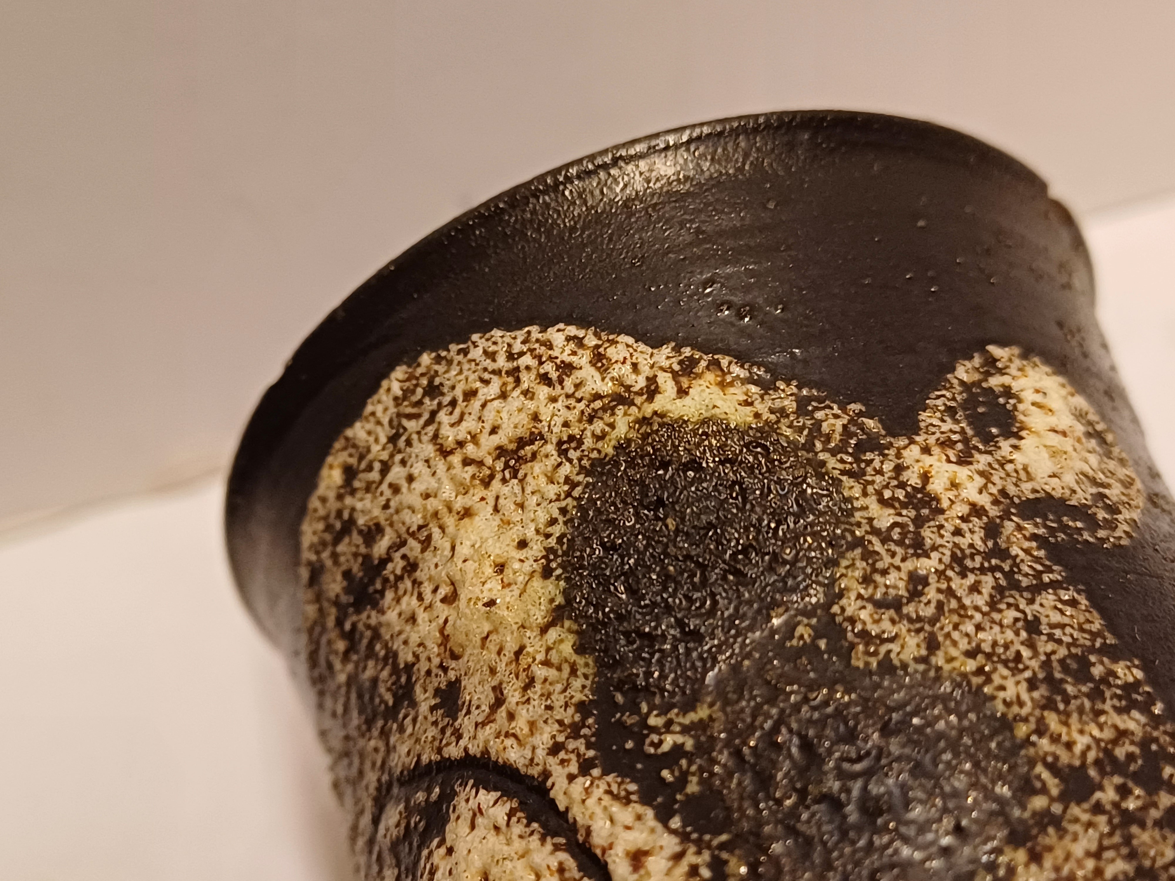 Keramikvase mit schwarzer Glasur und darauf weißer abstrakter Dekoration. Unterseite gekennzeichnet mit Jaap.