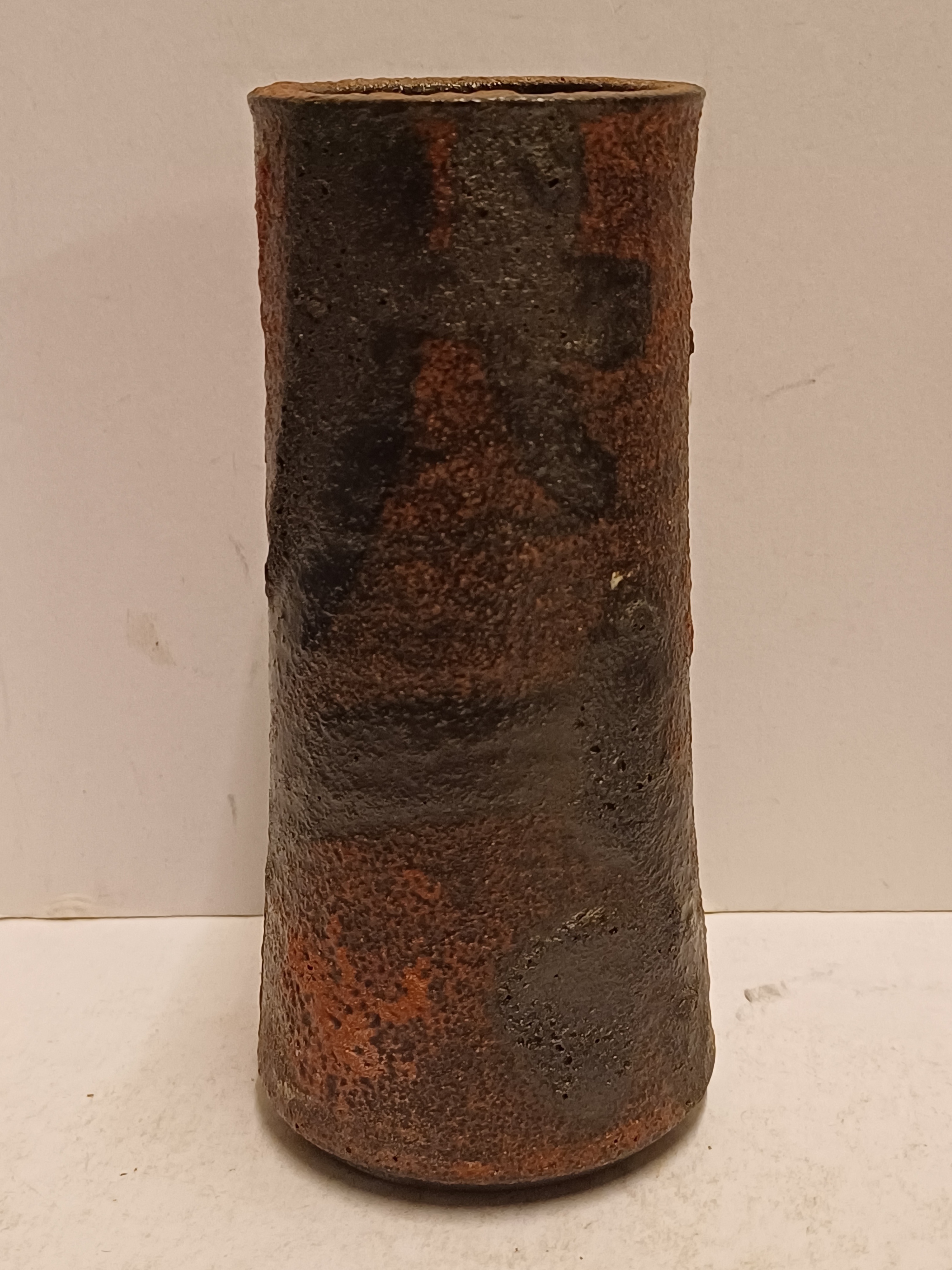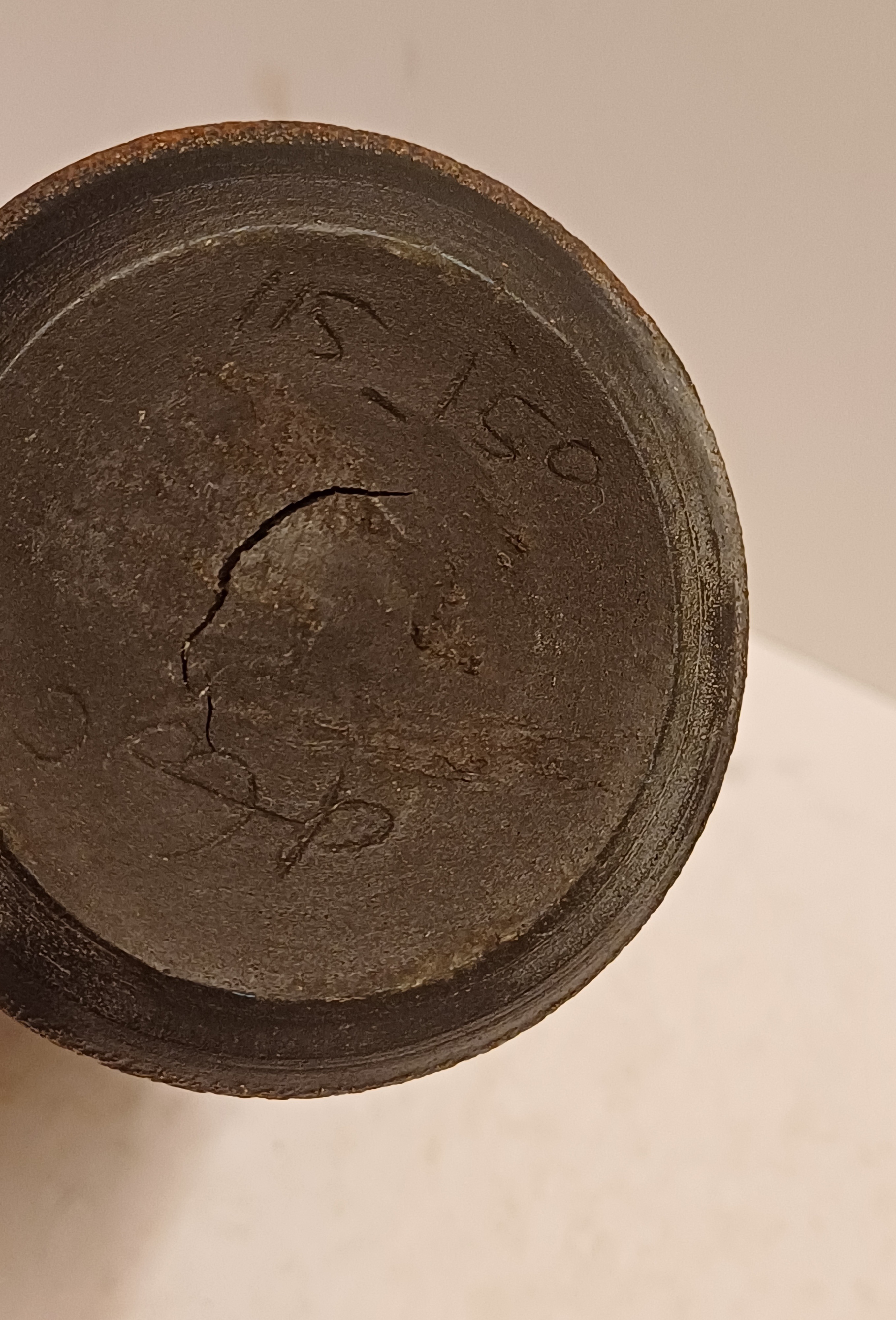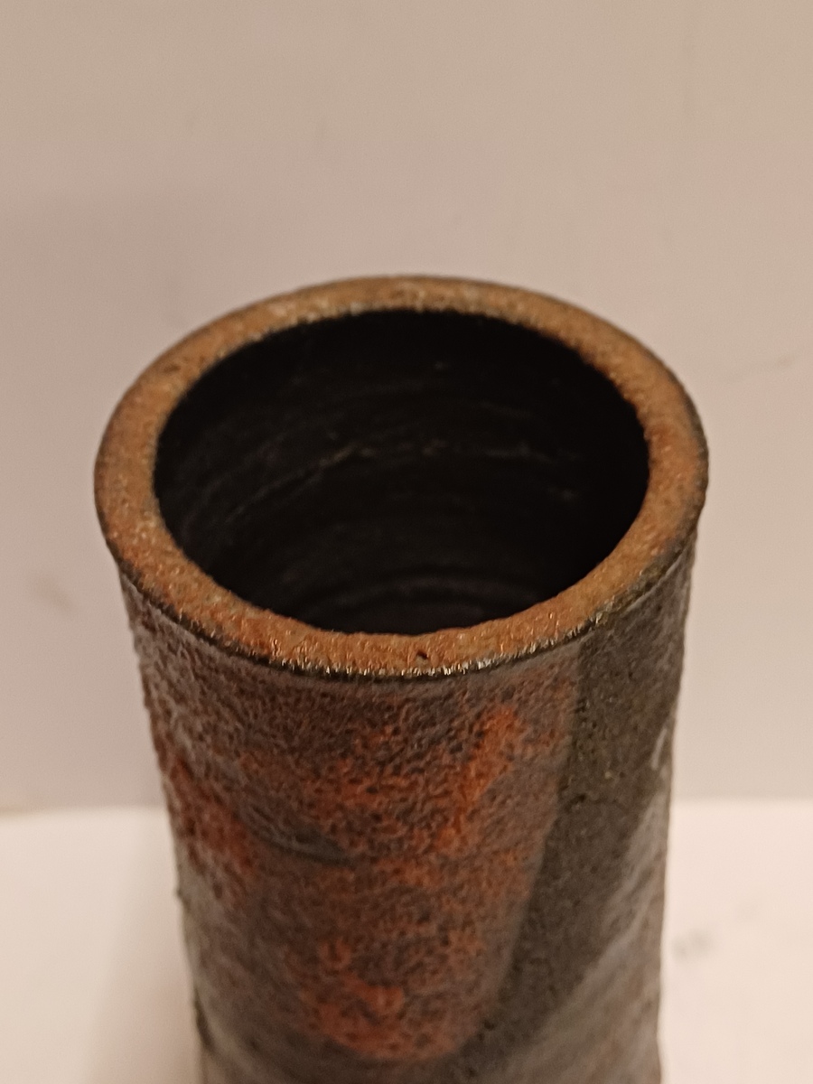 Keramikvase mit brauner Glasur und darauf schwarzer abstrakter Dekoration. Unterseite gekennzeichnet mit Jaap.