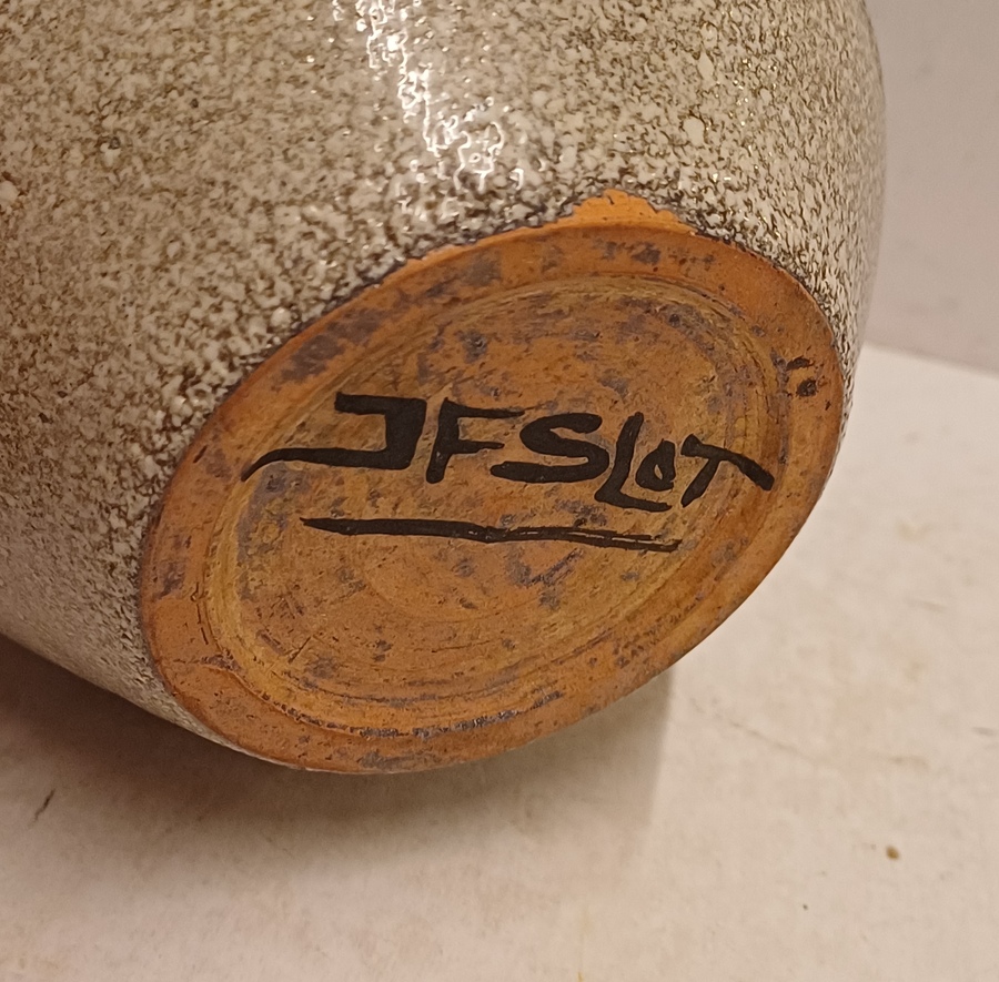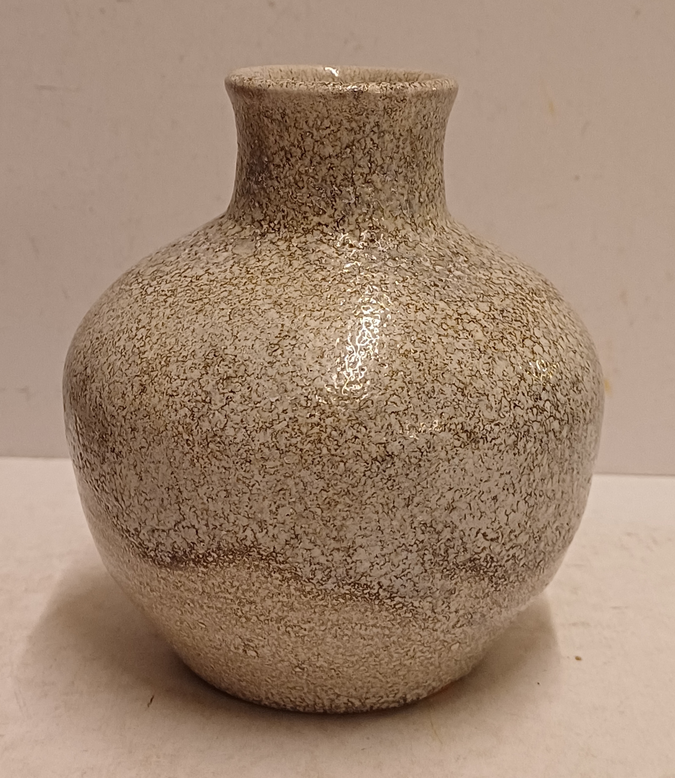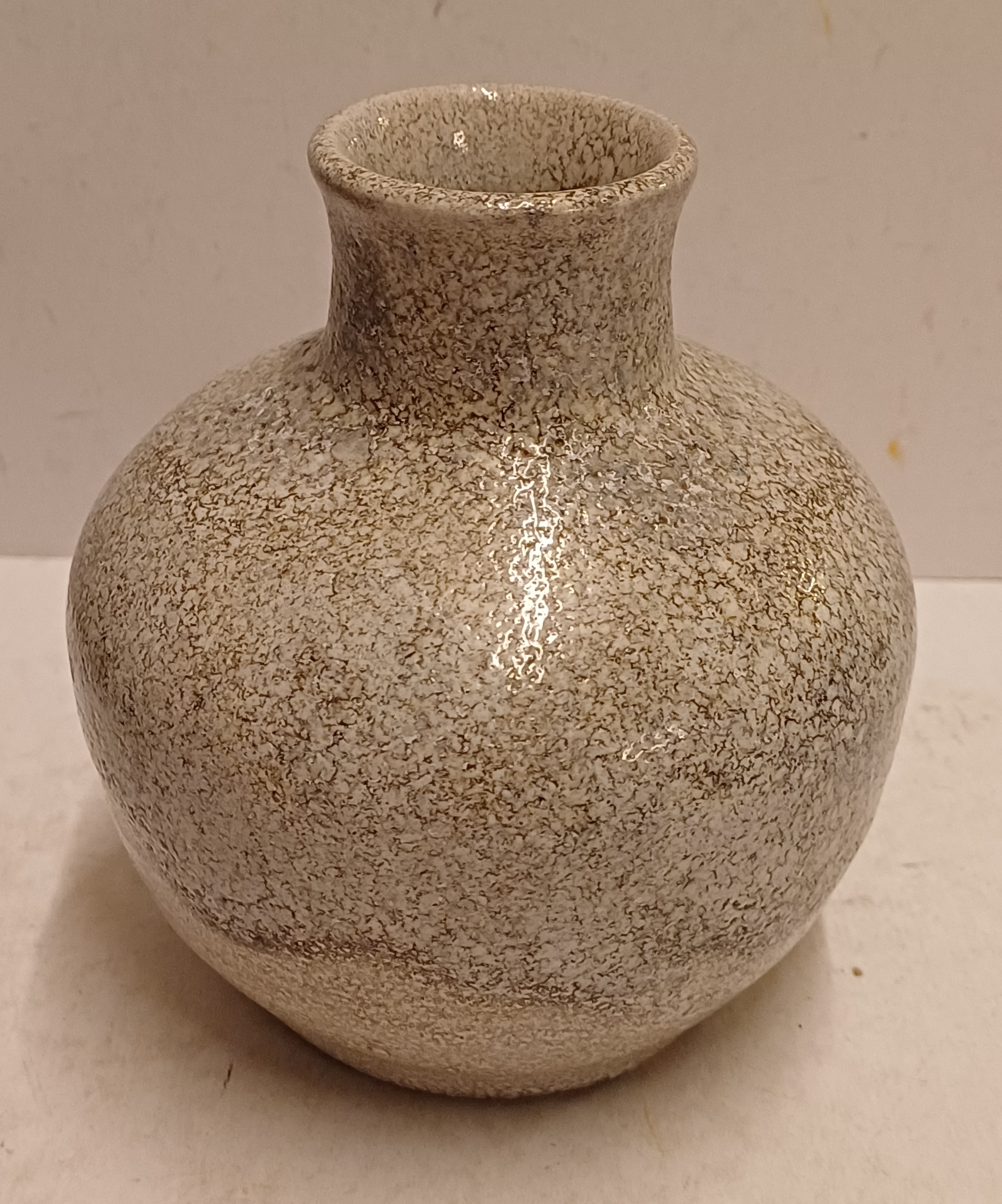 Handgedraaide vaas met witte hazenvel glazuur. Onderzijde gesigneerd