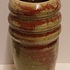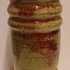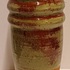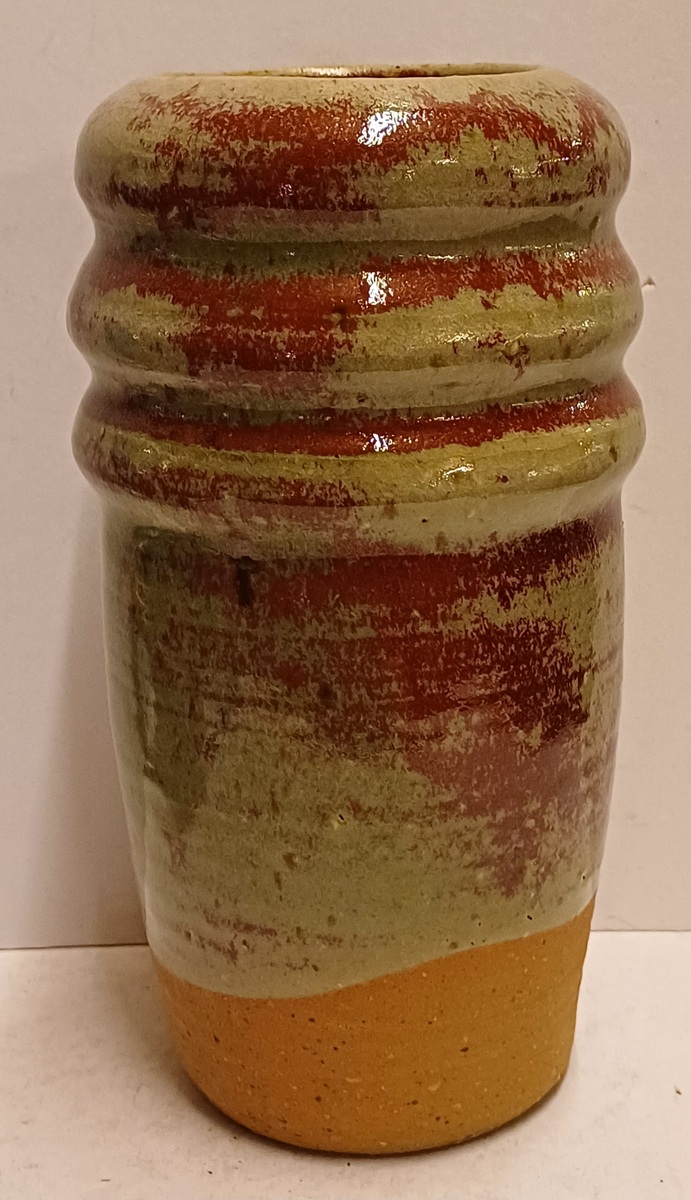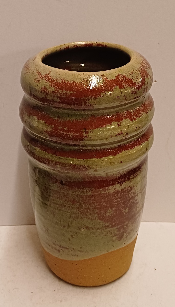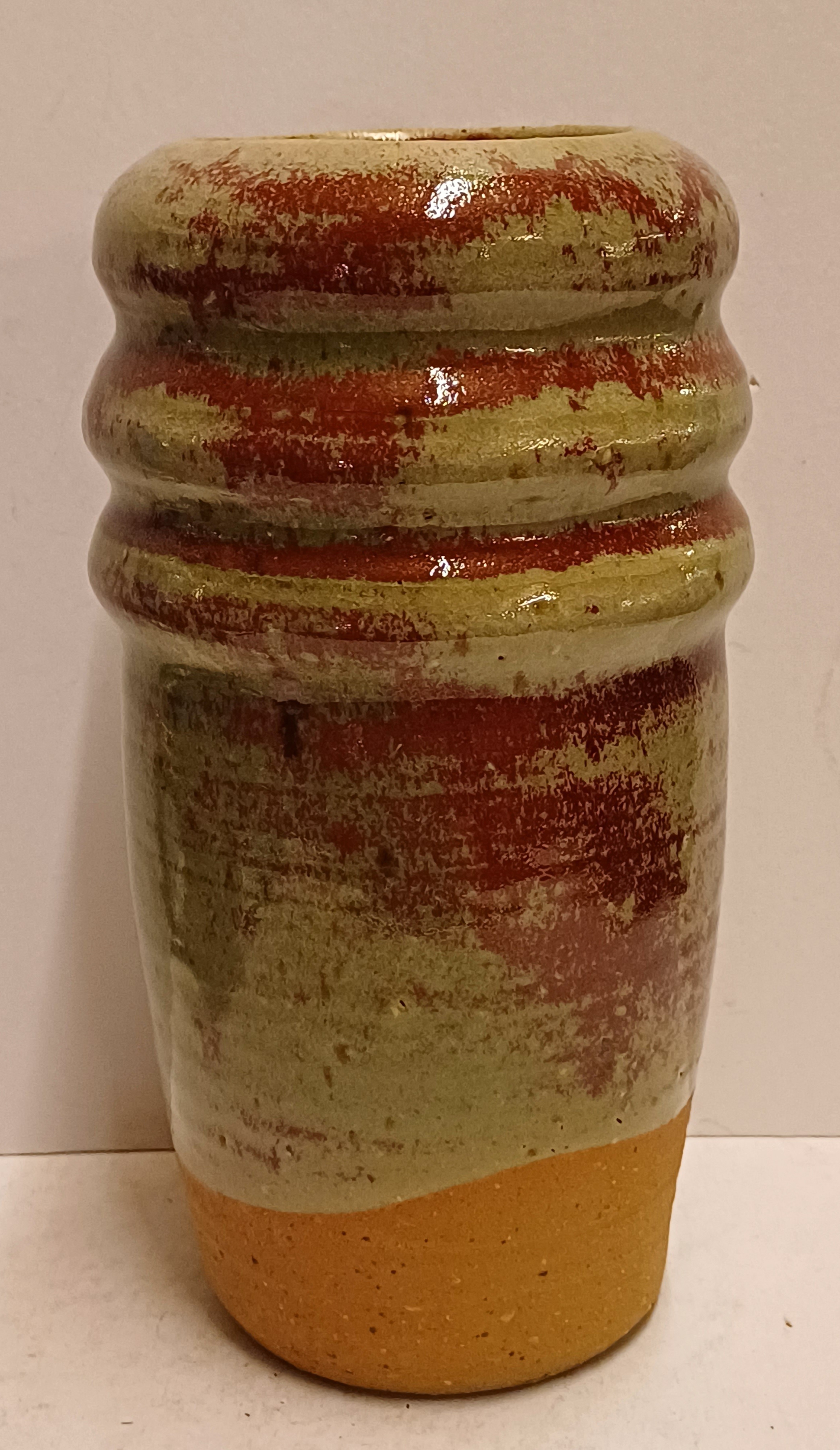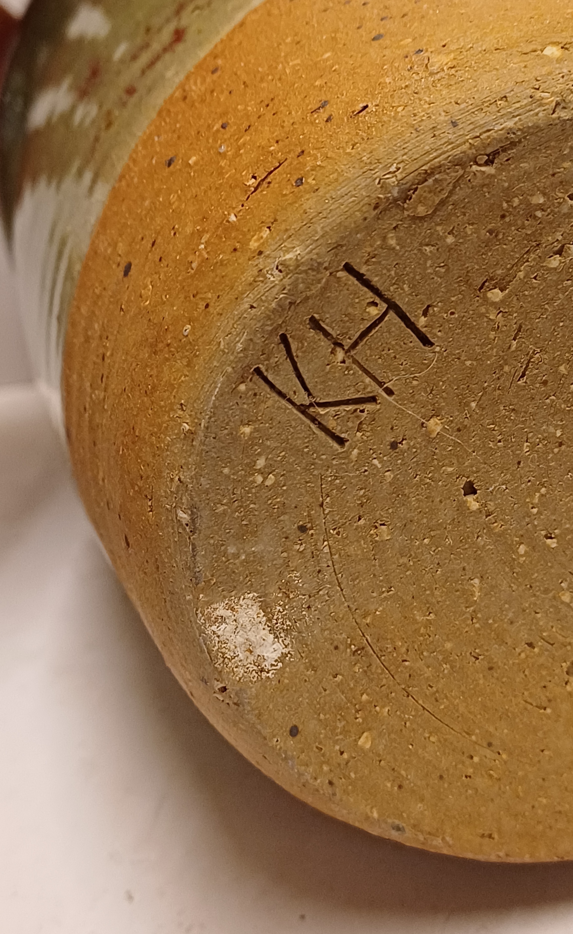 Steinzeugvase mit 2 kleinen Einschnürungen mit roter Glasur auf Celadon-Untergrund. Unterseite gekennzeichnet mit Monogramm.