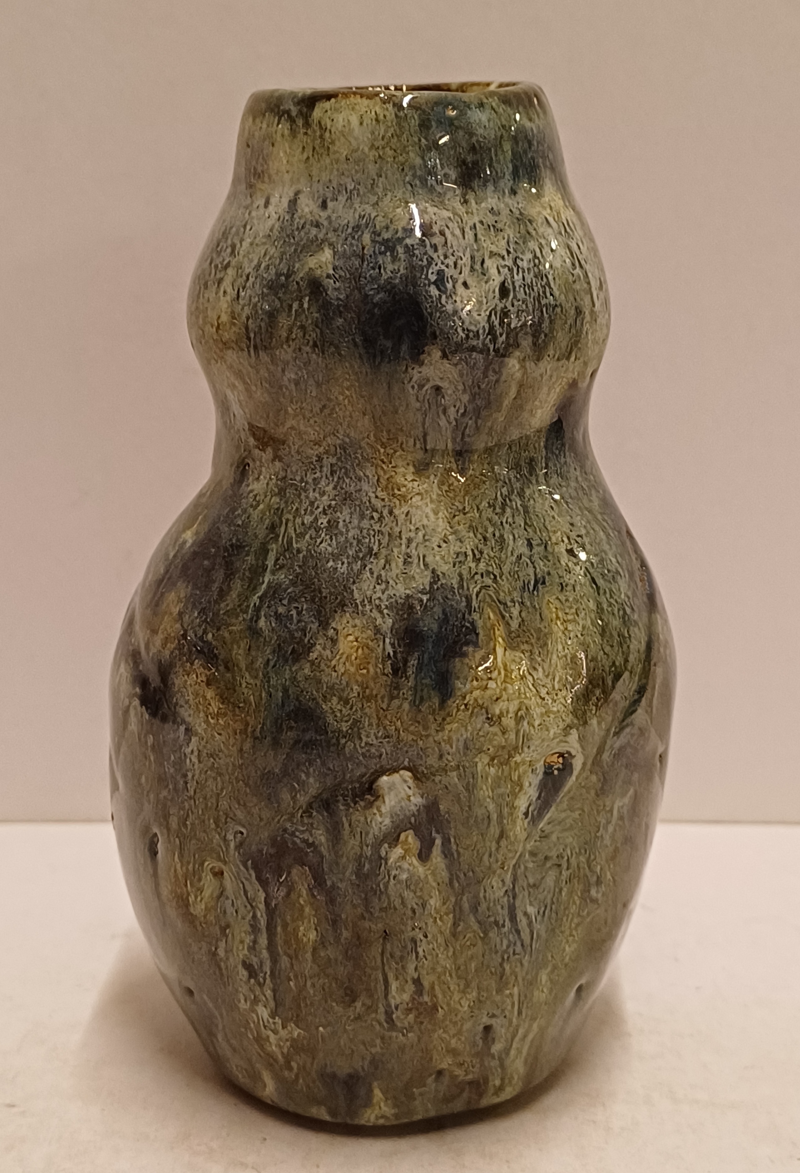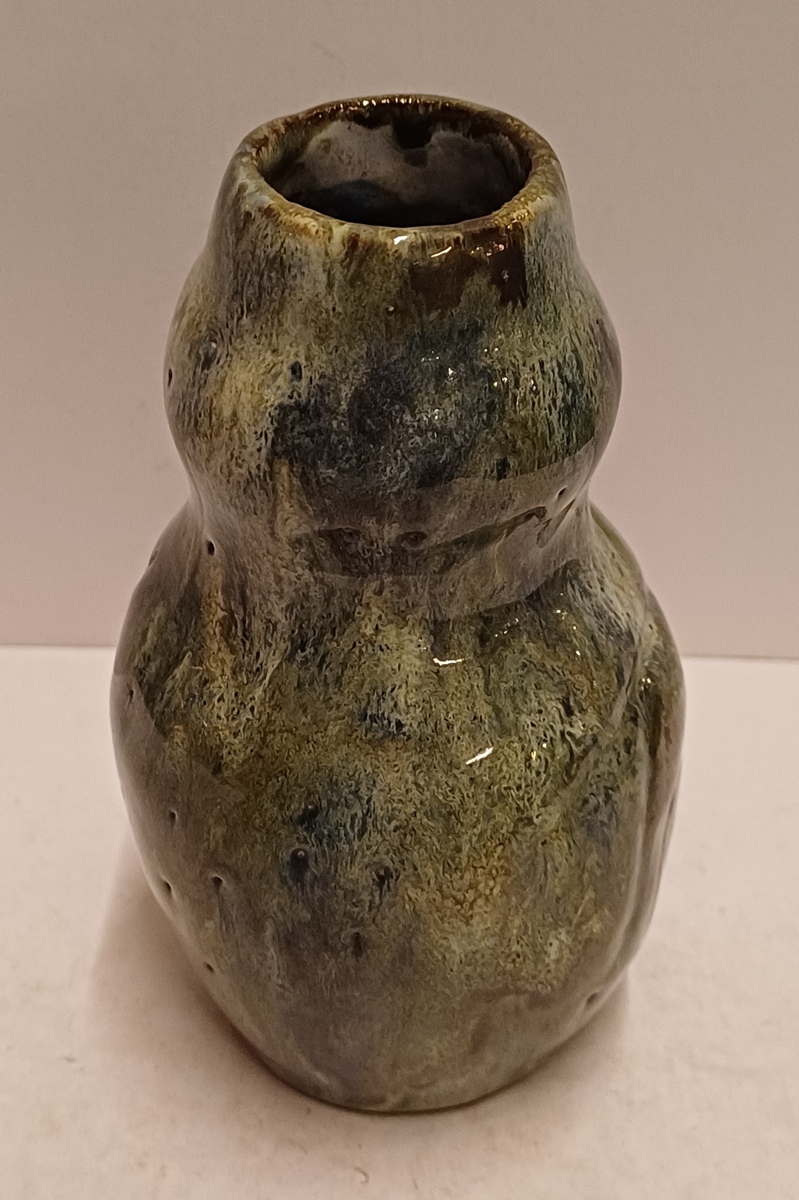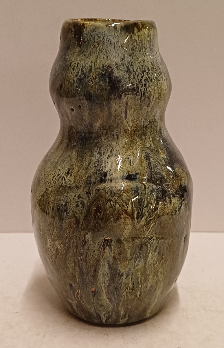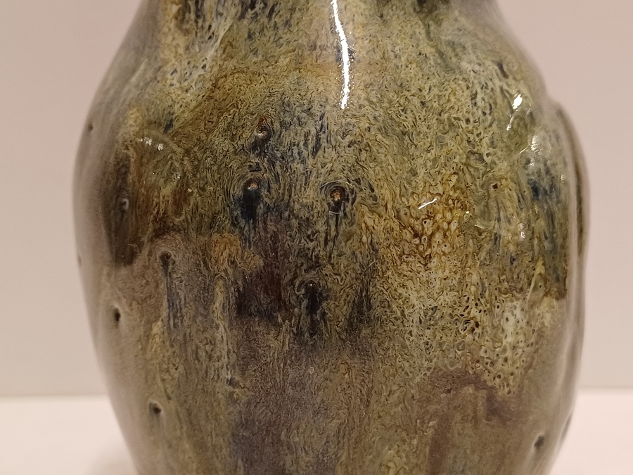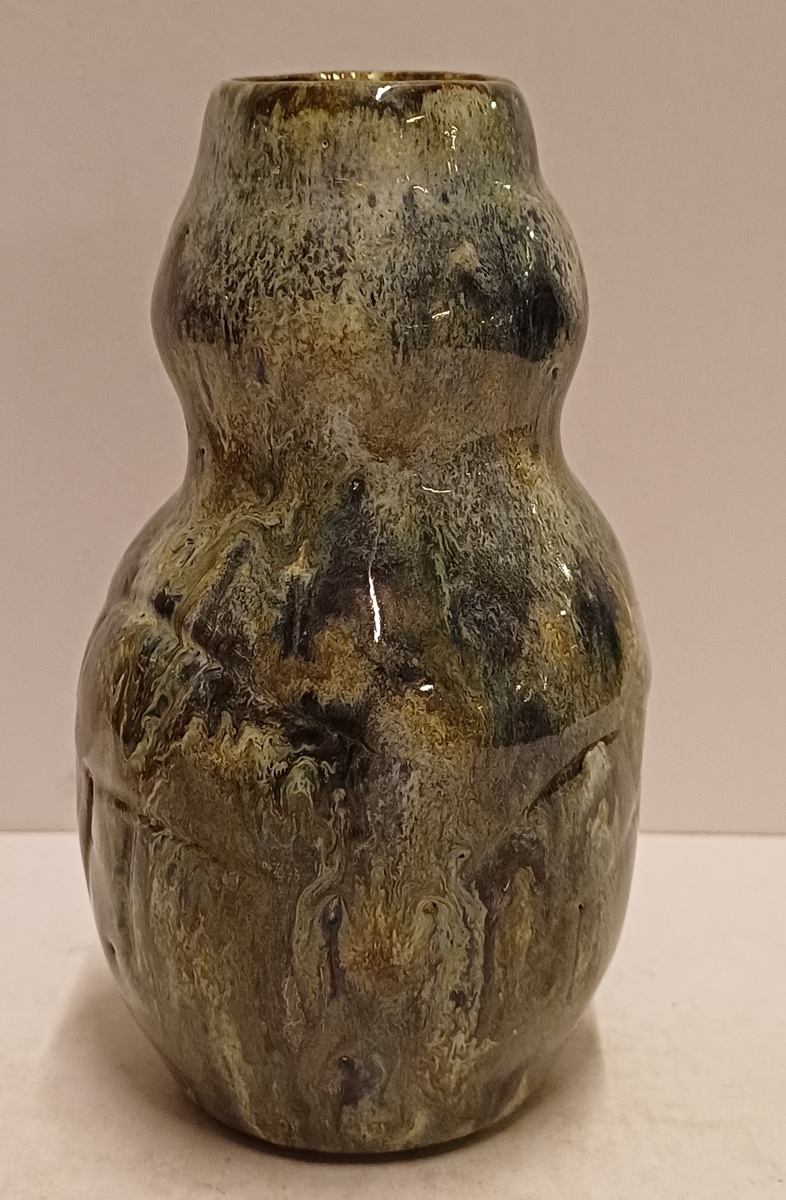 Handgevormde aardewerken vaas, met dikke stroomglazuur in grijstinten. Onderzijde gemerkt met etiket.