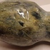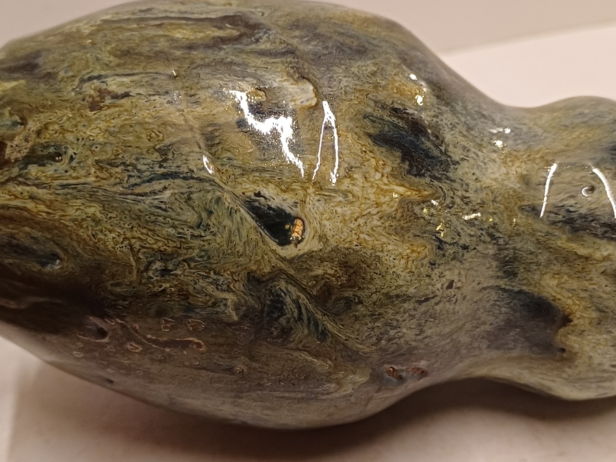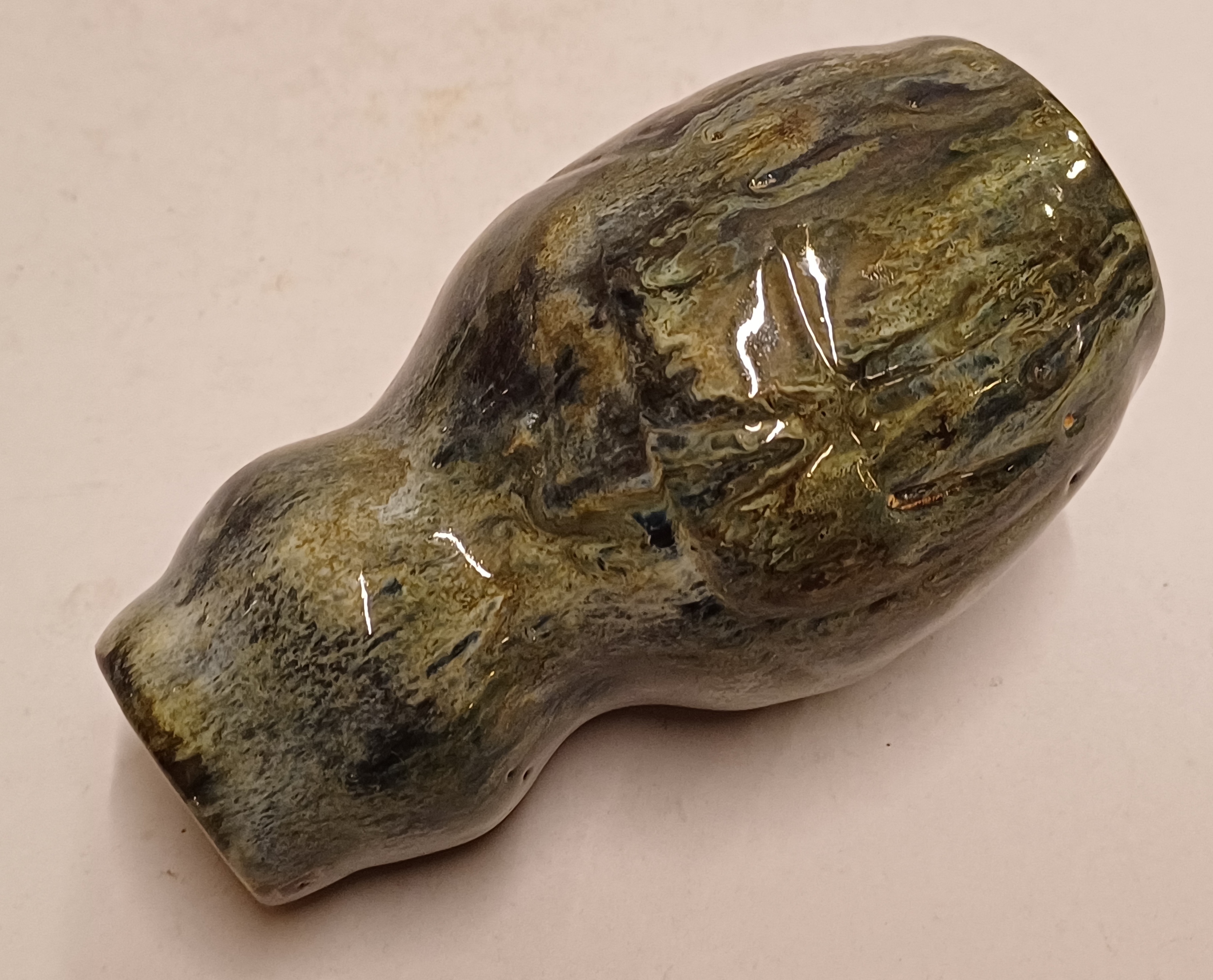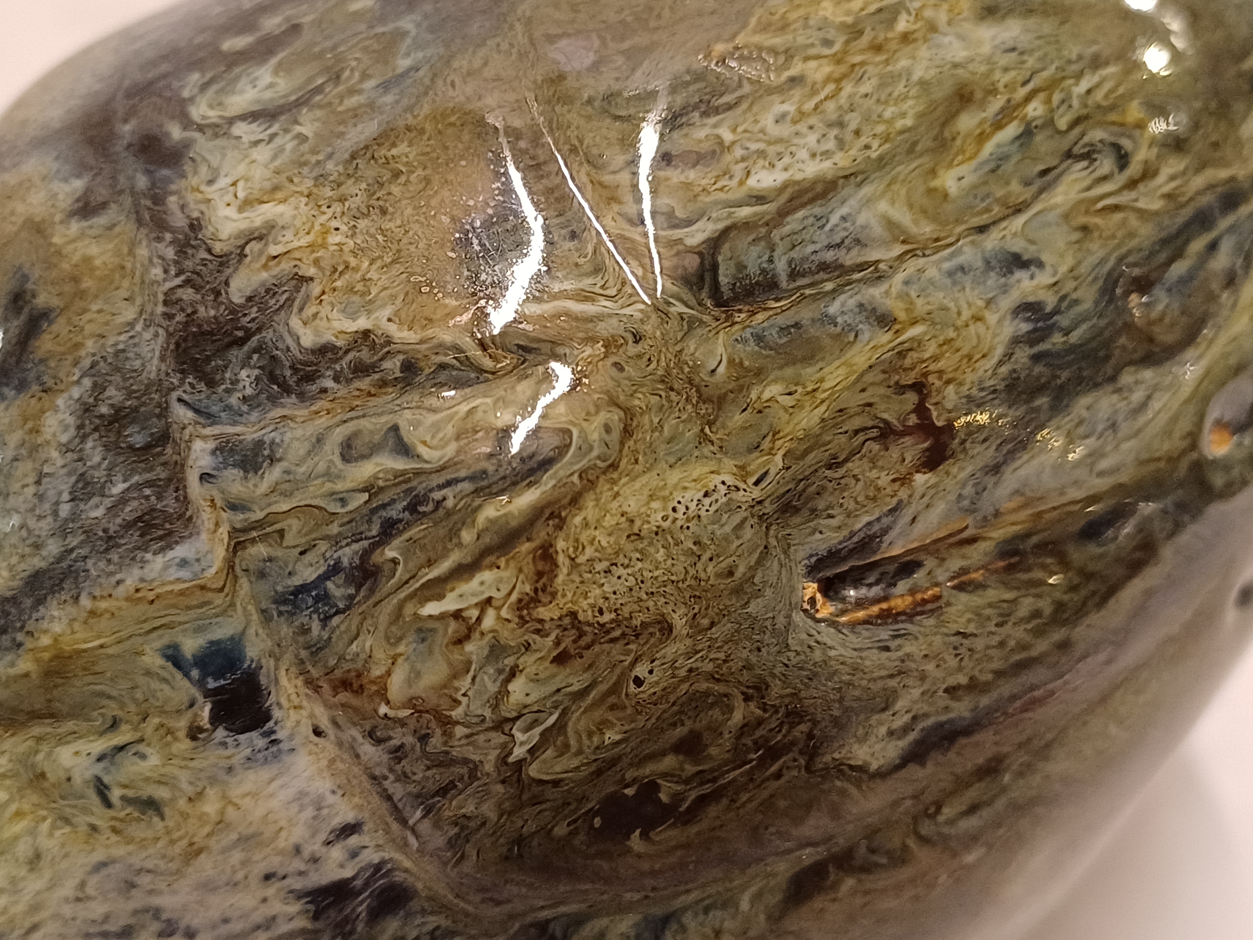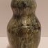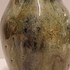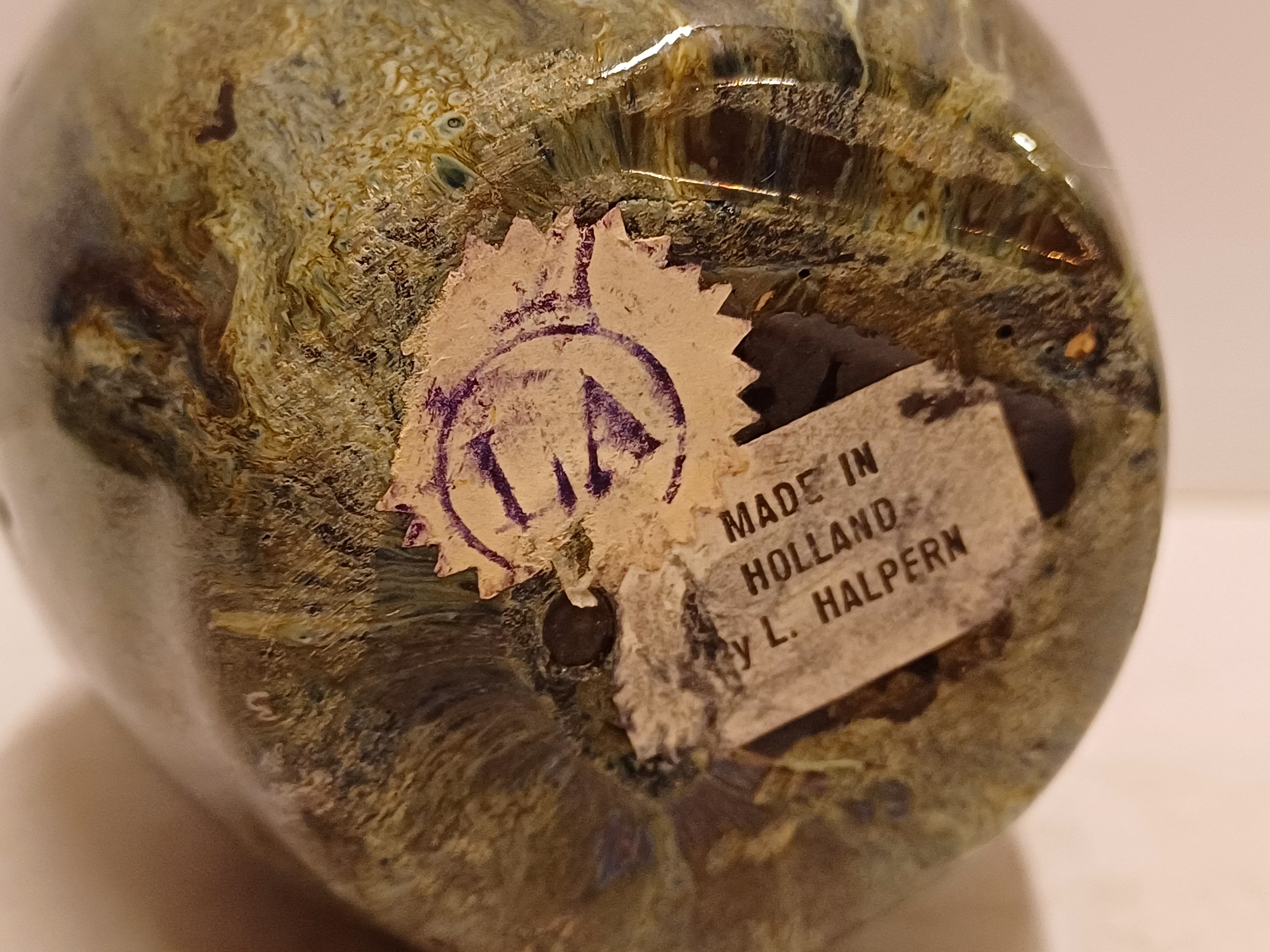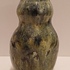 Handgevormde aardewerken vaas, met dikke stroomglazuur in grijstinten. Onderzijde gemerkt met etiket.