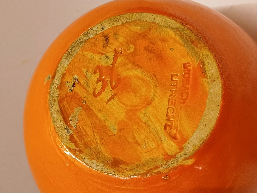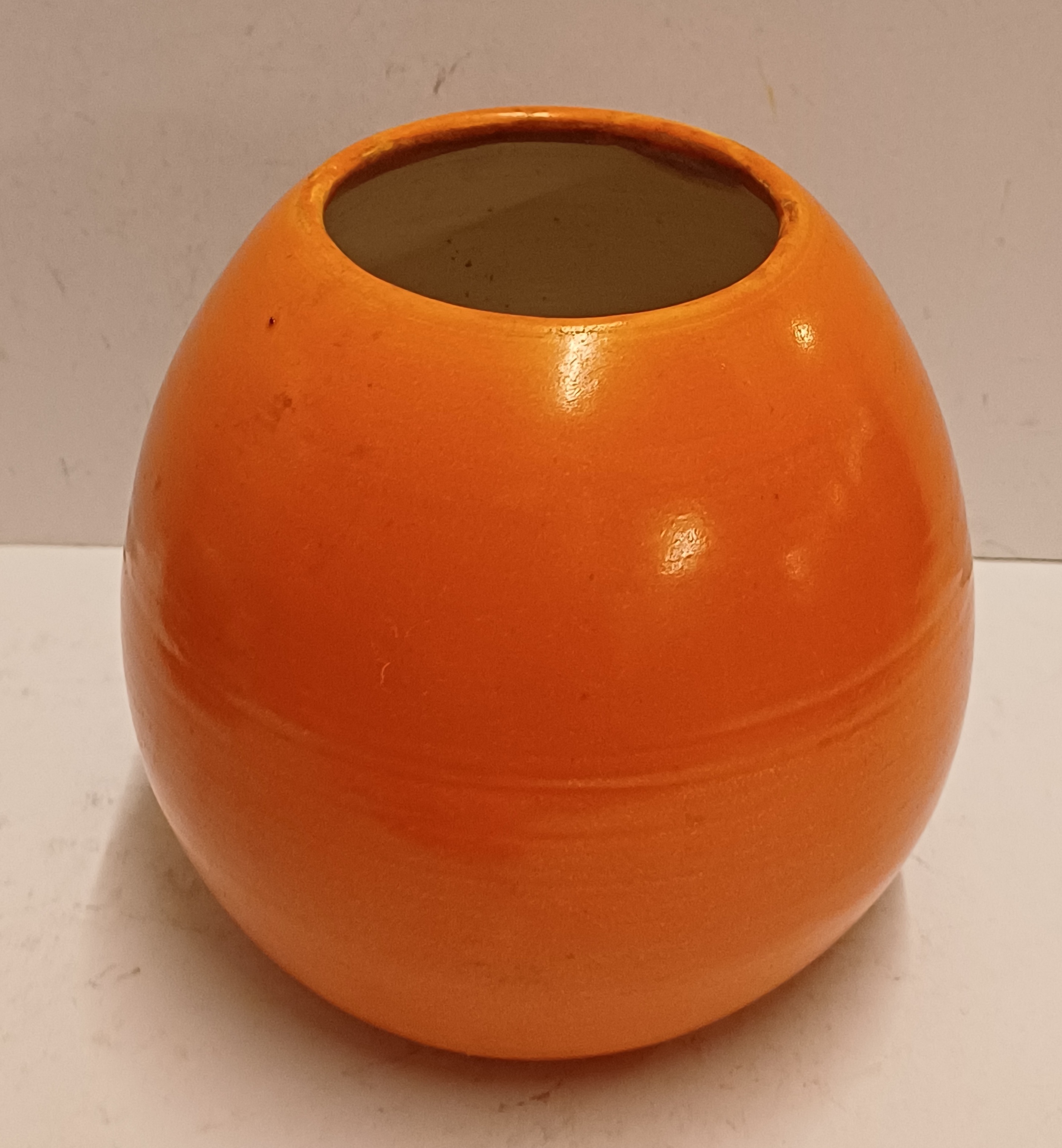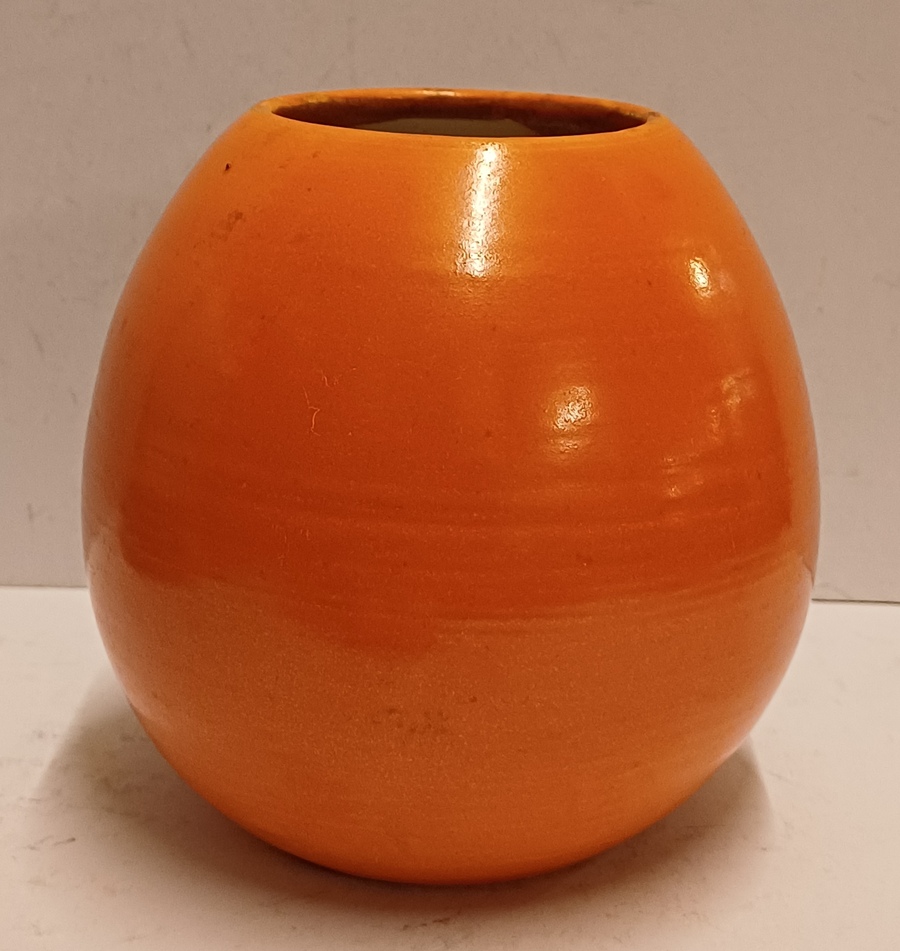 Aardewerken ei vormige vaas met oranje glazuur. Onderzijde gemerkt.