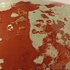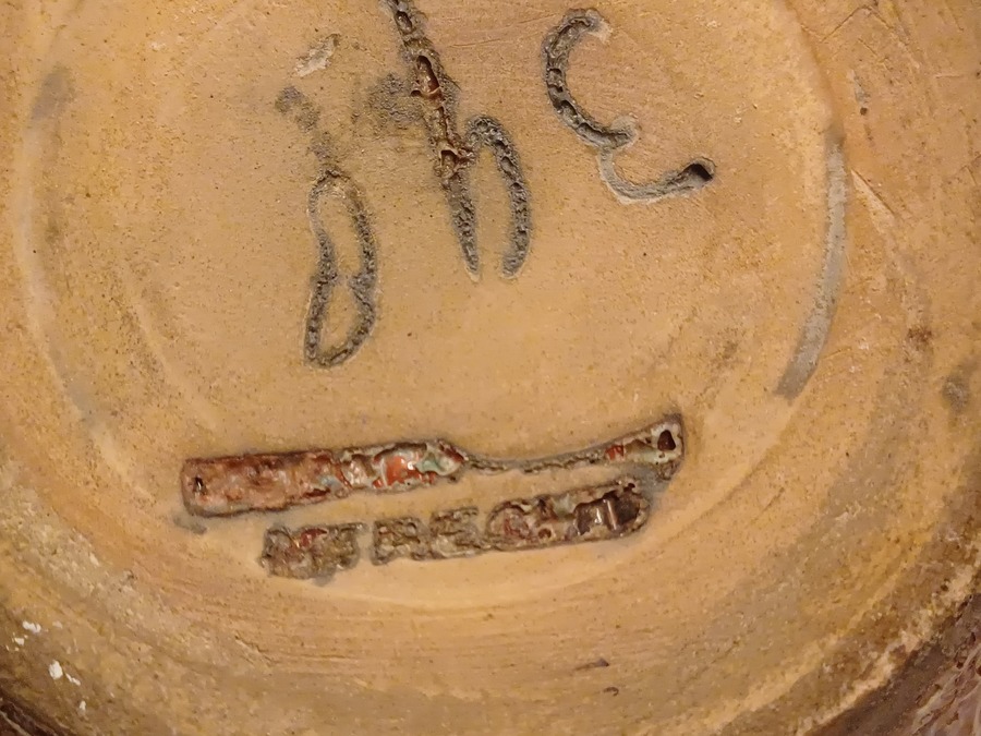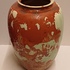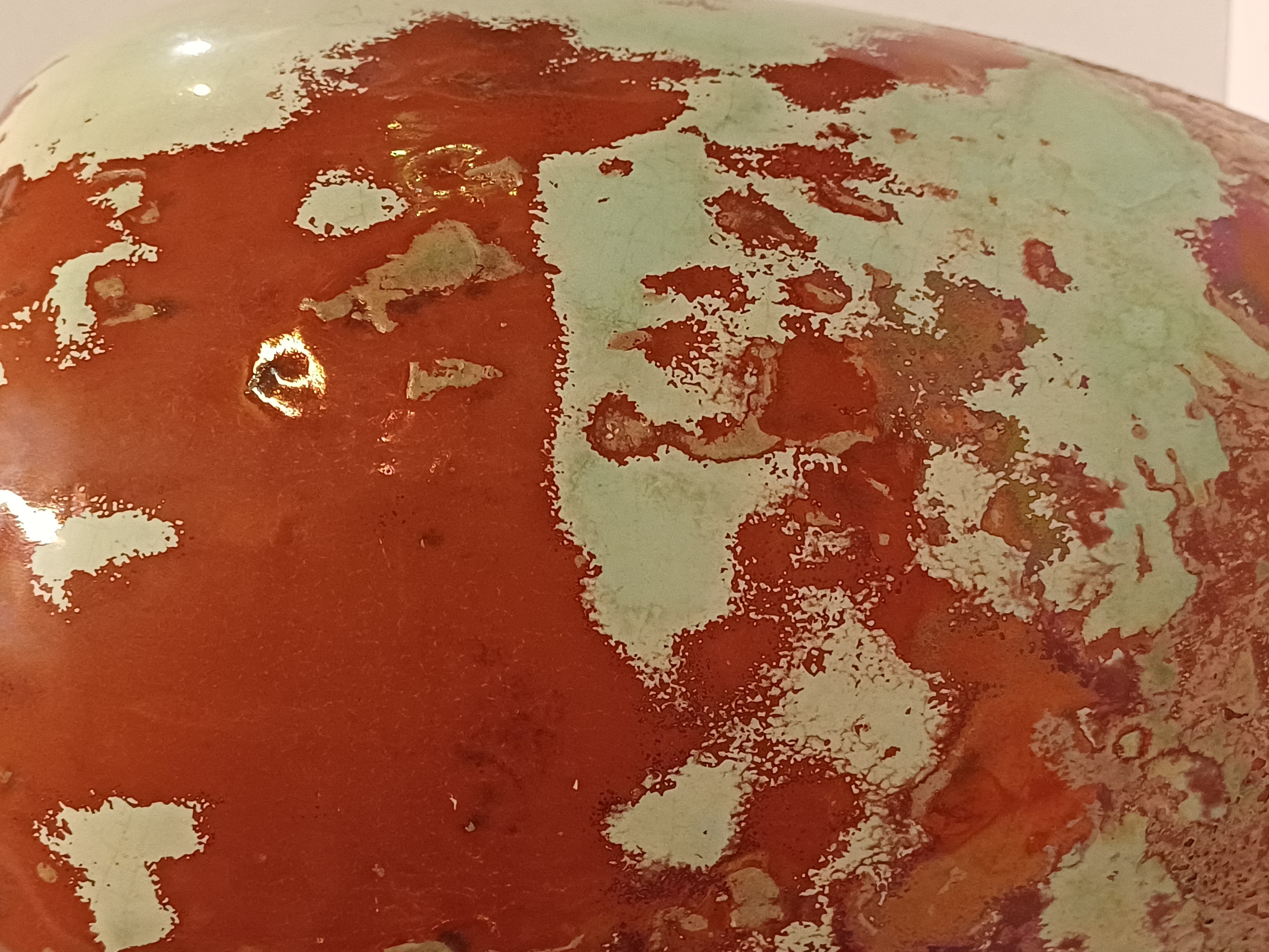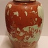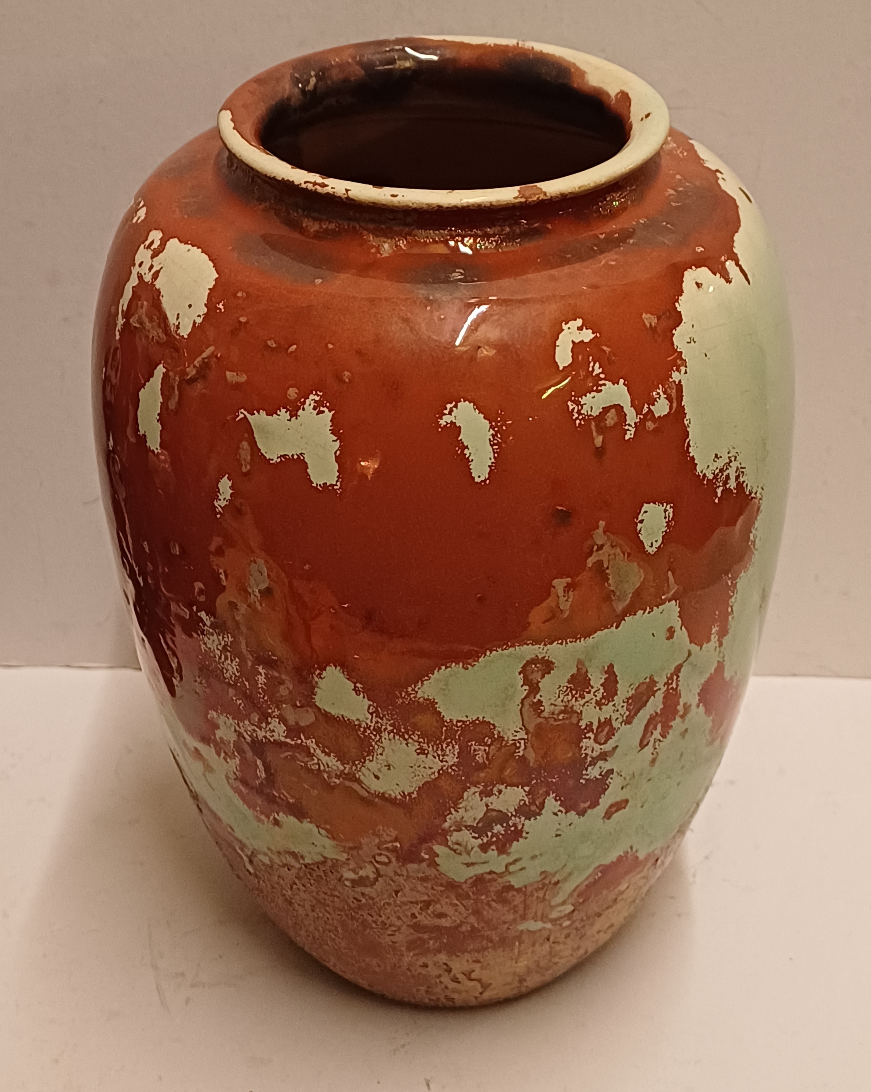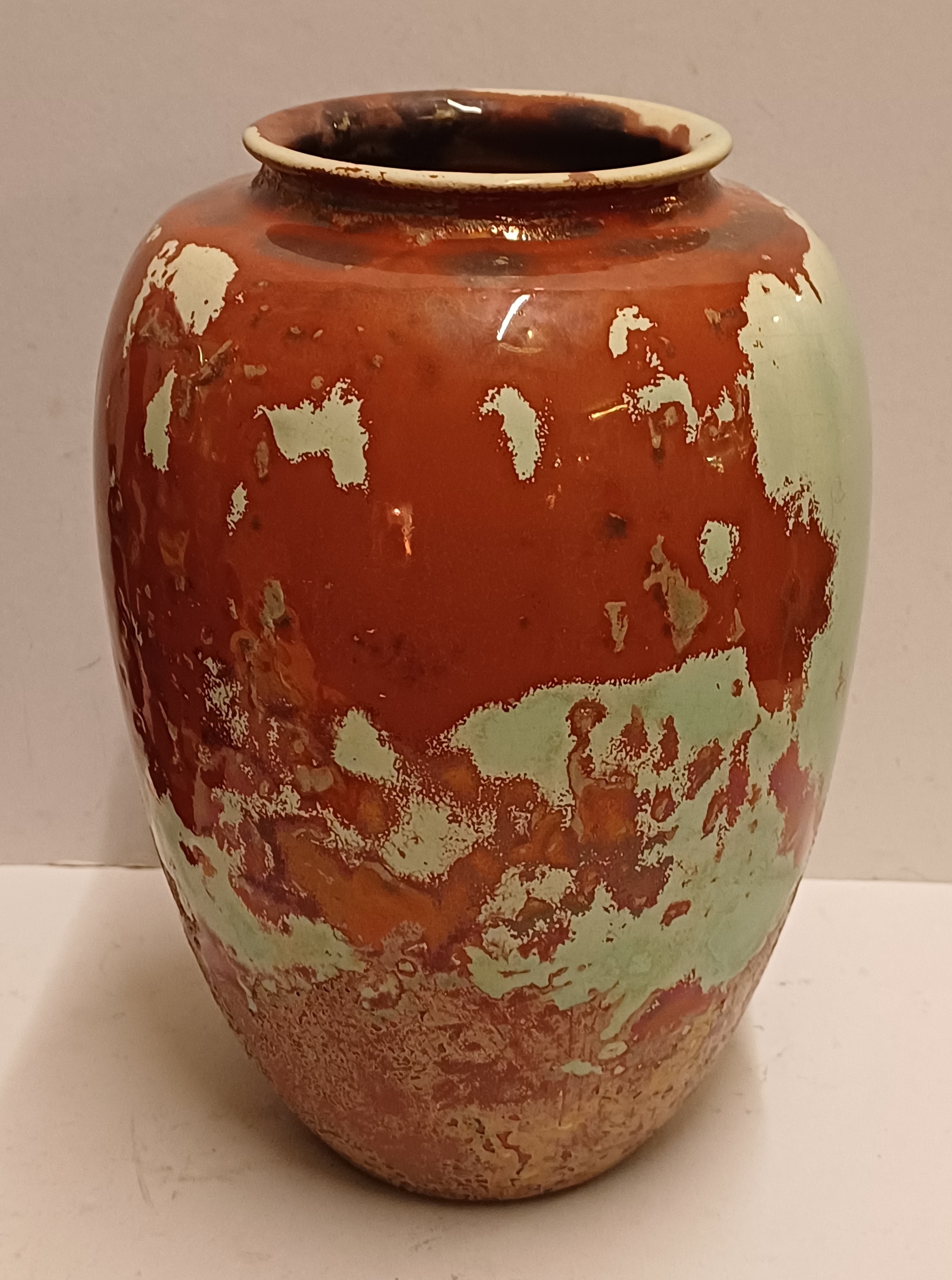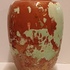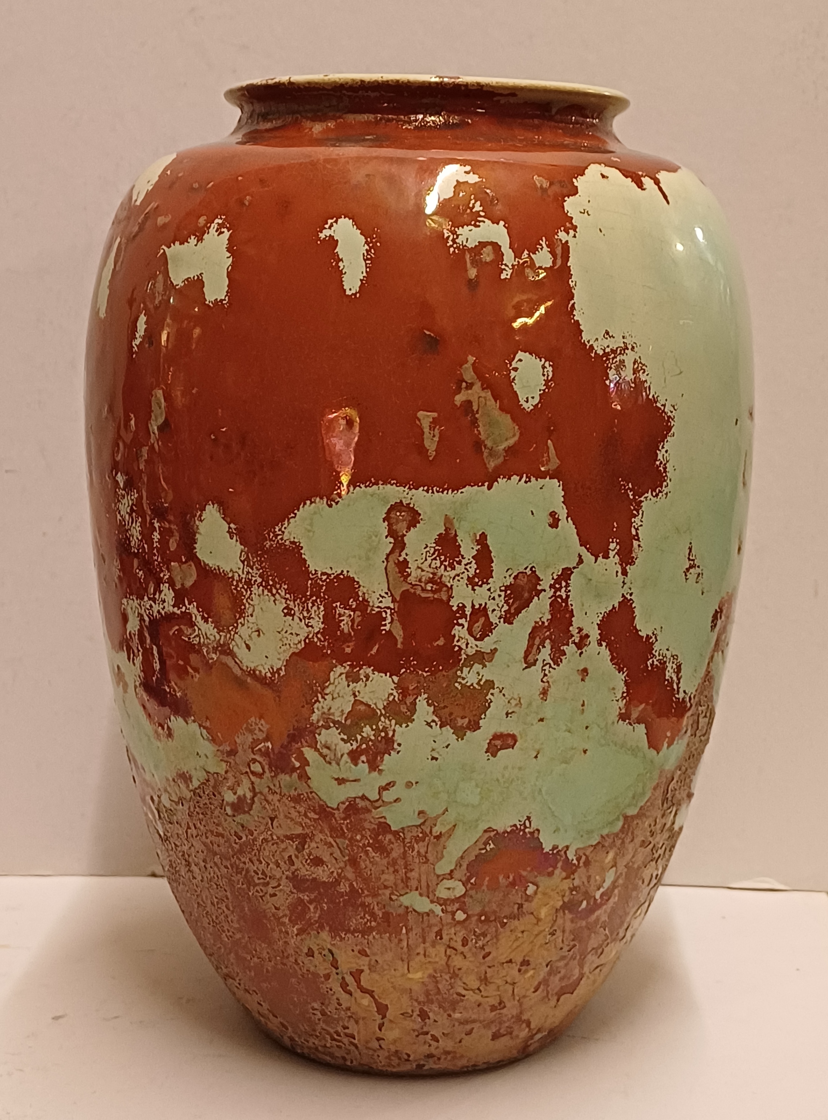 Grote vaas met metallic glazuur met groen vlekken op rood rood fond. Onderzijde met fabrieksmerk.