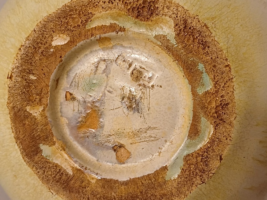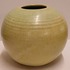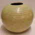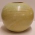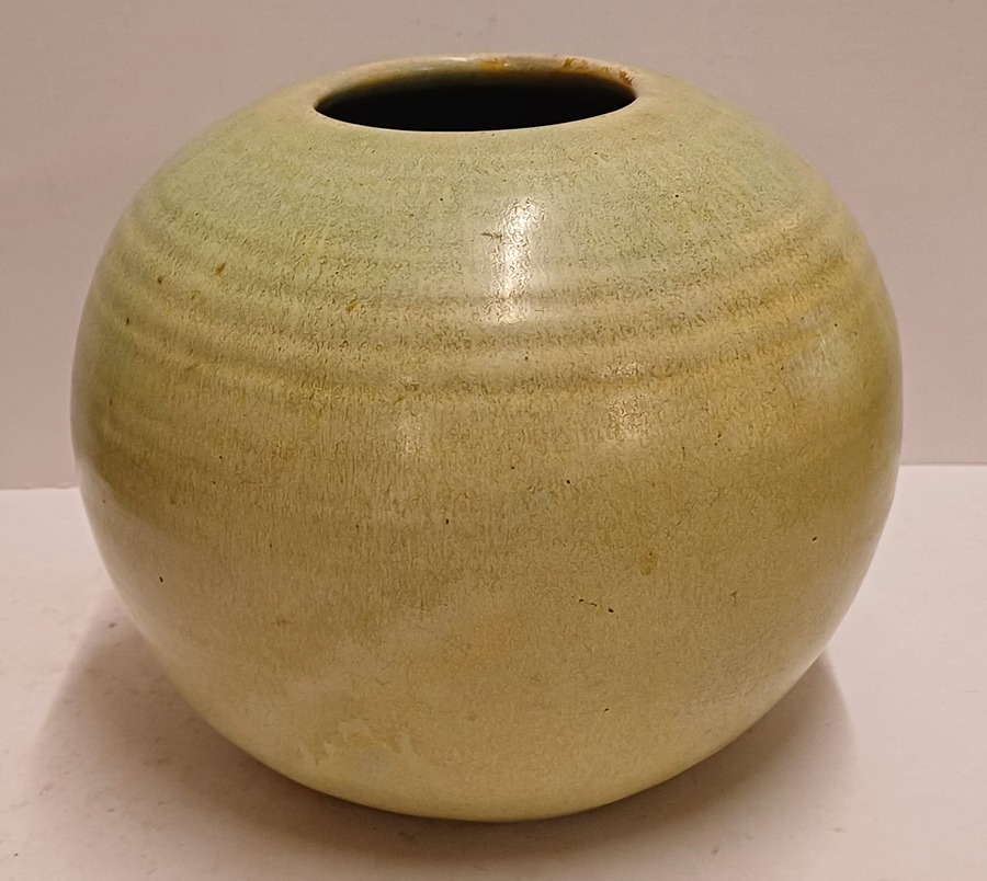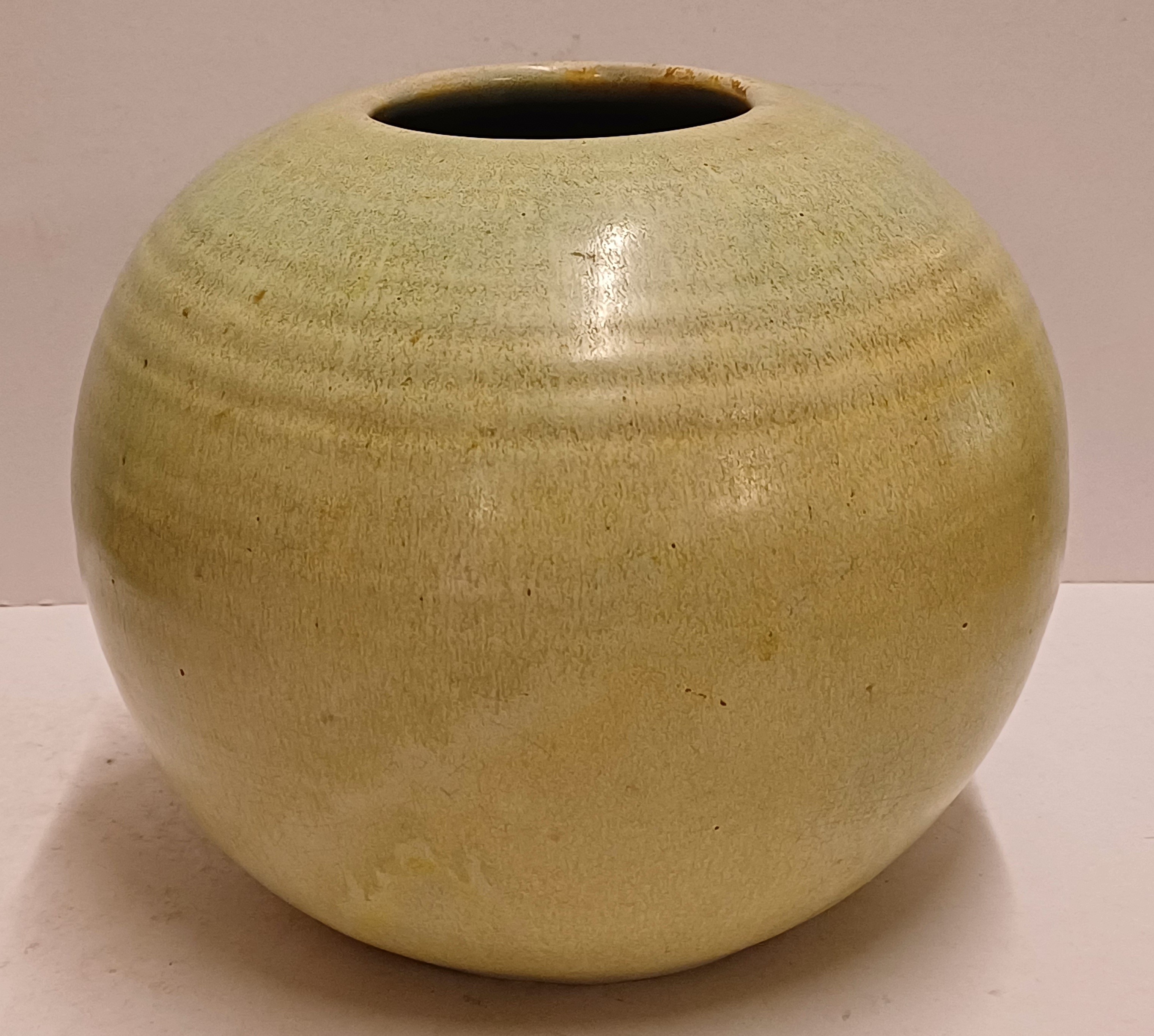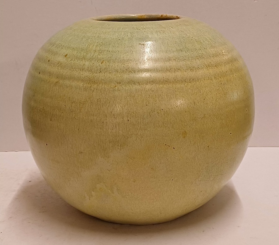 Bauchige Vase mit grüner Glasur und leichter Riffelung. Unterseite mit Fabrikmarke.